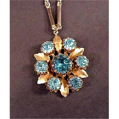 Unique Large Rhinestone Necklace Beautiful Jewelry:Costume Lovely vintage Rhinestone & gold tone metal necklace. This is a beauty! The color of these large multifaceted rhinestones are a beautiful unique Aqua Blue. The stones are hand set with prongs, in a flower motif. The petals are gold tone metal as is the matching original fancy chain which has a very pretty filigree clasp. The pendant portion of the necklace measures about 1 ¼ inches acroaa, the chain being about 17 inches in length. A beautiful unique looking vintage necklace to enjoy wearing or adding to one?s collection.