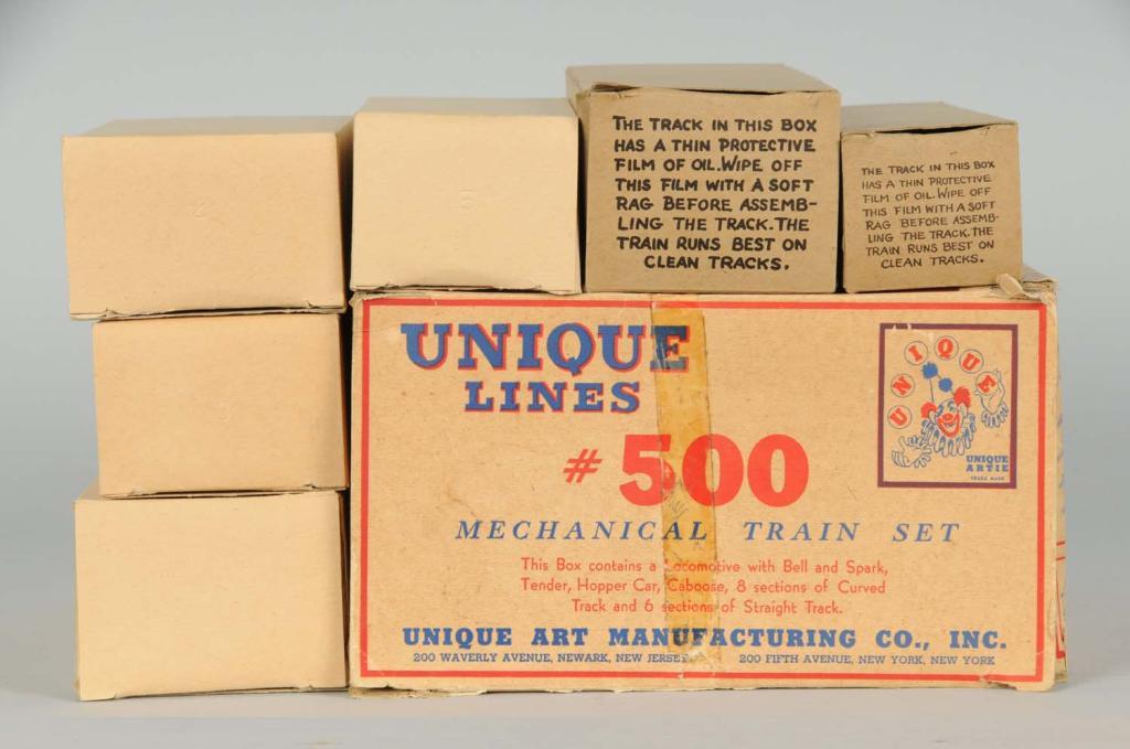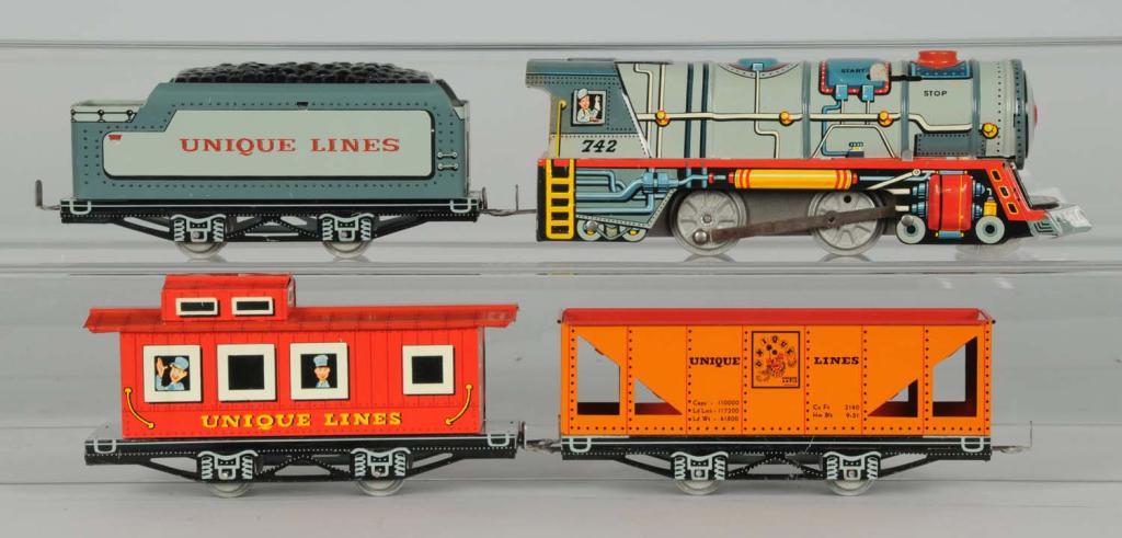 Post-war. Includes rare original set box and individual boxes. Set includes 742 lithographed and very colorful locomotive and Unique Lines tender with orange hopper and red caboose. Extremely difficult to find in this condition. Set is unplayed with and old store stock. Cars have original cylinder tubes for protection of couplers inside the boxes. Set has vibrant colors. Locomotive is clockwork and is working and has original key. All boxes are in excellent to excellent plus condition. Also includes two boxes of curved and straight track. Scarce and unusual set. Post-war Train