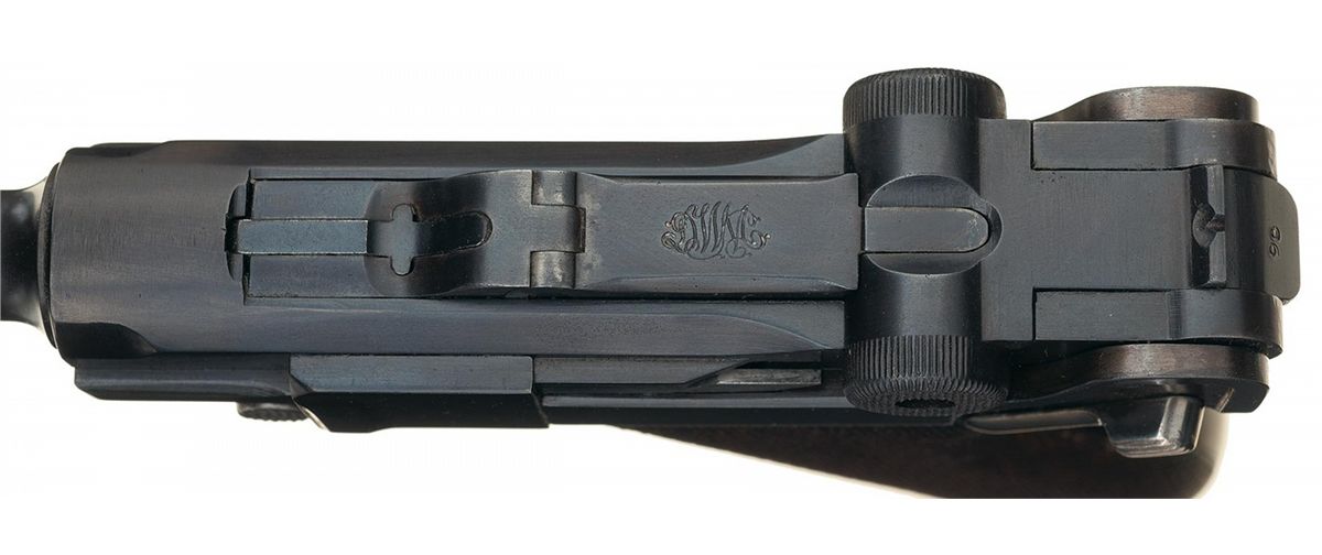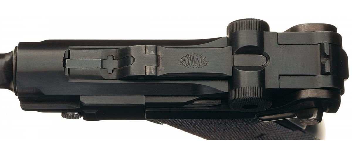 This is an example of Model 1906 Commercial pistol manufactured by DWM and subsequently reworked by a Berlin retailer. (A six inch barrel was installed in this process). This particular pistol has the retailer marking of "GENSCHOW & CO. BERLIN" on the right frame rail. This pistol also has the "GESICHERT" marking in the lower position of the safety. The left side of the barrel extension is marked with a crown over "B" and "U" commercial proof, the matching serial number is marked on the front of the frame and underside of the barrel at the breech, and the partial serial number "90" is marked on the takedown lever and rear of the rear toggle. Fixed sights, straw colored small parts, grip safety, unmarked plated magazine with wooden base and fitted with checkered walnut grips.