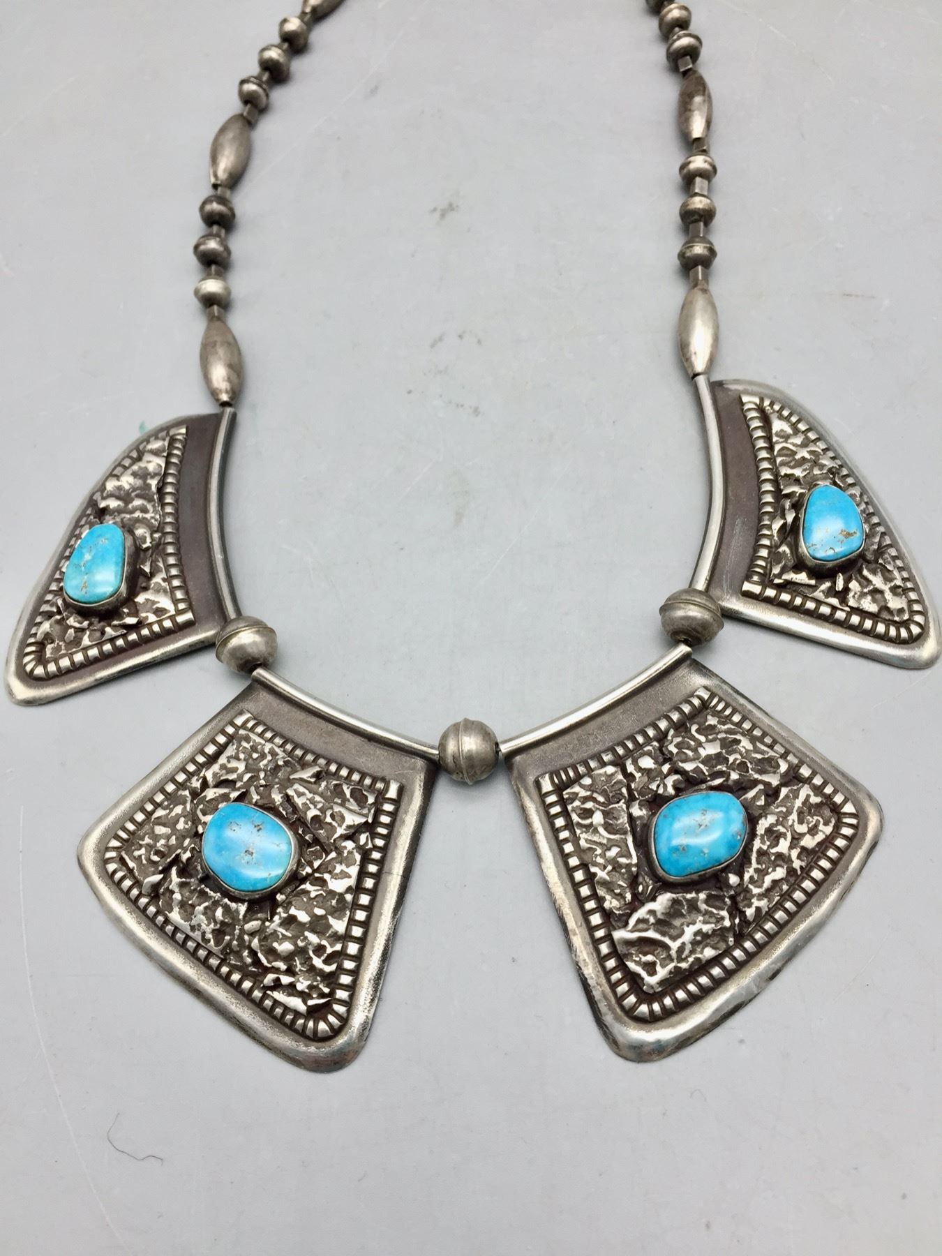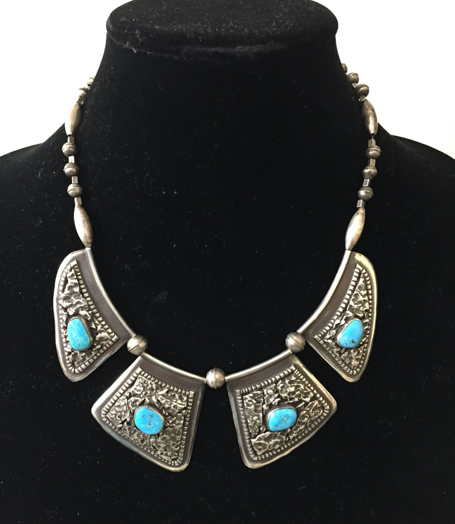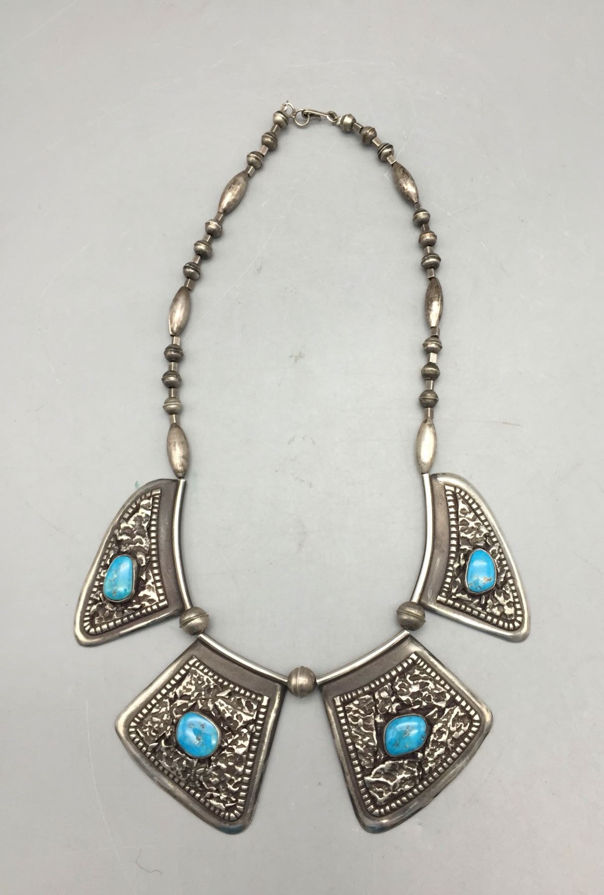 SOLD using the Buy it Now option! Description: For your enjoyment we offer this unique looking turquoise necklace. It has four tab like links with a unique textured look. There are turquoise stones accenting it and it is sterling silver. Maker: Hallmarked with an M. Approx. Age: Vintage. Size: Fits a 16†neck. Weighs 72.1 grams. Condition: Good for its age, normal wear expected. Please look closely at the pictures - they are an important part of our description. Shipping: There will be a $5 handling / packaging fee for shipping this lot. The actual cost of postage will be added on top of that.