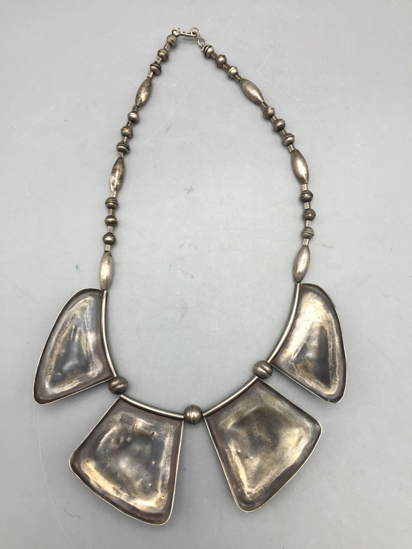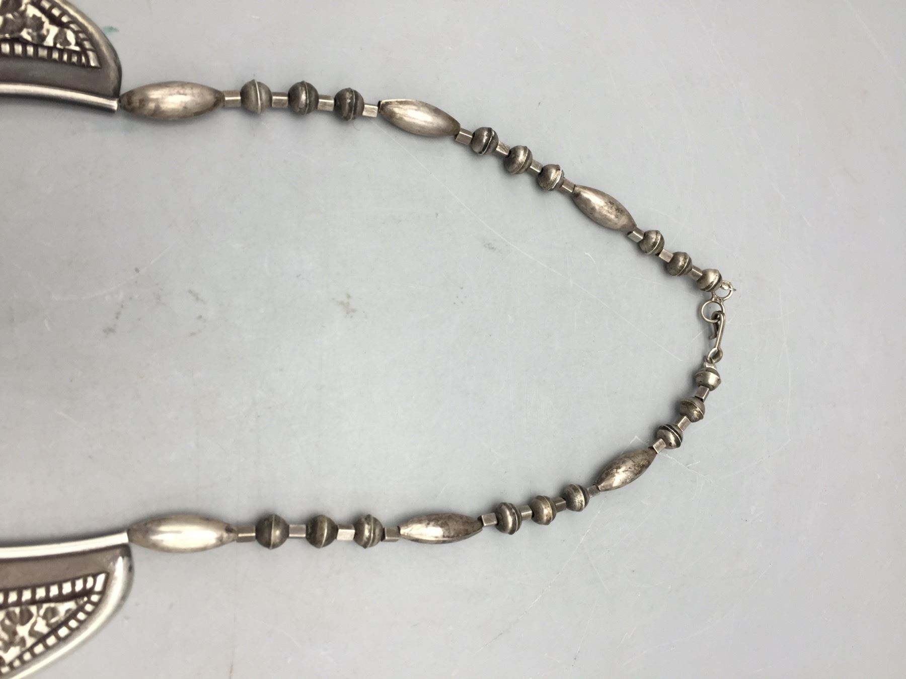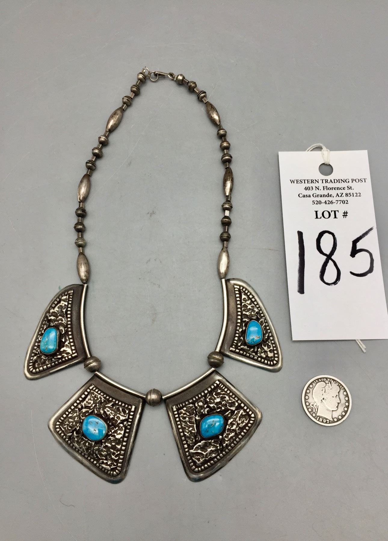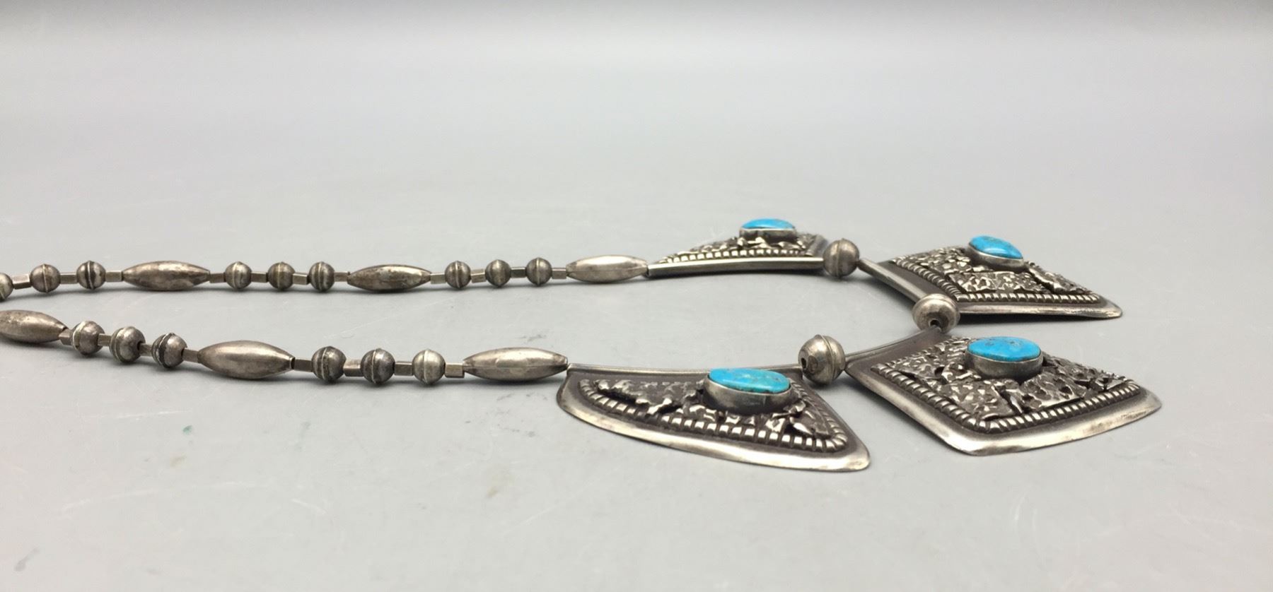 SOLD using the Buy it Now option! Description: For your enjoyment we offer this unique looking turquoise necklace. It has four tab like links with a unique textured look. There are turquoise stones accenting it and it is sterling silver. Maker: Hallmarked with an M. Approx. Age: Vintage. Size: Fits a 16†neck. Weighs 72.1 grams. Condition: Good for its age, normal wear expected. Please look closely at the pictures - they are an important part of our description. Shipping: There will be a $5 handling / packaging fee for shipping this lot. The actual cost of postage will be added on top of that.