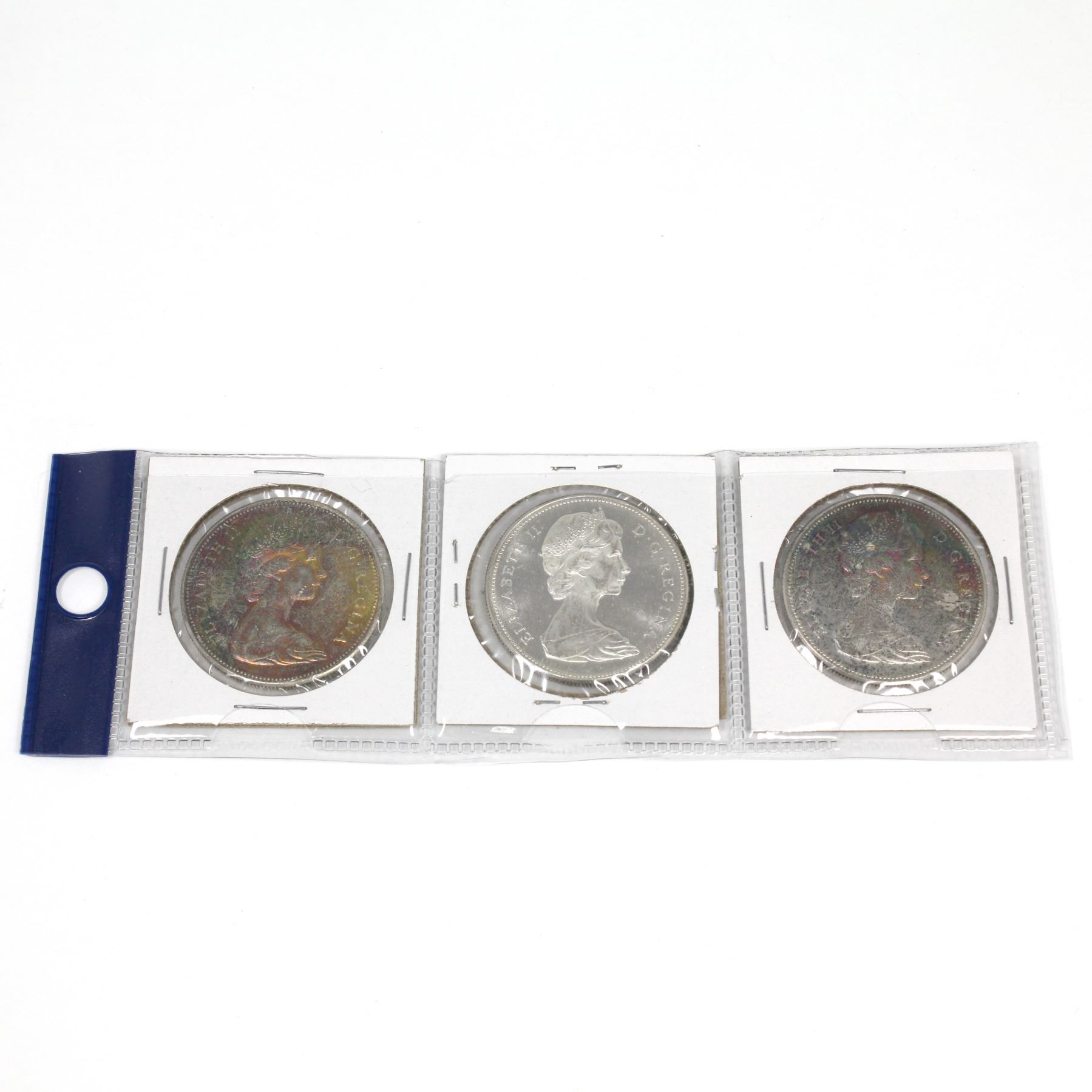 Unique Lot of 1967 Canada Silver Dollars with Rainbow Toning on One Side and Mostly White on the Other. 3pcs