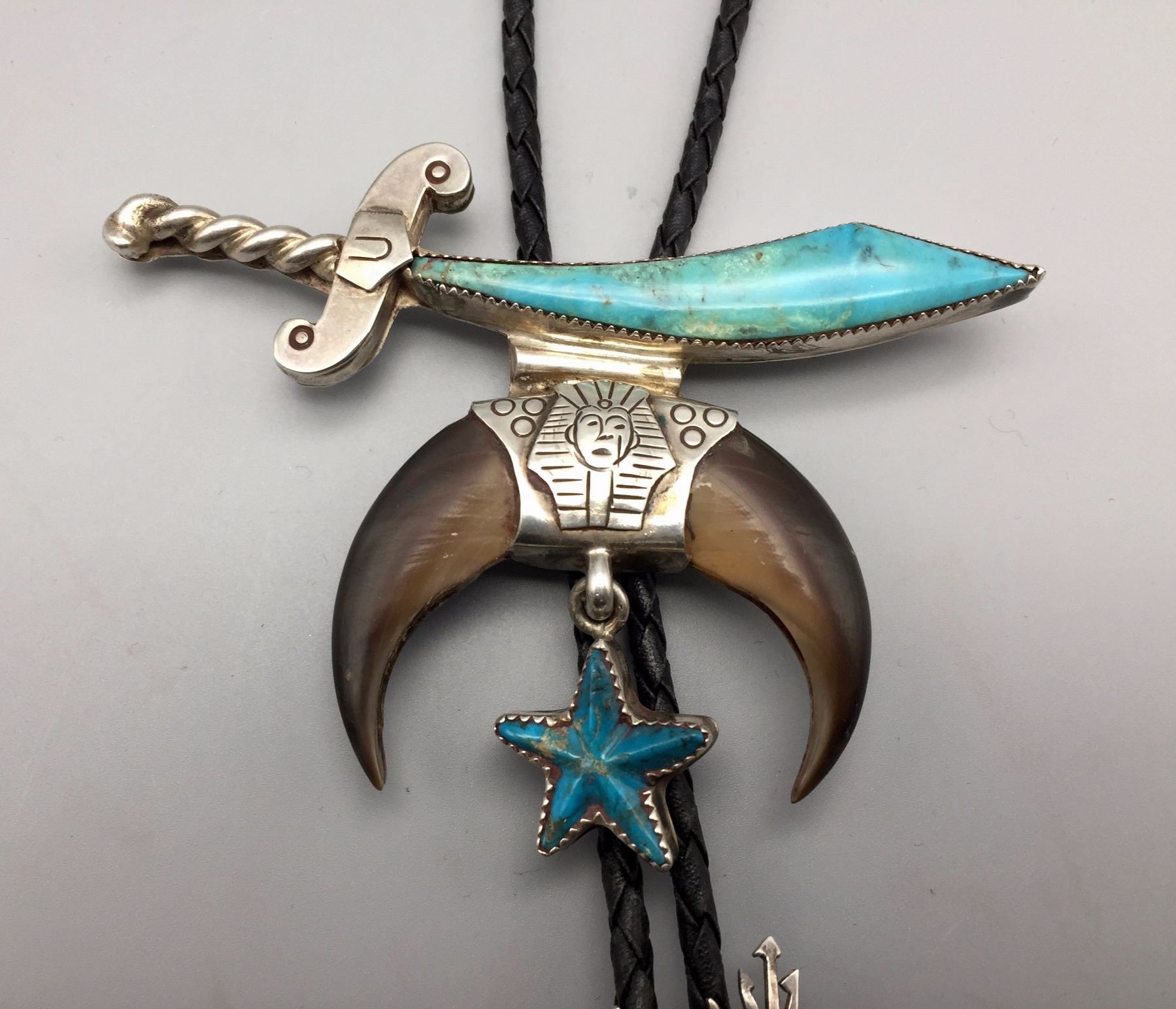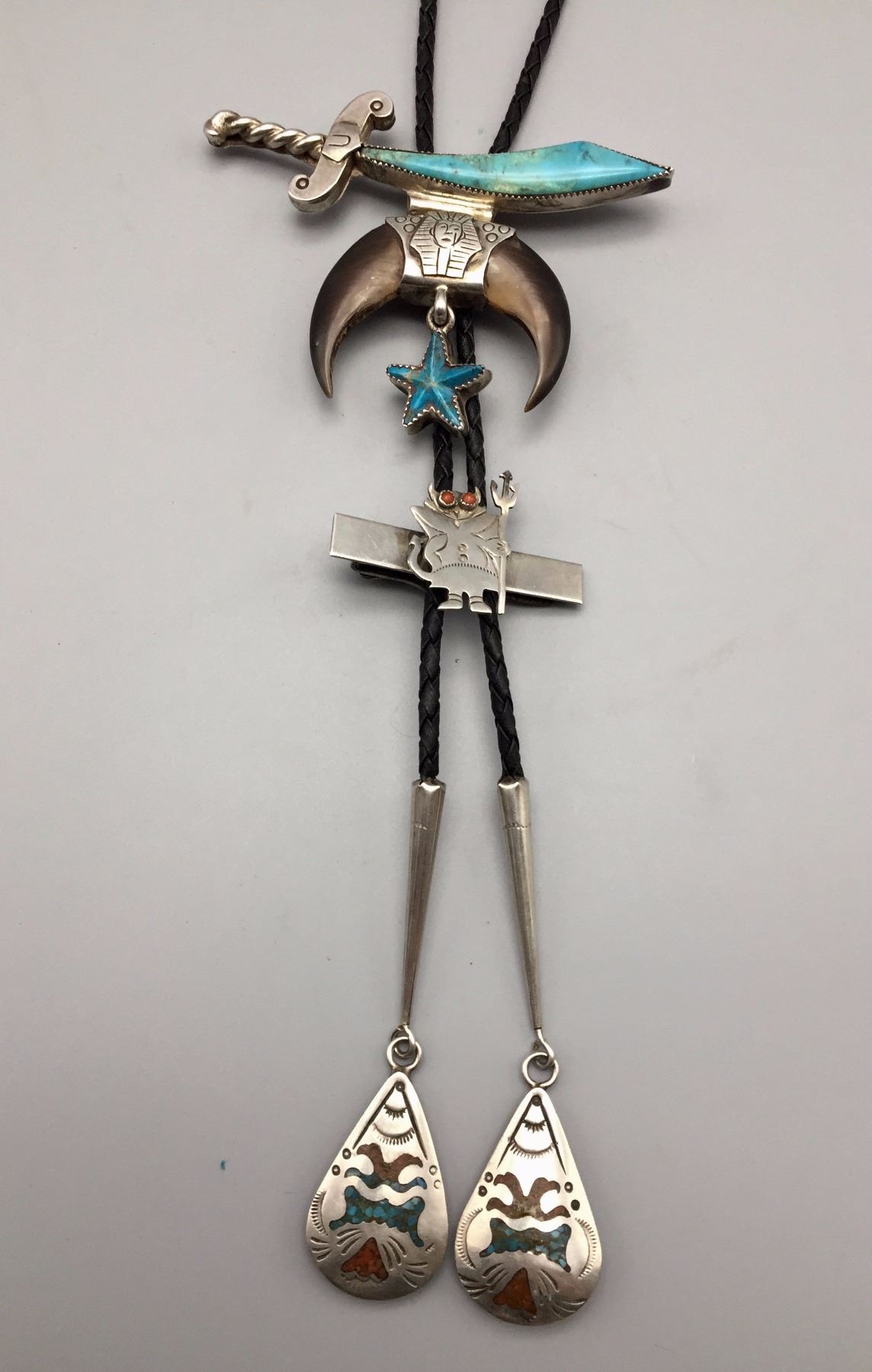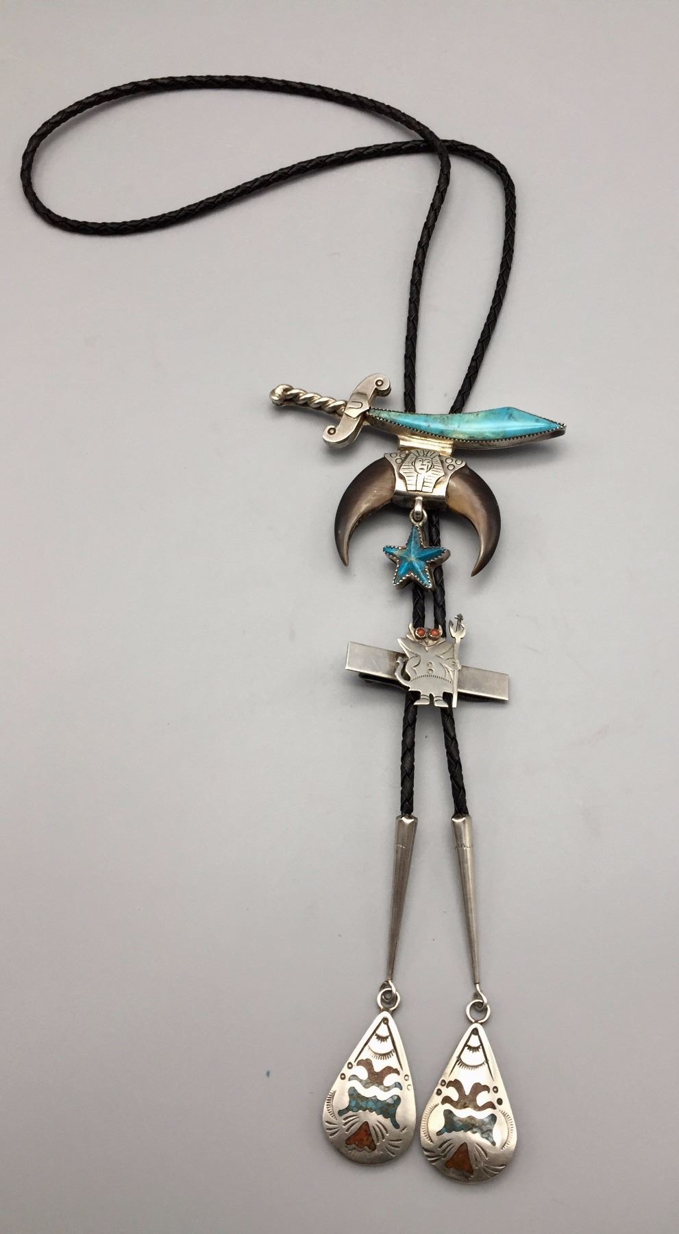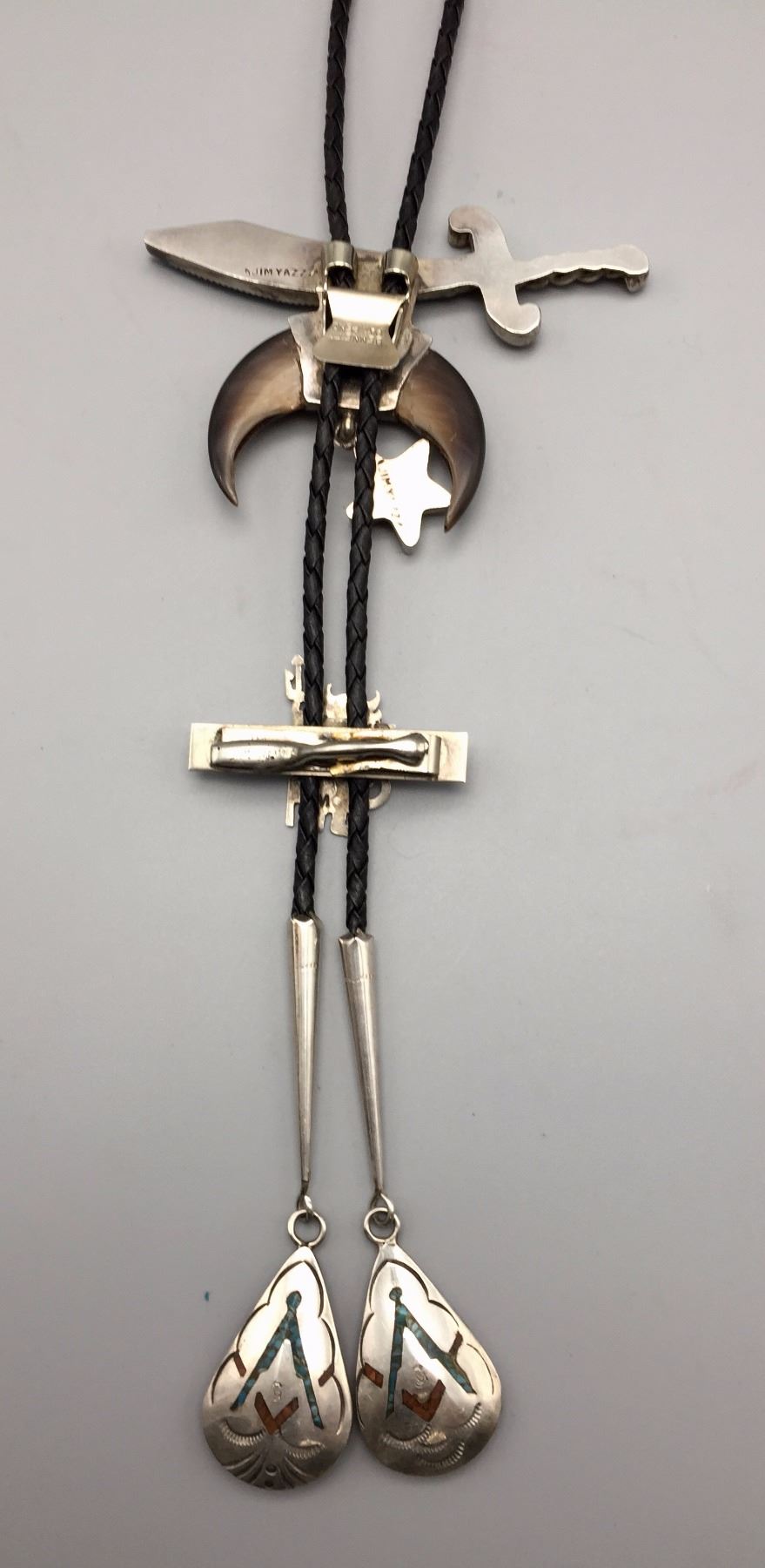Maker: Hallmarked JIM YAZZ (Jim Yazzie, Navajo?). Approx. Age: Vintage. Size: Slide is 4” at it’s widest and about 3” long on a 36” braided black cord. Condition: Good for it’s age, normal wear expected. Additional Info: Unique Masonic Themed Bolo Tie with sterling tips and a tie clasp built onto it. Please look closely at the pictures - they are an important part of our description. Shipping: There will be a $5 handling / packaging fee for shipping this lot. The actual cost of postage will be added on top of that.
