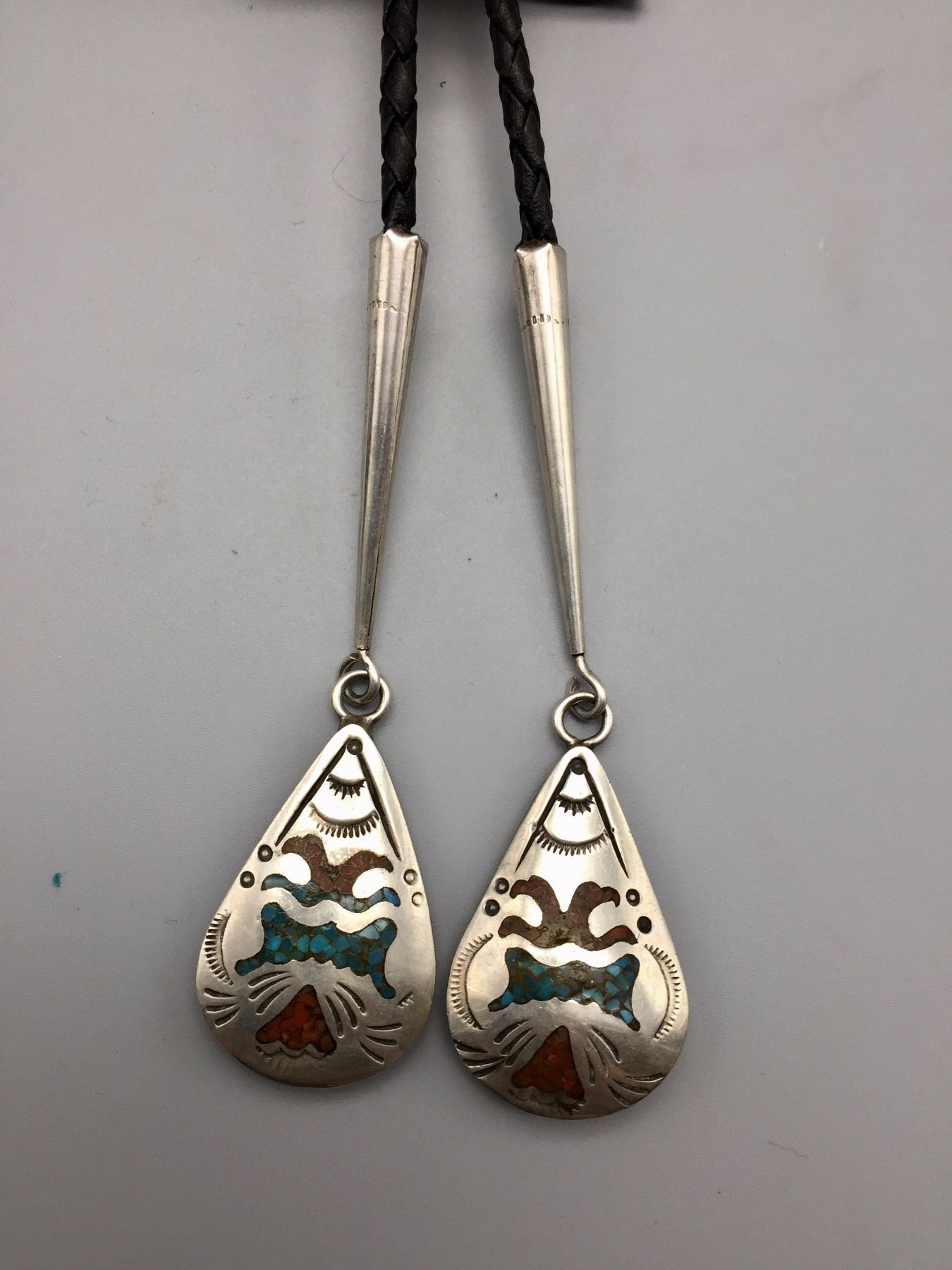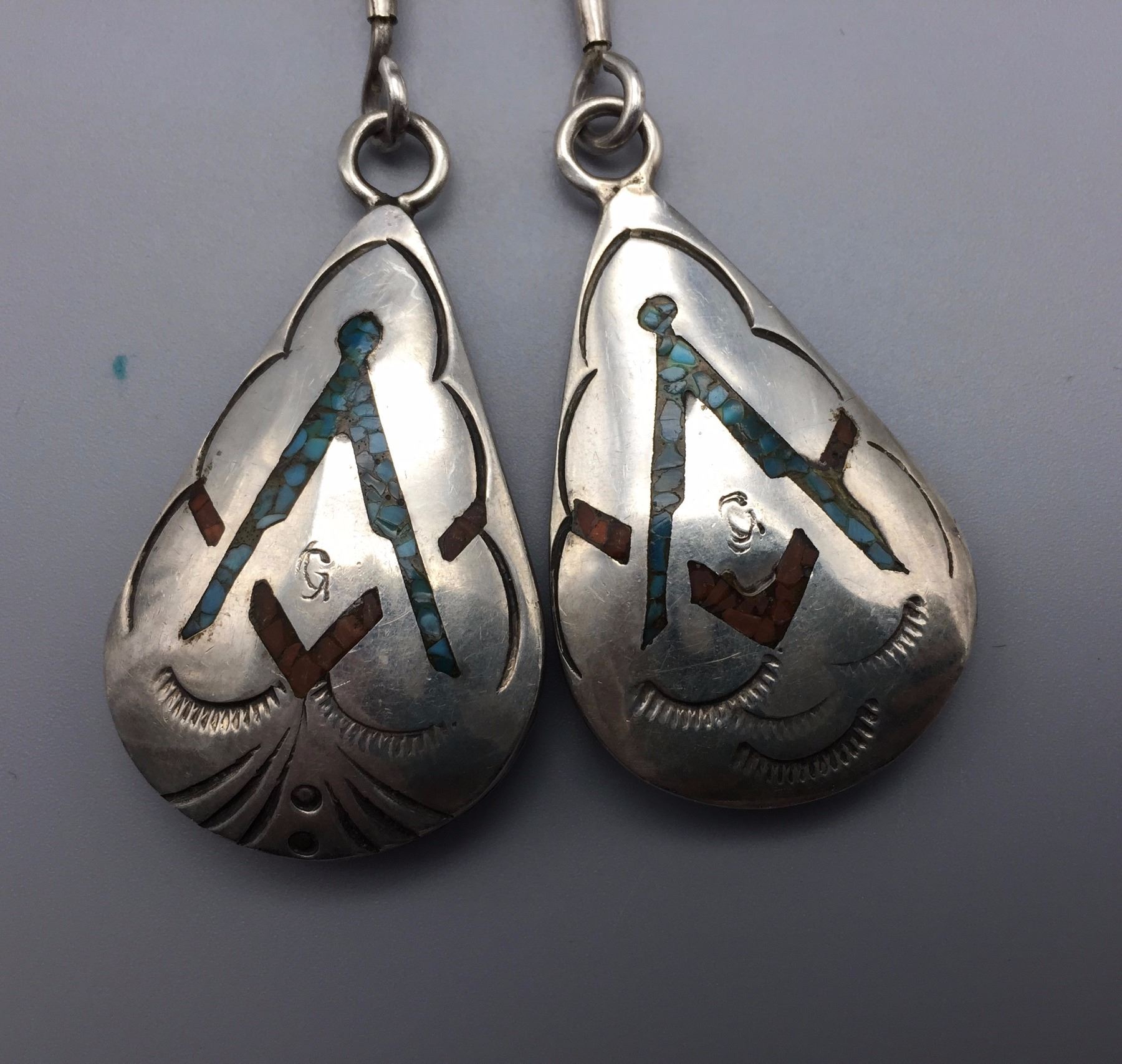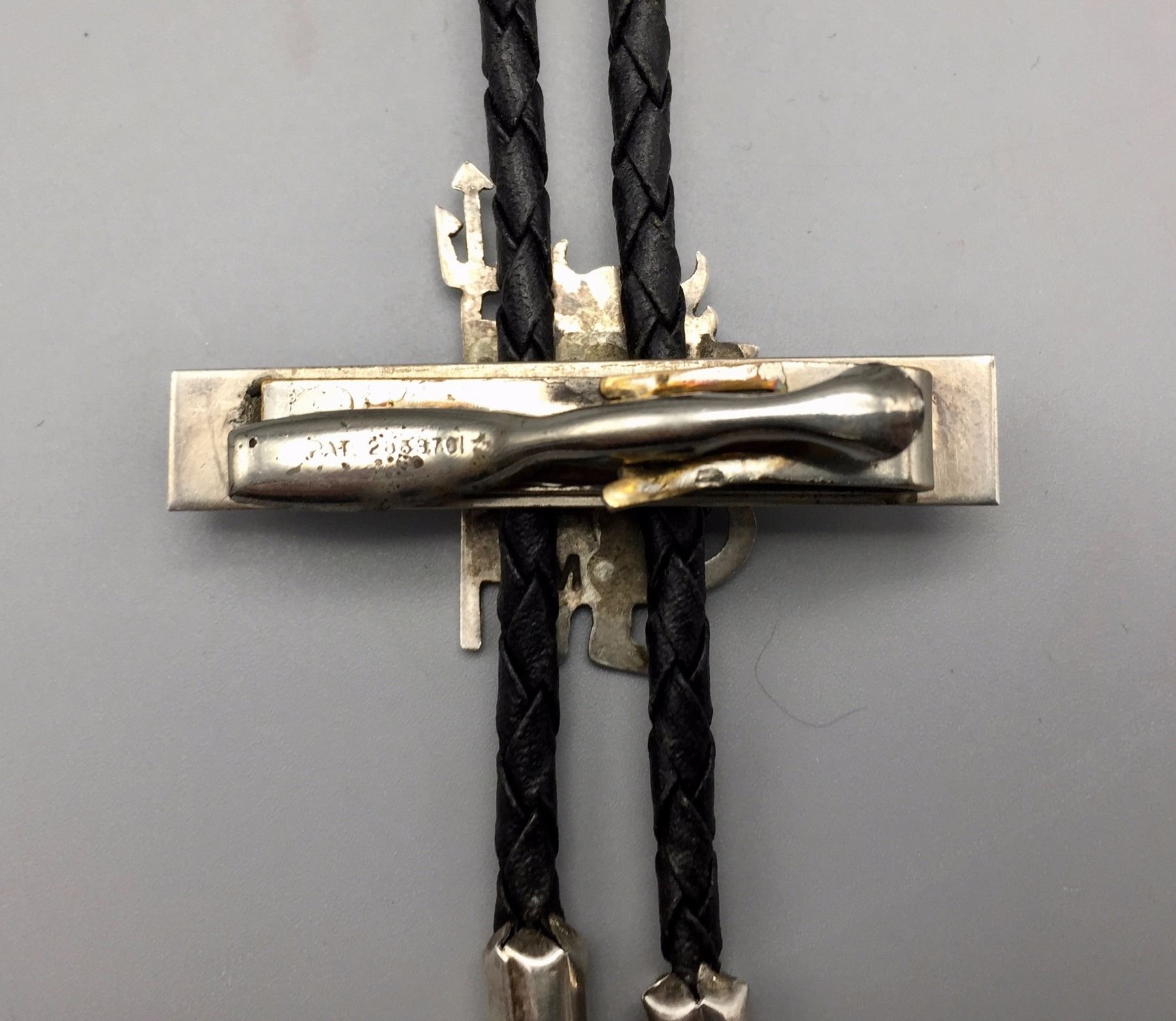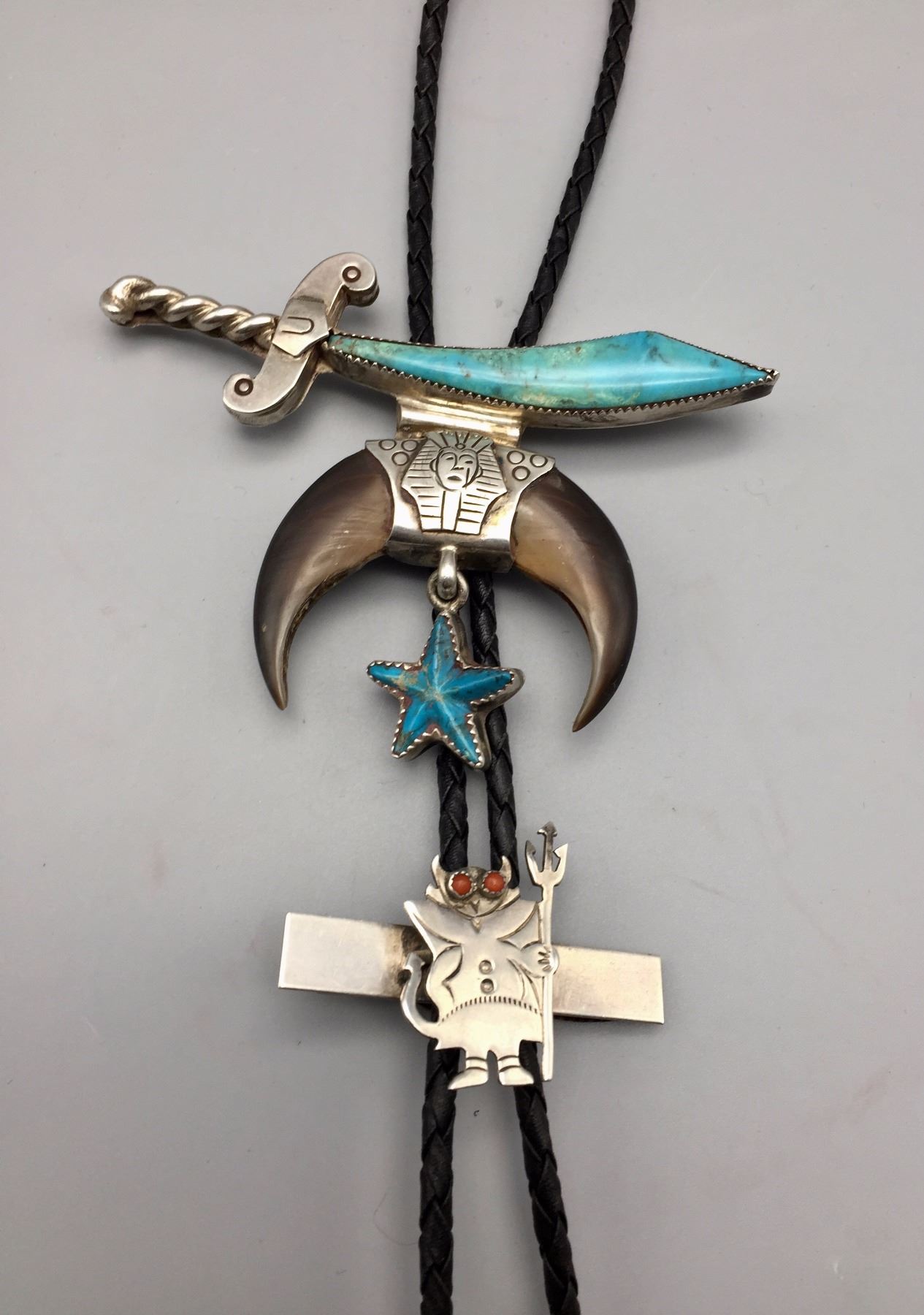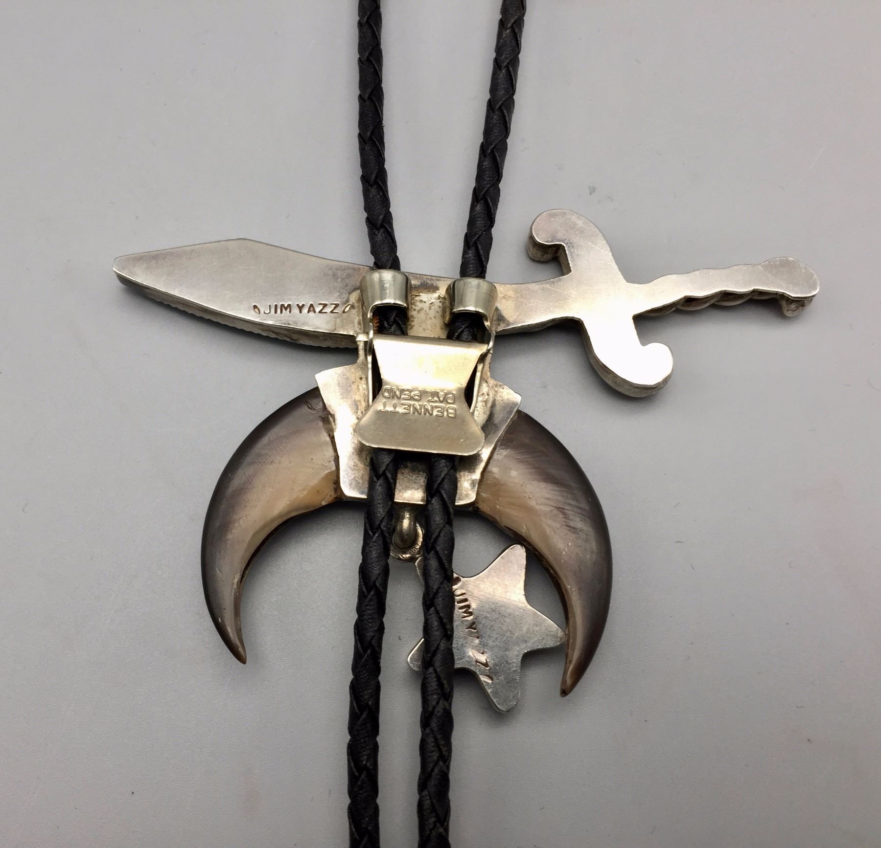 Maker: Hallmarked JIM YAZZ (Jim Yazzie, Navajo?). Approx. Age: Vintage. Size: Slide is 4” at it’s widest and about 3” long on a 36” braided black cord. Condition: Good for it’s age, normal wear expected. Additional Info: Unique Masonic Themed Bolo Tie with sterling tips and a tie clasp built onto it. Please look closely at the pictures - they are an important part of our description. Shipping: There will be a $5 handling / packaging fee for shipping this lot. The actual cost of postage will be added on top of that.