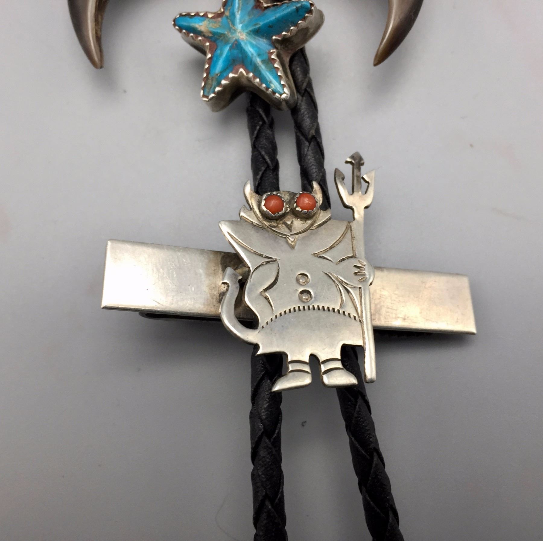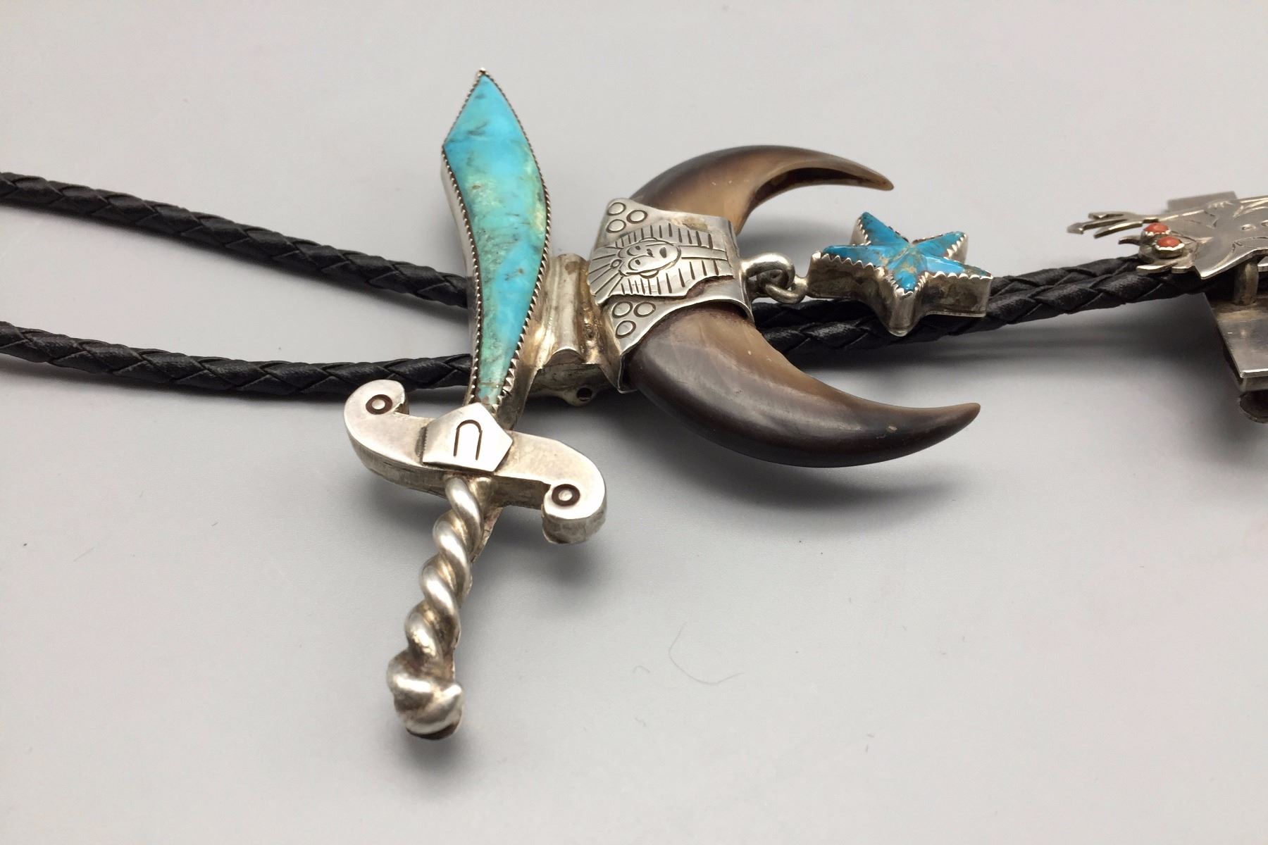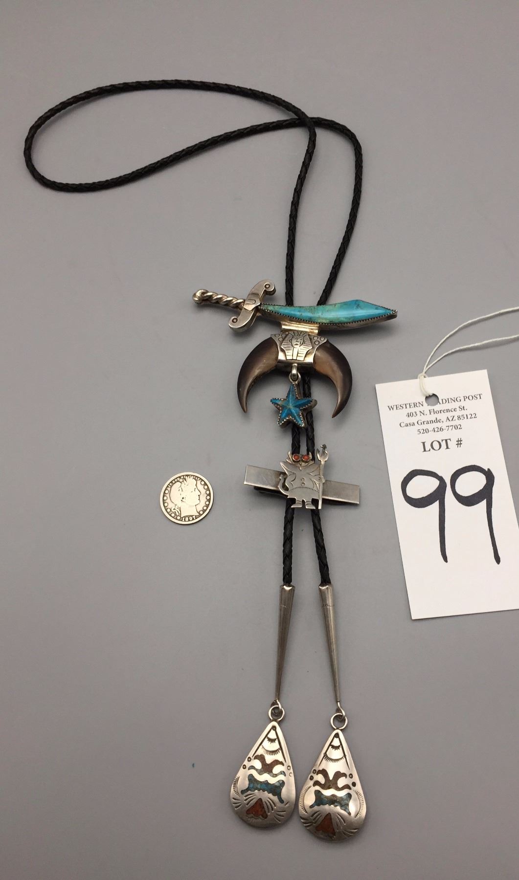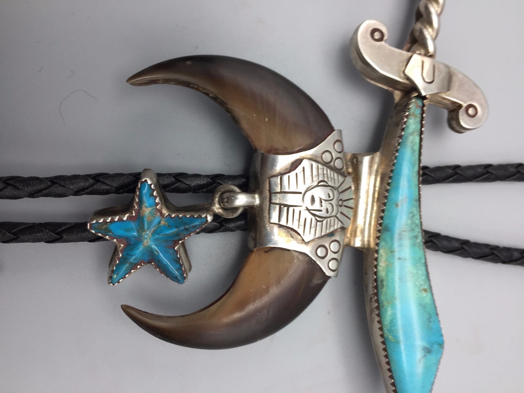 Maker: Hallmarked JIM YAZZ (Jim Yazzie, Navajo?). Approx. Age: Vintage. Size: Slide is 4” at it’s widest and about 3” long on a 36” braided black cord. Condition: Good for it’s age, normal wear expected. Additional Info: Unique Masonic Themed Bolo Tie with sterling tips and a tie clasp built onto it. Please look closely at the pictures - they are an important part of our description. Shipping: There will be a $5 handling / packaging fee for shipping this lot. The actual cost of postage will be added on top of that.