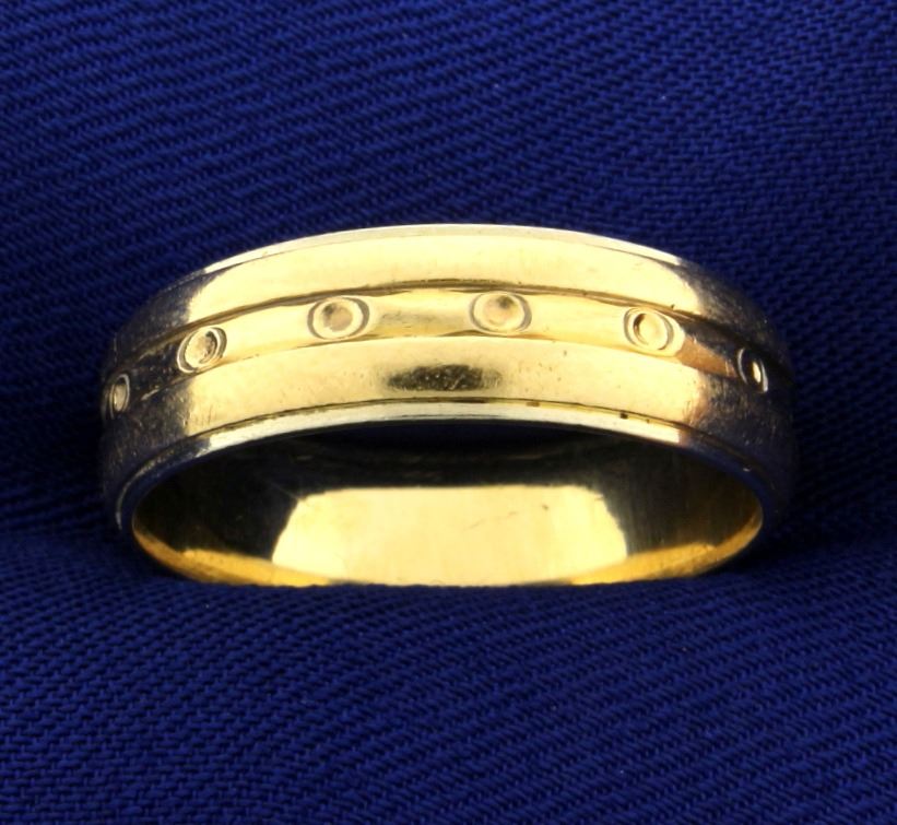 In 14k yellow gold with a unique design. Size 11 1/2. 6.6mm wide. 6.3g.