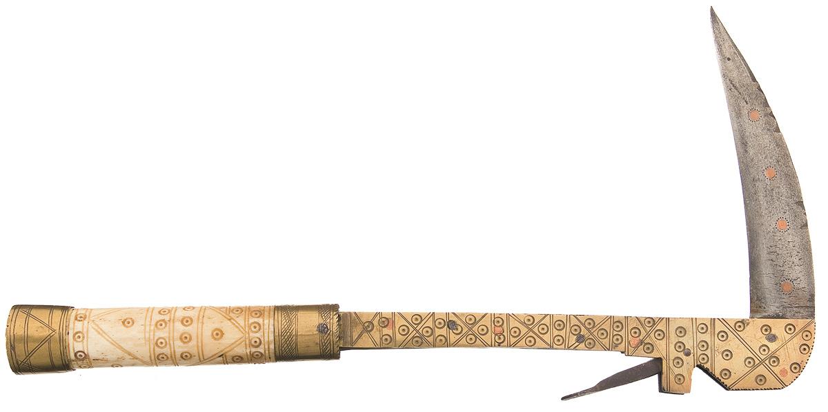 Starting life as a farm implement, the kama was adopted as a weapon by practitioners of Karate, Silat, and some Chinese forms. The shaft measures 13 1/2" long, with the blade 5 1/2" in length, single edged with filework on the spine and bronze dot inlays with punch dot accents. Hinged at the top of the shaft, the blade is locked in place by a spring loaded catch on the rear of the shaft, which has engraved brass accent plates on the sides. Grip section is bone, with dot and geometric line engraving and engraved brass collars. OAL: 13 1/2"