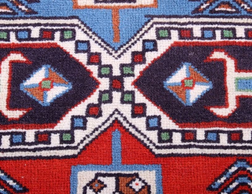 Featured in this lot is a beautiful Persian rug, circa 1940's-50's, from the Qashqai region. The majority of Qashqai people were originally nomadic pastoralists and some remain so today. The traditional nomadic Qashqai of Iran travelled with their flocks twice yearly to and from the summer highland pastures north of Shiraz roughly 480 km or 300 miles south to the winter pastures on lower (and warmer) lands near the Persian Gulf, to the southwest of Shiraz. The Qashqai are renowned for their pile carpets and other woven wool products. They are sometimes referred to as "Shiraz" because Shiraz was the major marketplace for them in the past. The wool produced in the mountains and valleys near Shiraz is exceptionally soft and beautiful and takes a deeper color than wool from other parts of Iran. This particular rug features a conglomeration of tribal motifs in a unique red and blue color scheme. It is in very good condition and measures 77" x 46"; would be praised at $4000-5000 in a gallery setting.