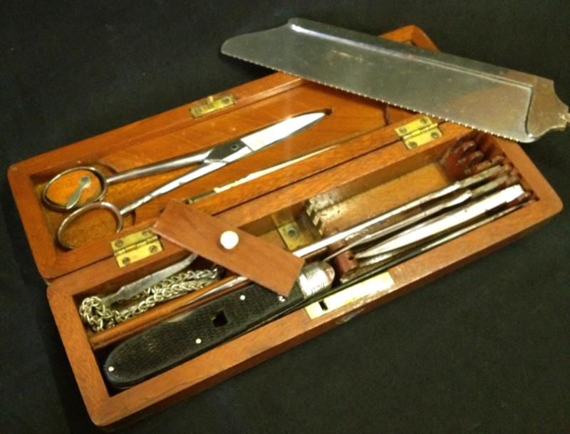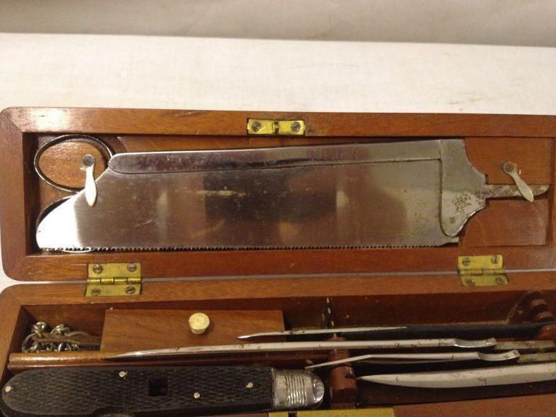A Rare Cased MIlitary Surgeons Kit with Set Of Amputation Instruments In A Fitted Mahogany Case Named To Doctor J.S.Bell,Contents To Include saw, Scissors, Knife, Etc.