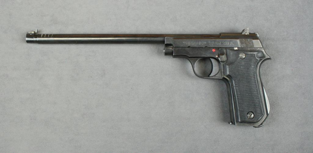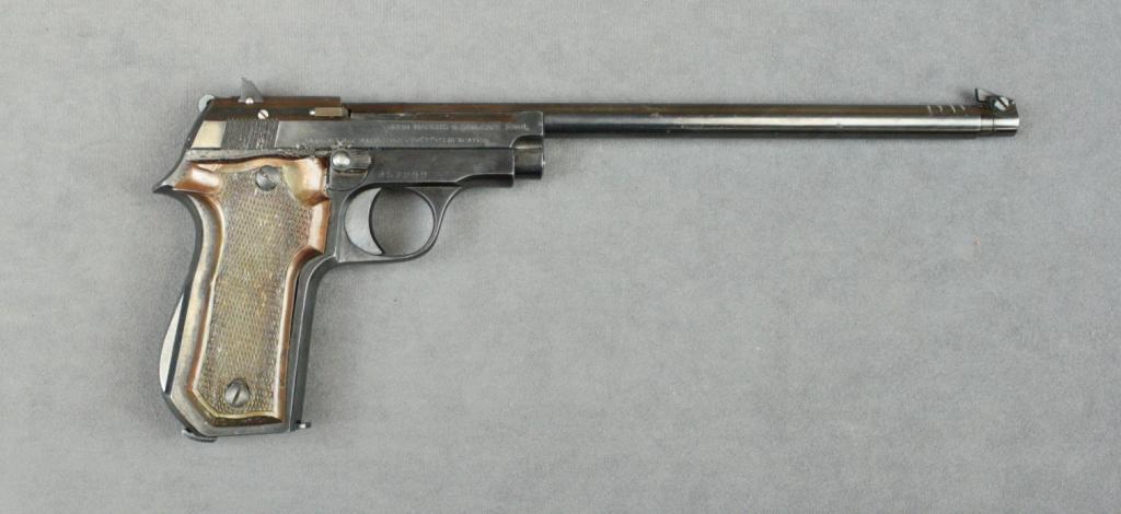 Unique Model 51 semi-auto pistol, .22LR cal., 9-1/2” target barrel with ported muzzle, blue finish, checkered grips, #457299. This gun is accompanied by a lined and compartmentalized presentation box for thegun, cleaning rods, extra magazine (present), brown plastic cleaning kit container (present) and two compartments for ammo boxes (no boxes included). The gun is in overall fine condition showing the majority of itsoriginal finish, fine bore, action and markings; the slide is also agent marked “John Marcus and Son, Cape Town”; the original grips have been damaged and broken but are present and there are a second set of checkered black composite grips included in this lot; original instructions also in the case. Est.: $400-$800.