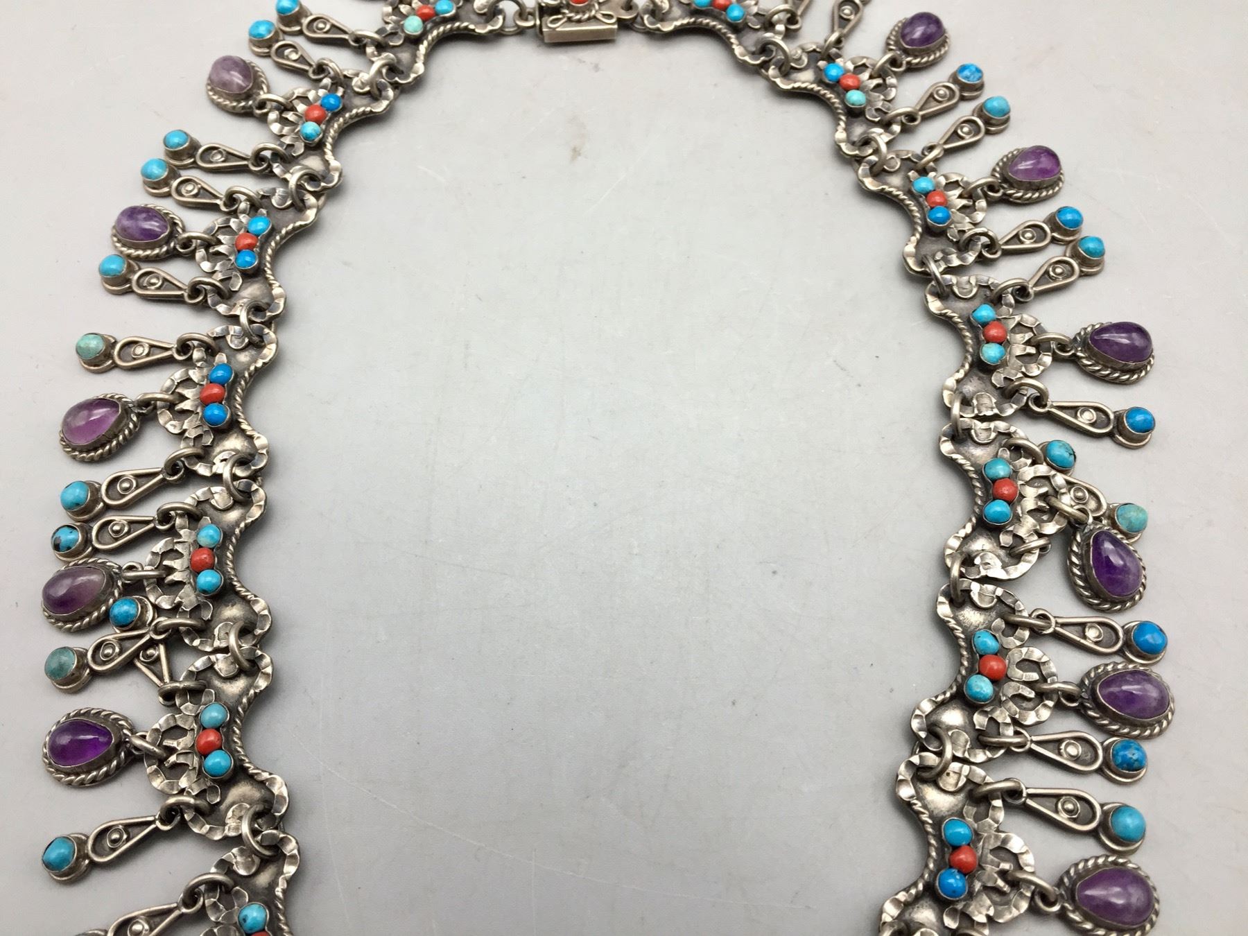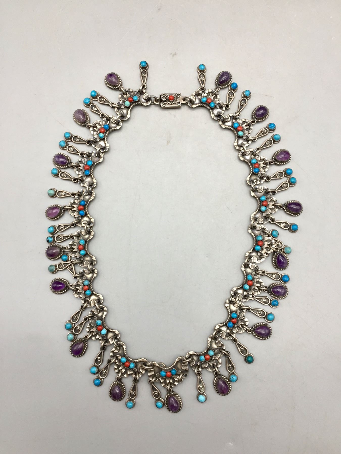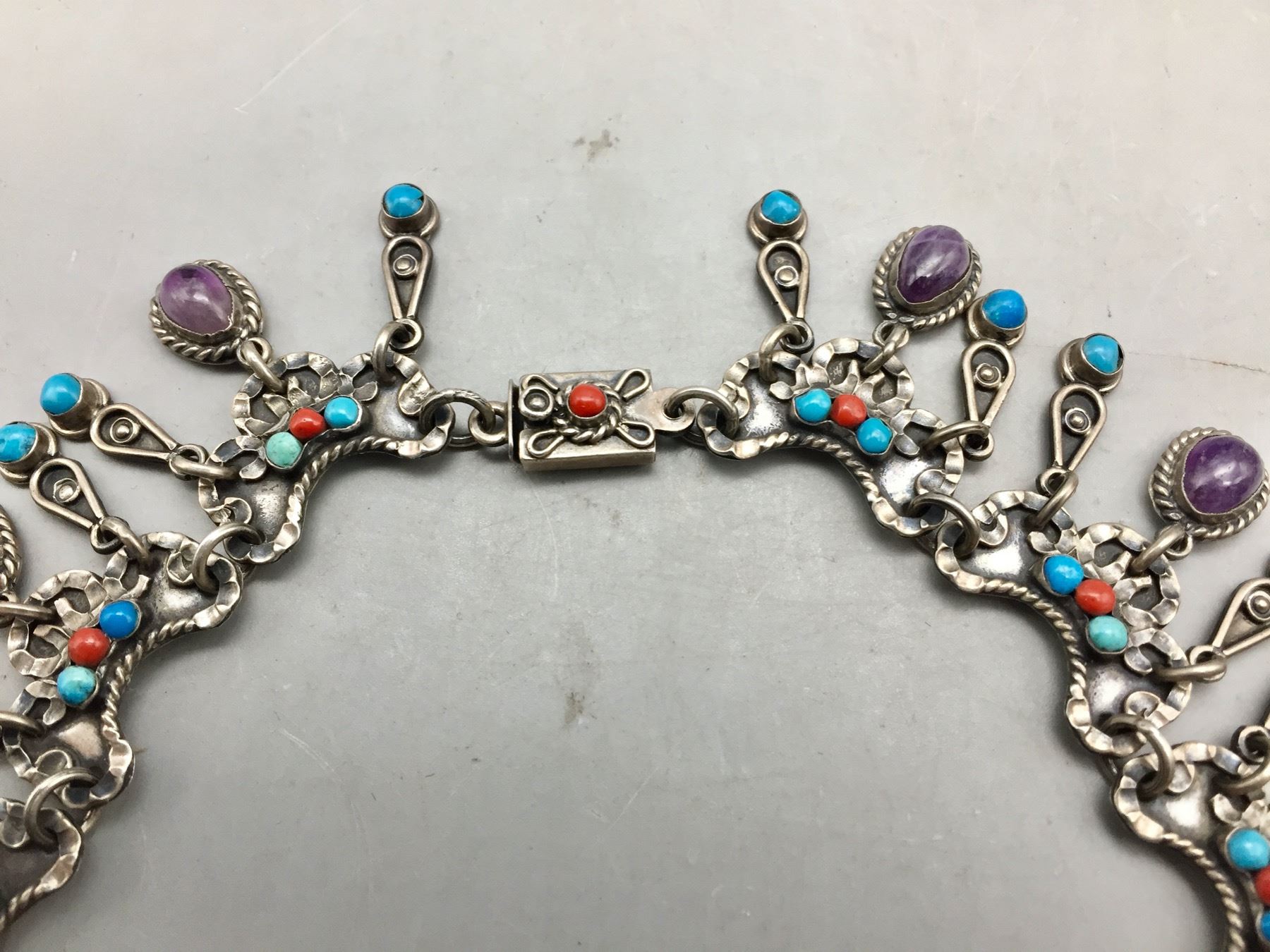 Description: For sale in this in this lot is a gorgeous multi stone necklace. It is set with turquoise coral, and amethyst. A very eye catching piece! Stamped as Sterling silver. Maker: Has a Mexican Hallmark which appears to be MM-34. Approx. Age: Vintage to modern. Size: Fits a 17“ neck. Weighs 112.5 grams. Condition: Good for its age, normal wear expected. Please look closely at the pictures - they are an important part of our description. Shipping: There will be a $5 handling / packaging fee for shipping this lot. The actual cost of postage will be added on top of that.