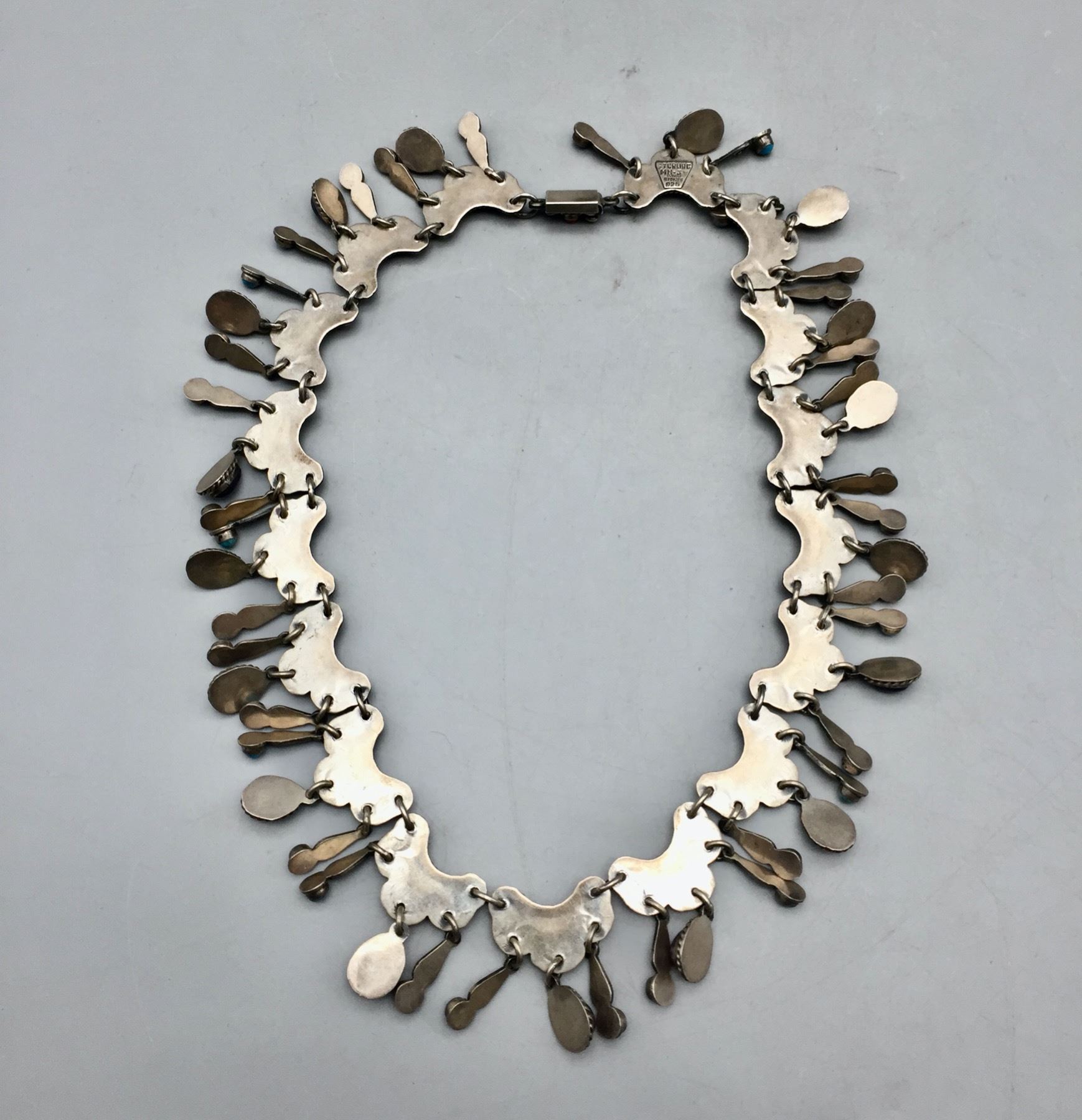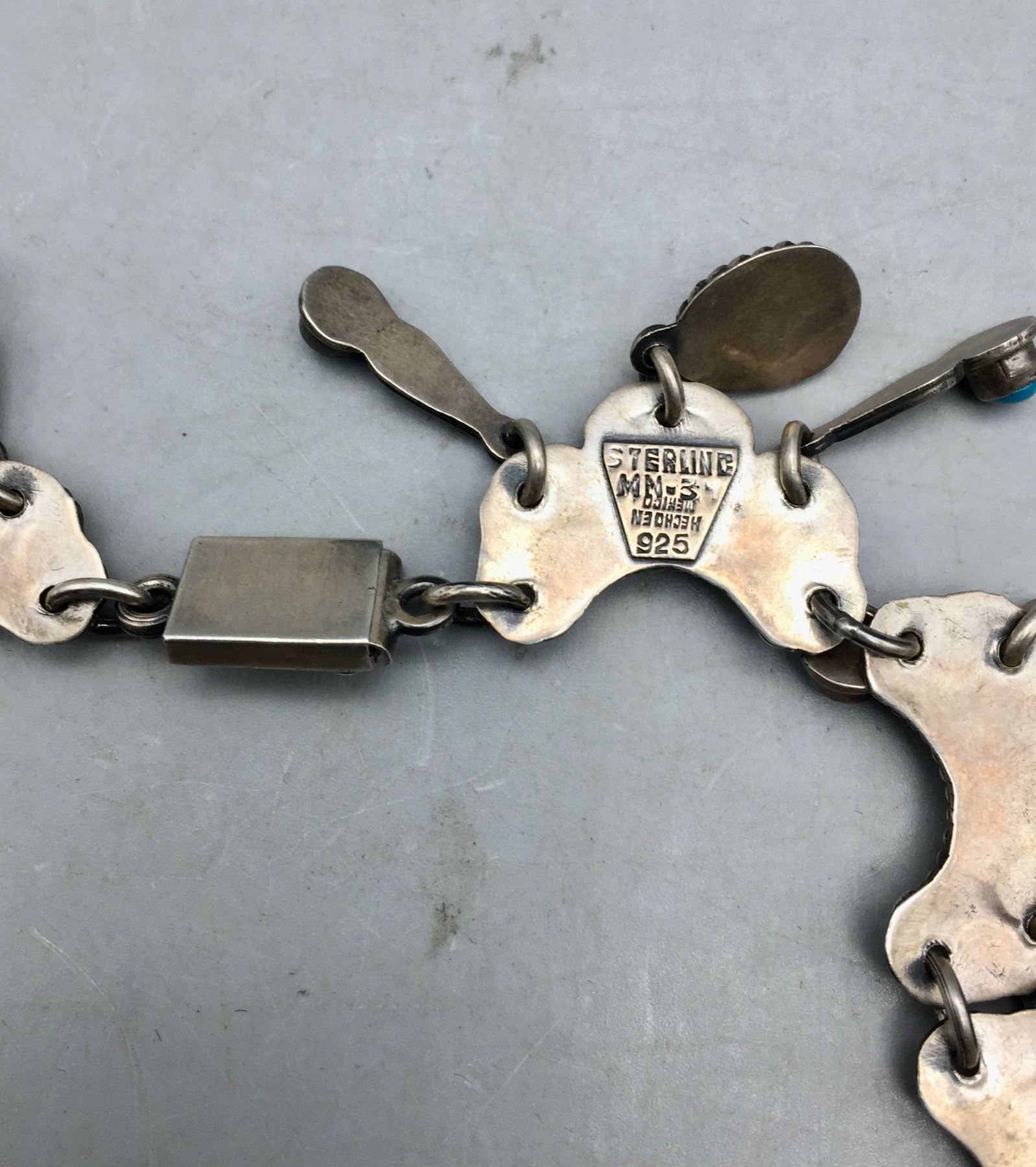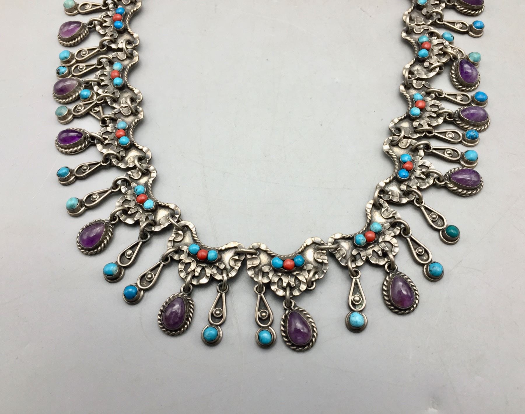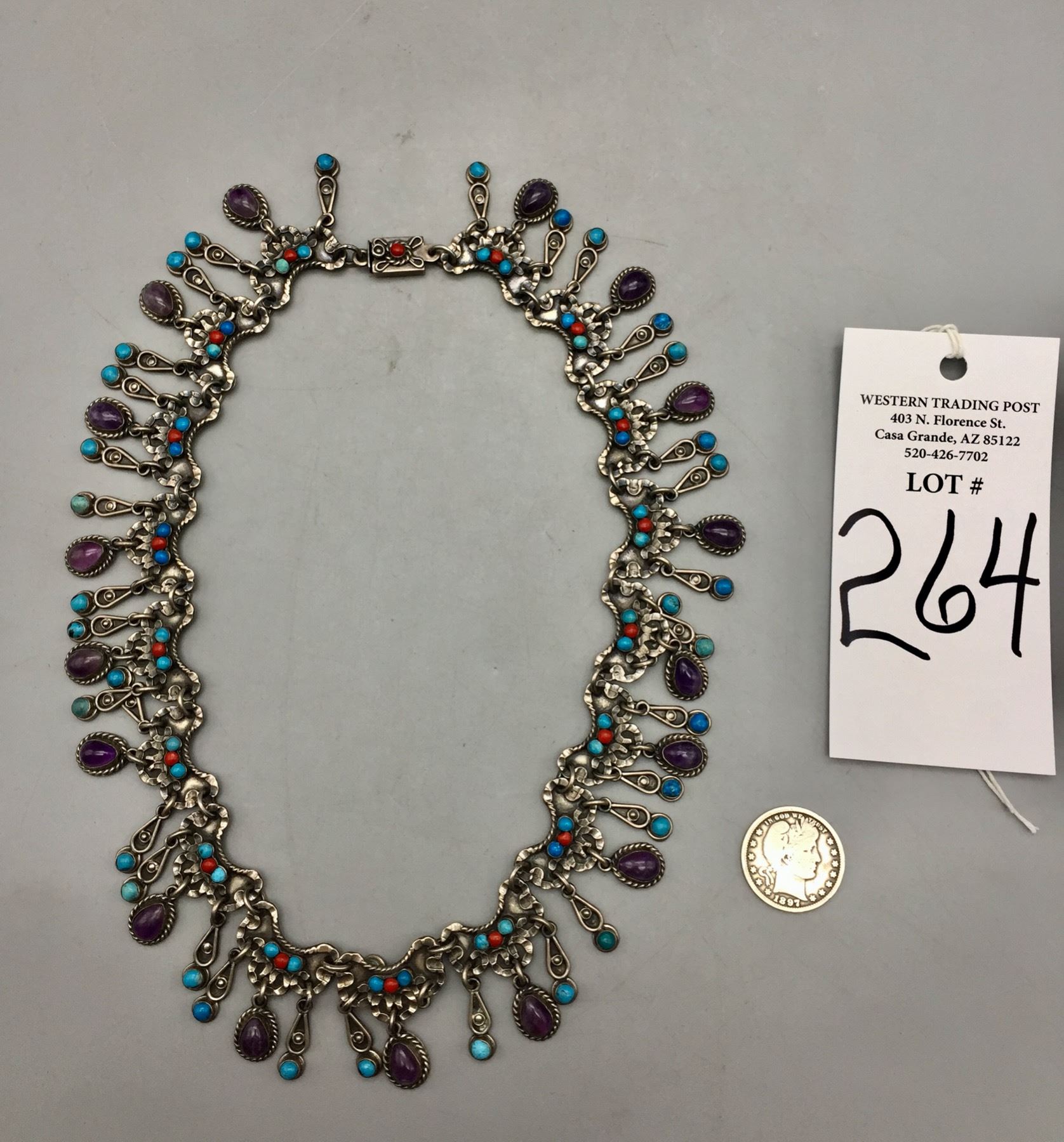 Description: For sale in this in this lot is a gorgeous multi stone necklace. It is set with turquoise coral, and amethyst. A very eye catching piece! Stamped as Sterling silver. Maker: Has a Mexican Hallmark which appears to be MM-34. Approx. Age: Vintage to modern. Size: Fits a 17“ neck. Weighs 112.5 grams. Condition: Good for its age, normal wear expected. Please look closely at the pictures - they are an important part of our description. Shipping: There will be a $5 handling / packaging fee for shipping this lot. The actual cost of postage will be added on top of that.