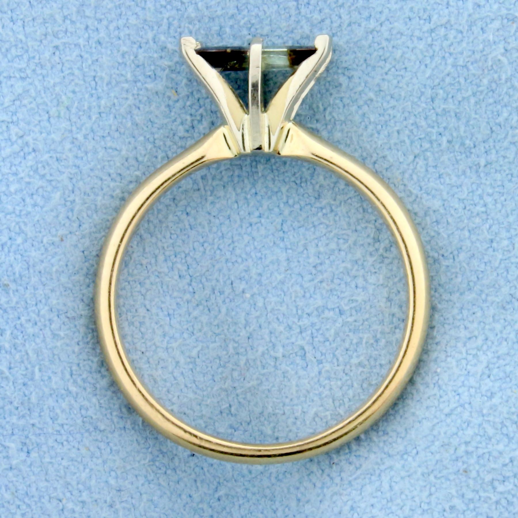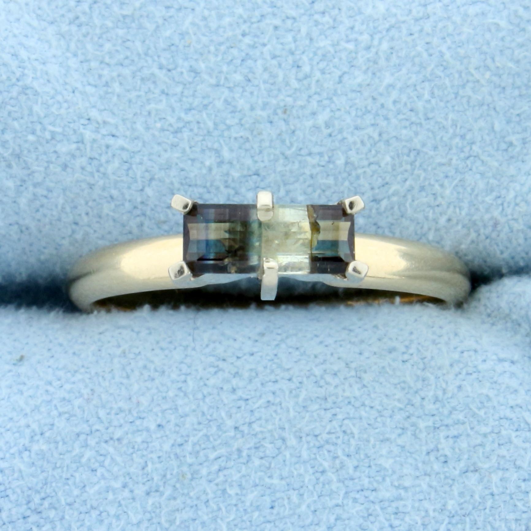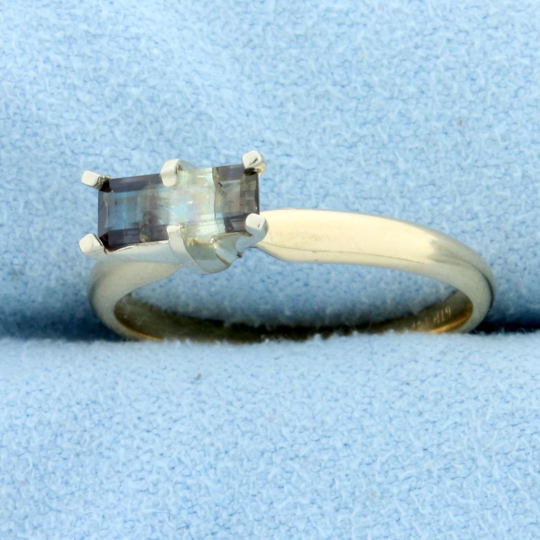 In 14K Yellow Gold. Contains a 8 x 3.3mm high quality natural Alexandrite gemstone with banded color that changes from green to purple depending on light. Size 7 1/2. 2.7g.
