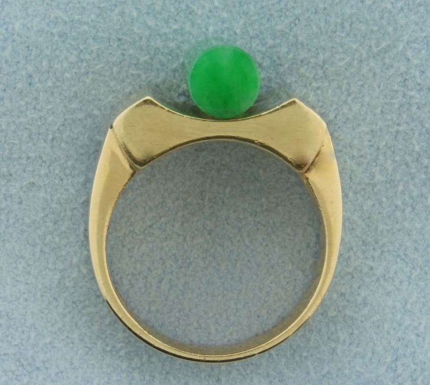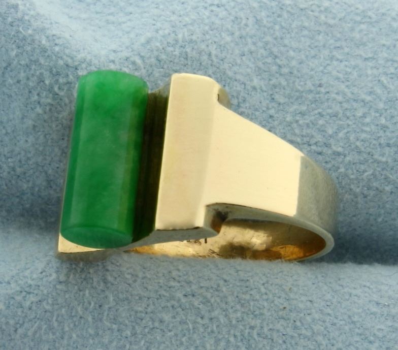 In 14k yellow gold. Contains a 13mm long cylinder shaped natural jade gemstone with bright green color. Size 6 1/4. 11.2g.