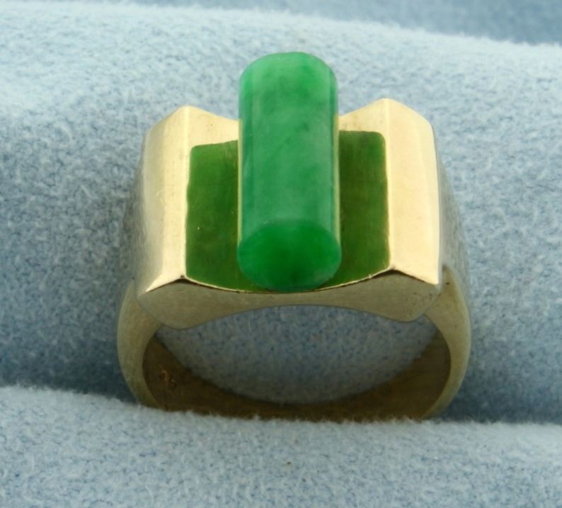 In 14k yellow gold. Contains a 13mm long cylinder shaped natural jade gemstone with bright green color. Size 6 1/4. 11.2g.