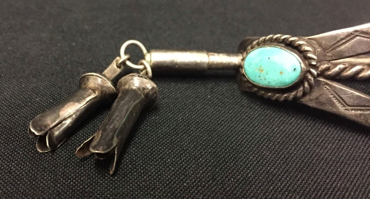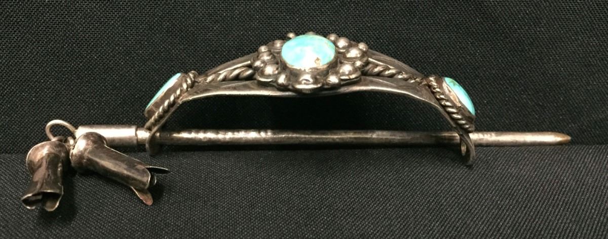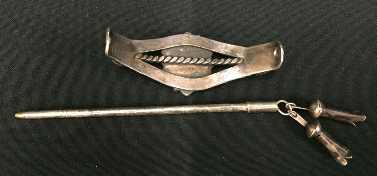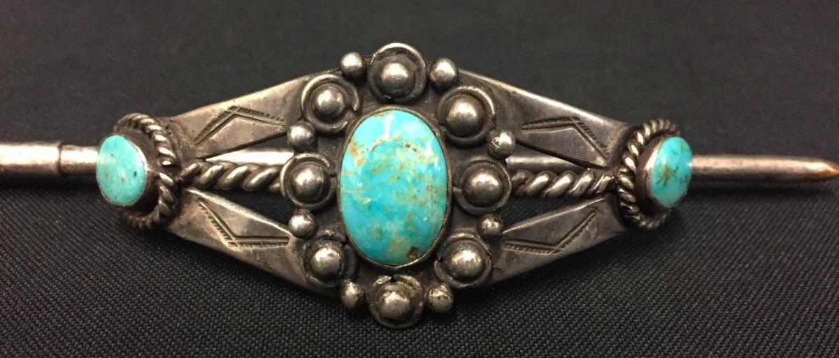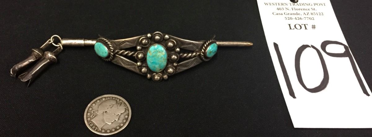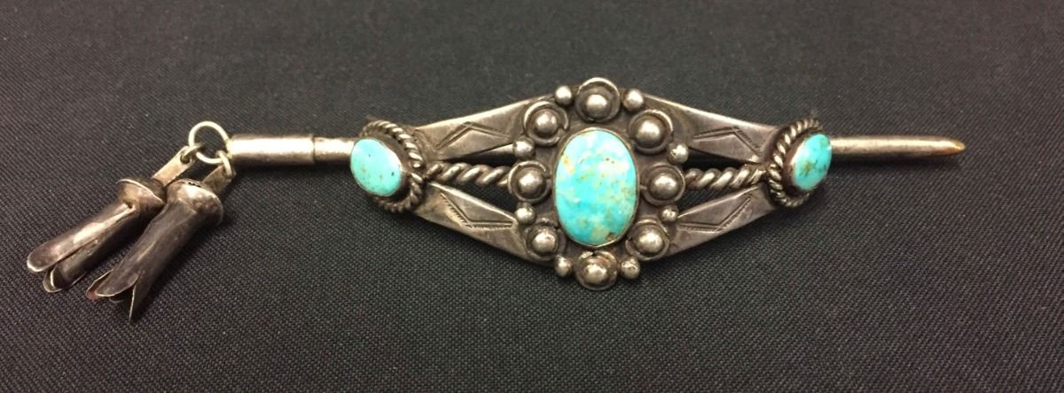 Maker: Unknown artist, but most likely Navajo. Approx. Age: Circa 1960s. Size: 5” long overall and weighs 38.8g. Condition: Good. Additional Info: Unique hairpiece which looks like it was once a bracelet and has been nicely converted. Sterling silver. Please look closely at the pictures - they are an important part of our description. Shipping: There will be a $5 handling / packaging fee for shipping this lot. The actual cost of postage will be added on top of that.