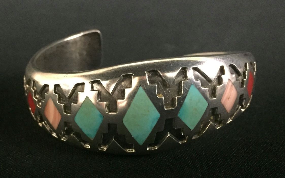 Maker: Marked AB and Navajo (unable to determine who's hallmark it is). Approx. Age: Fairly modern. Size: Measures 5.5” inside plus there is a 1” gap. It’s just under 1” wide at the widest part and weighs 48.6g. Condition: Good. Additional Info: Unique design. Multi-stone inlay set in Sterling silver. Please look closely at the pictures - they are an important part of our description. Shipping: There will be a $5 handling / packaging fee for shipping this lot. The actual cost of postage will be added on top of that.