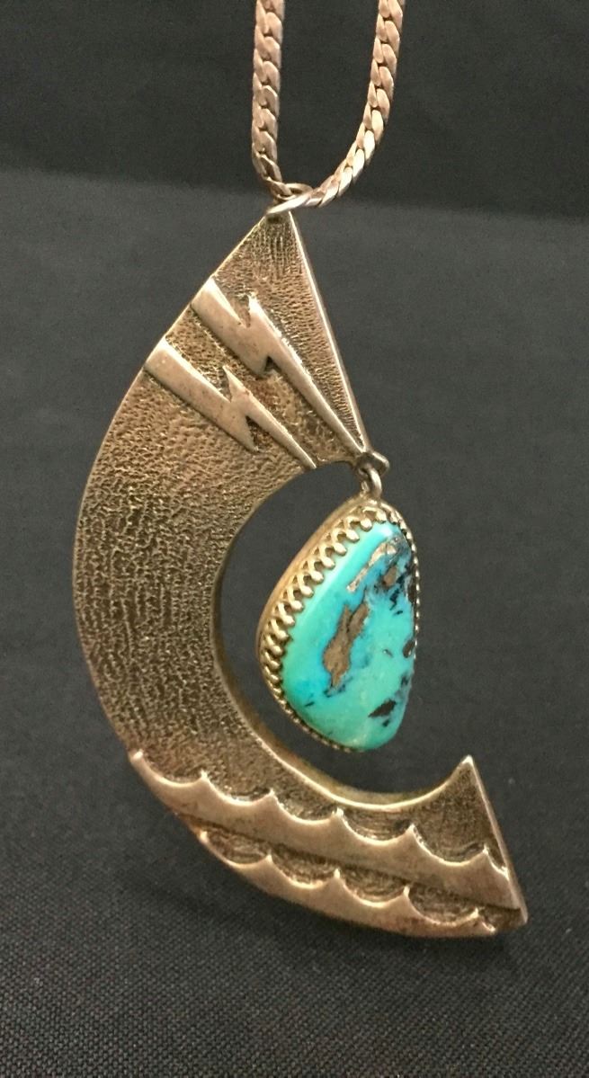 Maker: Unknown, but appears to be Navajo style. Approx. Age: Vintage. Size: Fits 19” around the neck and the pendant hangs down 2.75” in addition. Weighs 43.7g. Condition: Good. Additional Info: The pendant is unique, with a nice turquoise setting. Has an Italian sterling silver chain. Please look closely at the pictures - they are an important part of our description. Shipping: There will be a $5 handling / packaging fee for shipping this lot. The actual cost of postage will be added on top of that.