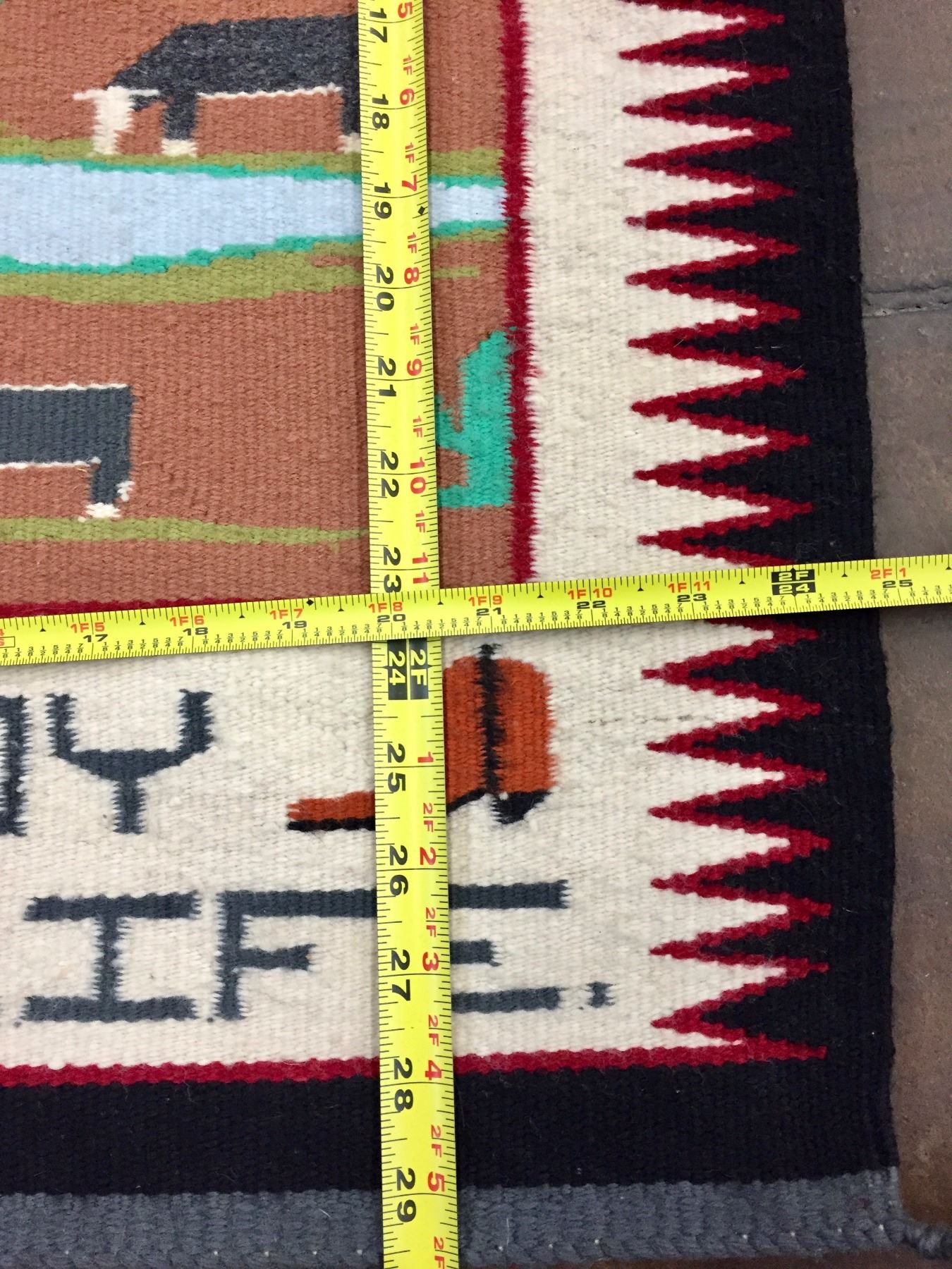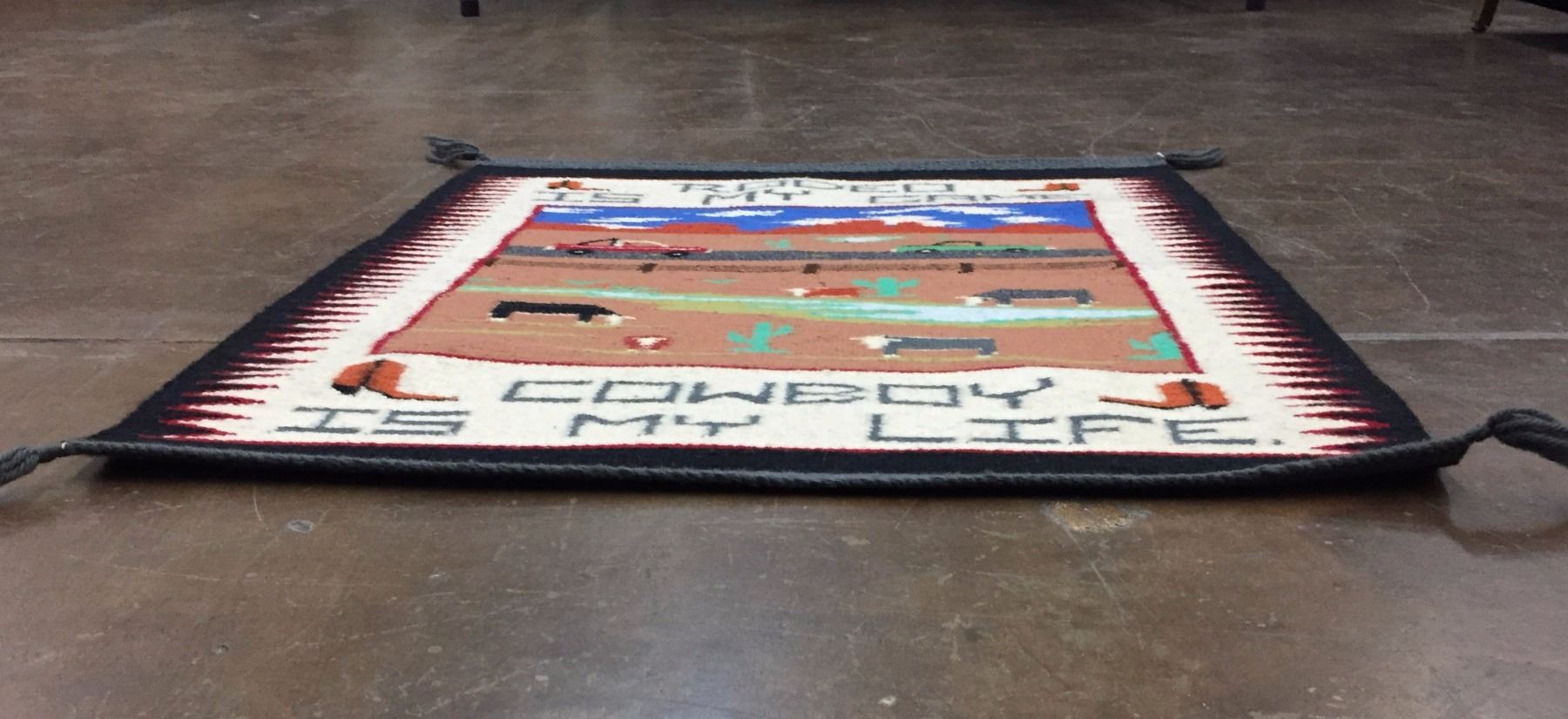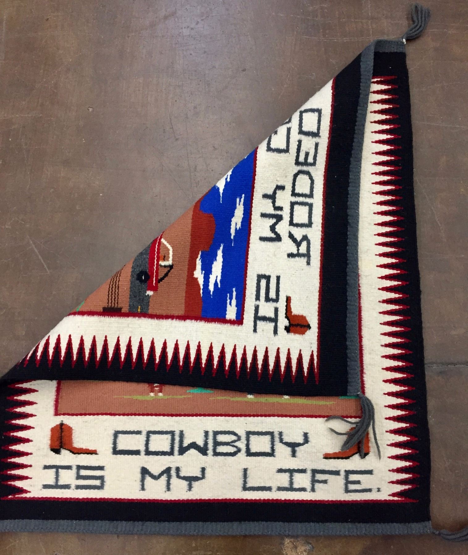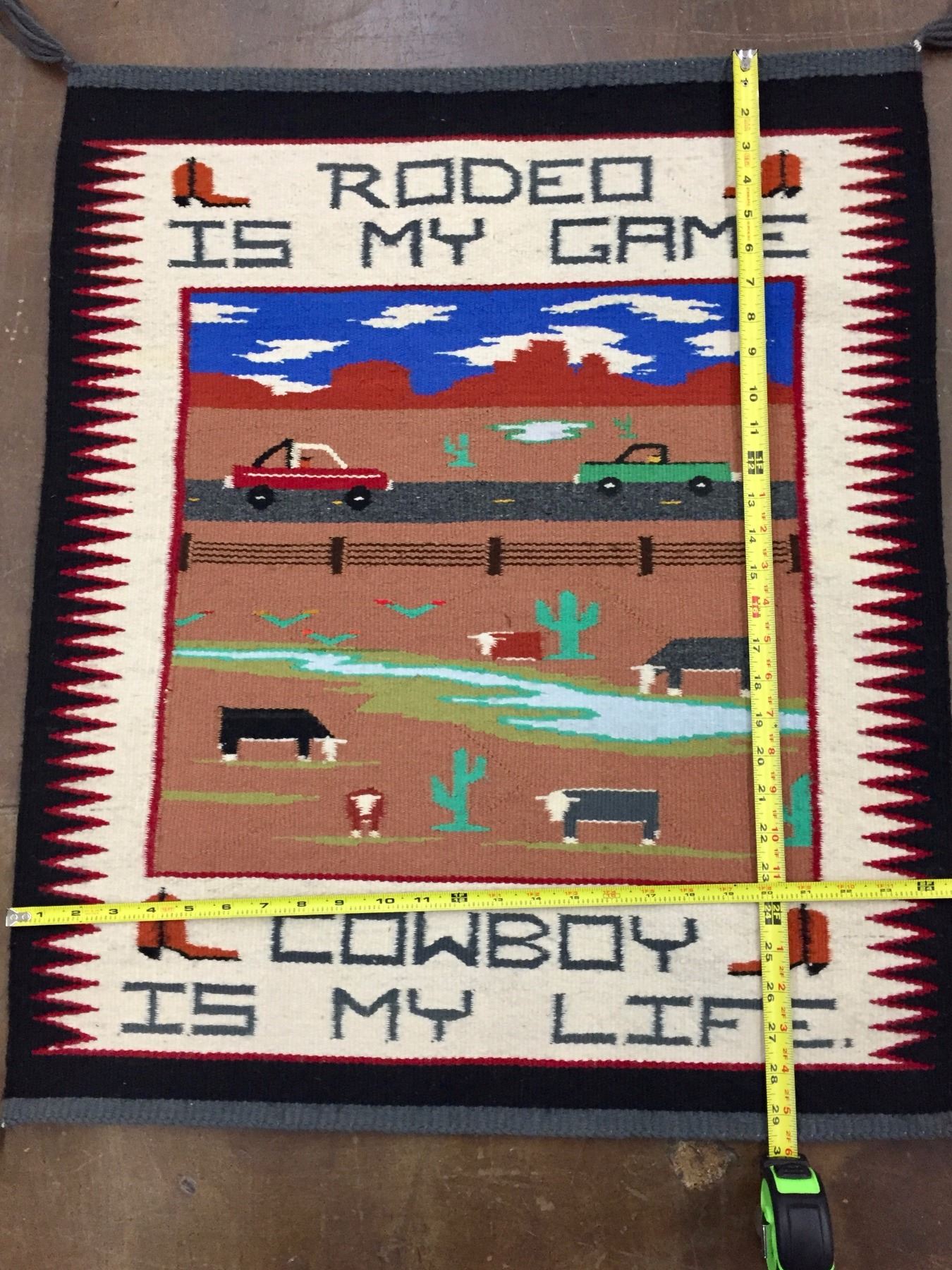 Description: A unique Navajo Pictorial Textile that says, “Rodeo is my game, Cowboy is my life”! Maker: Unknown Navajo weaver. Approx. Age: Circa 1980s. Size: Measures 25” wide x 29-1/2” long. Condition: Good for its age, normal wear expected. Please look closely at the pictures - they are an important part of our description. Shipping: There will be a $5 handling / packaging fee for shipping this lot. The actual cost of postage will be added on top of that.