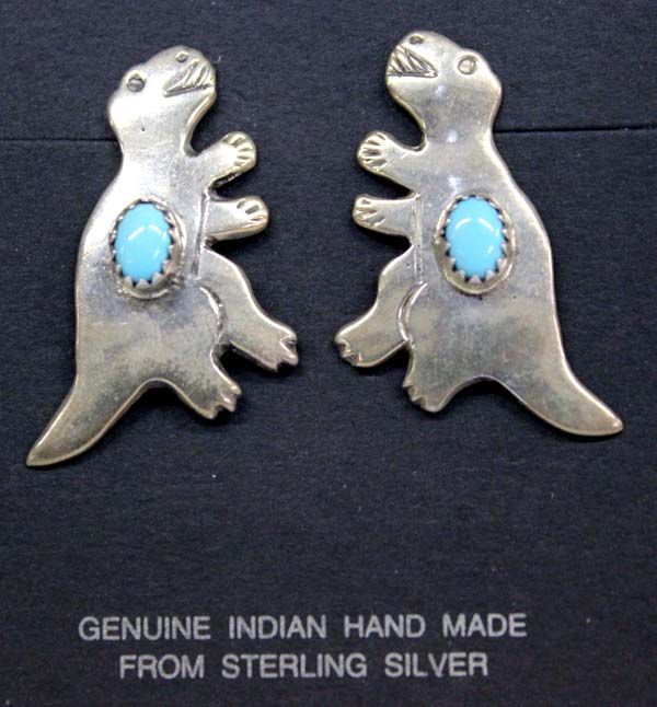 Unique Navajo Silver Turquoise Tyrannosaurus Dinosaur Earrings, measures 1 3/8''L x .75''W, each earring has a turquoise cabochon measuring .25'' x 1/8'', stamped details, 6.64g in total wt.