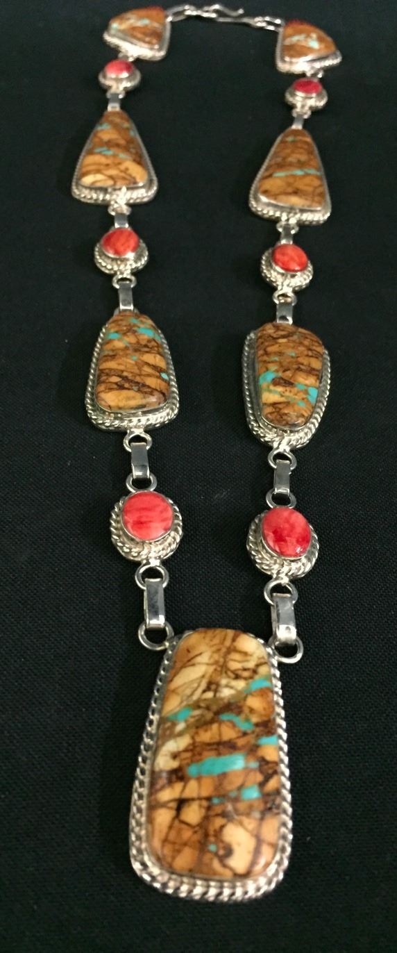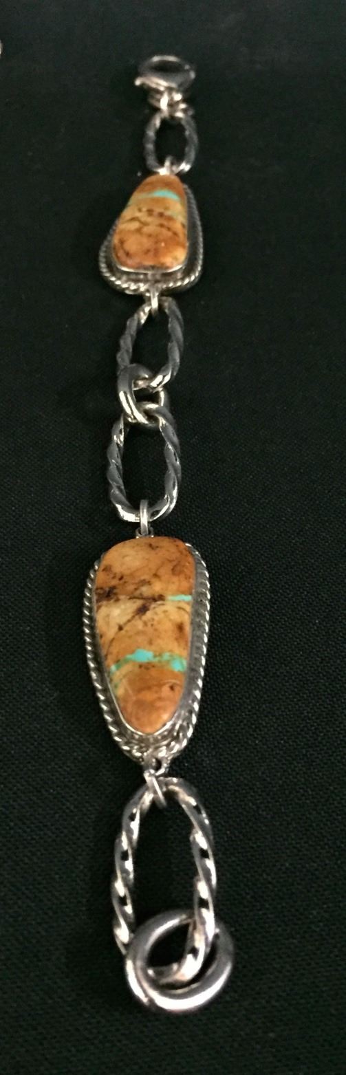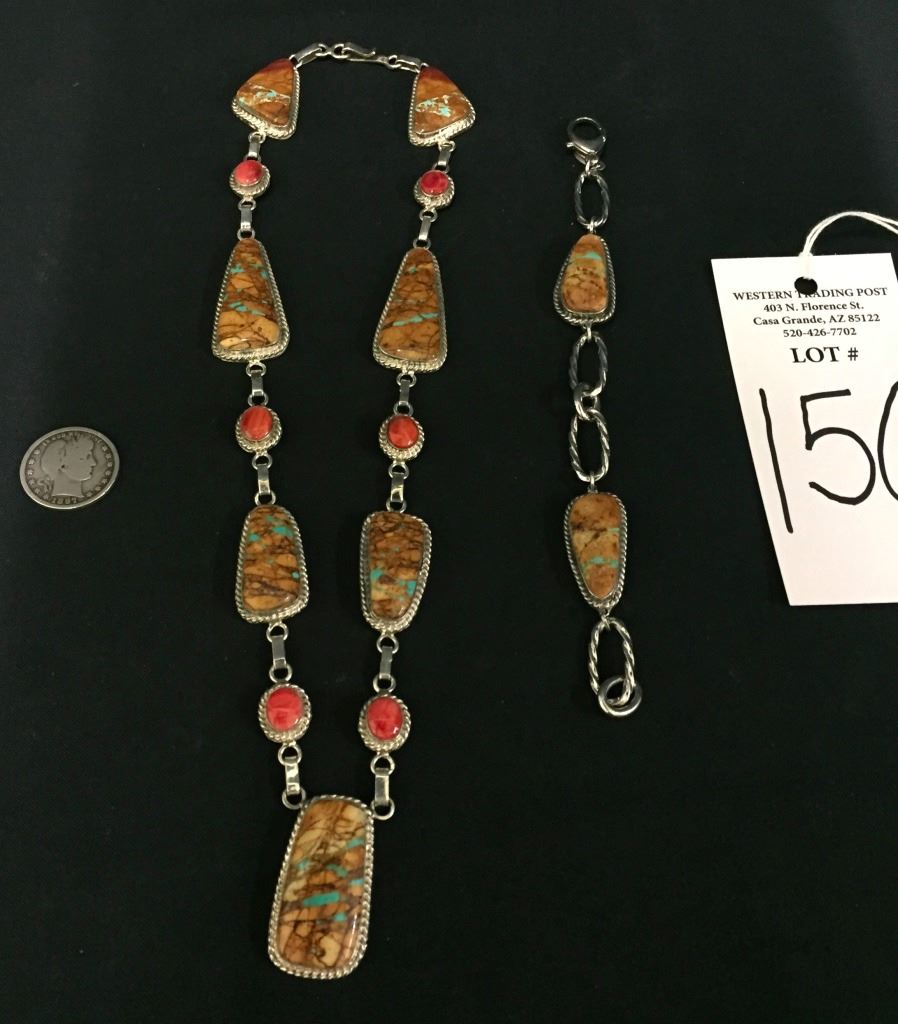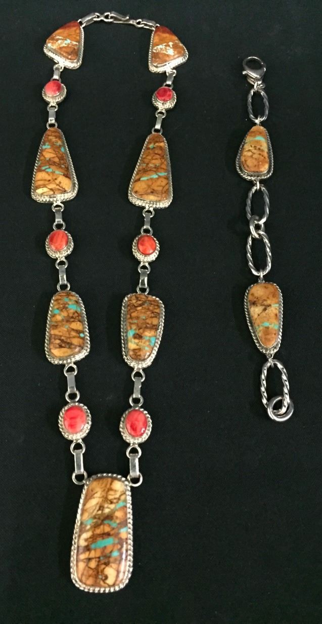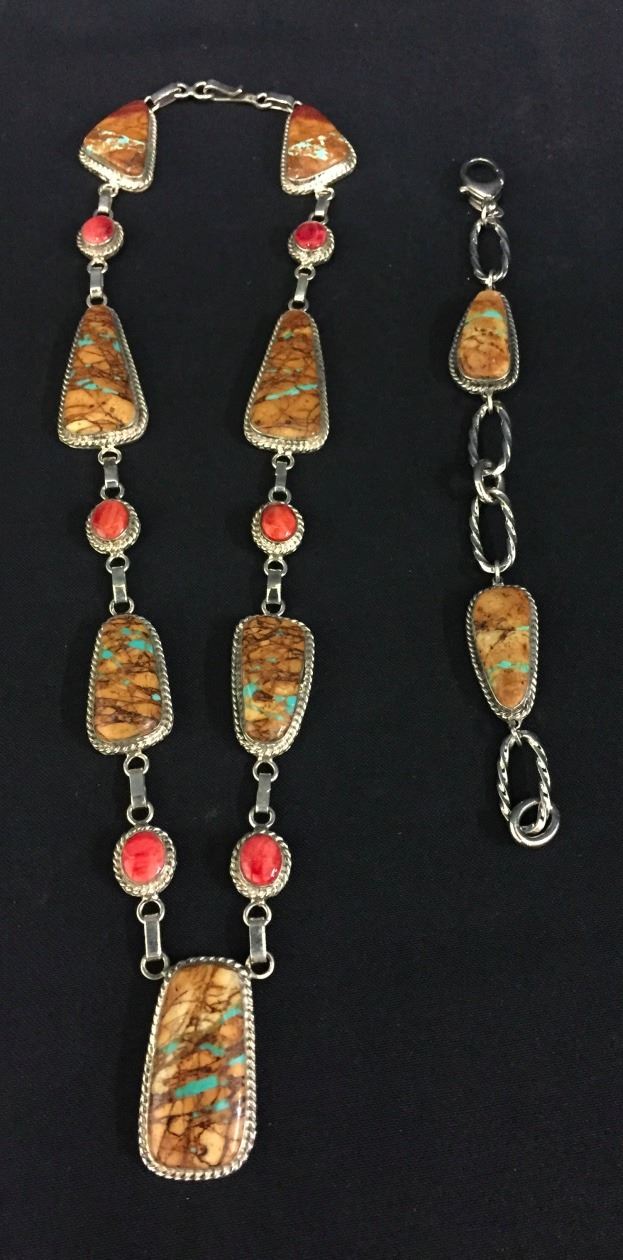 Maker: Marked TT and sterling (not sure exactly who’s hallmark it is, but appears to be Navajo style work). Approx. Age: Fairly modern. Size: Necklace fits 19” around the neck and the pendant hangs down an additional 1.5”. The bracelet is 7” long overall. Items weigh 128.8g. Condition: Good. Additional Info: Looks like Royston ribbon turquoise with orange spiney oyster cabochons. Marked as sterling on the pendant. Please look closely at the pictures - they are an important part of our description. Shipping: There will be a $5 handling / packaging fee for shipping this lot. The actual cost of postage will be added on top of that.