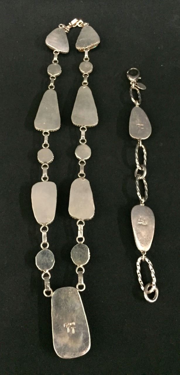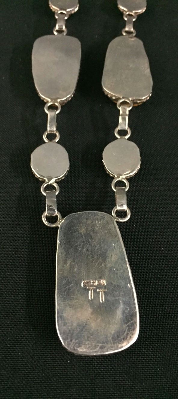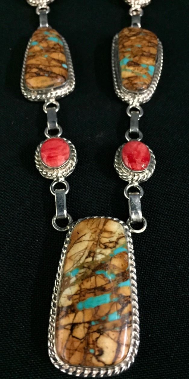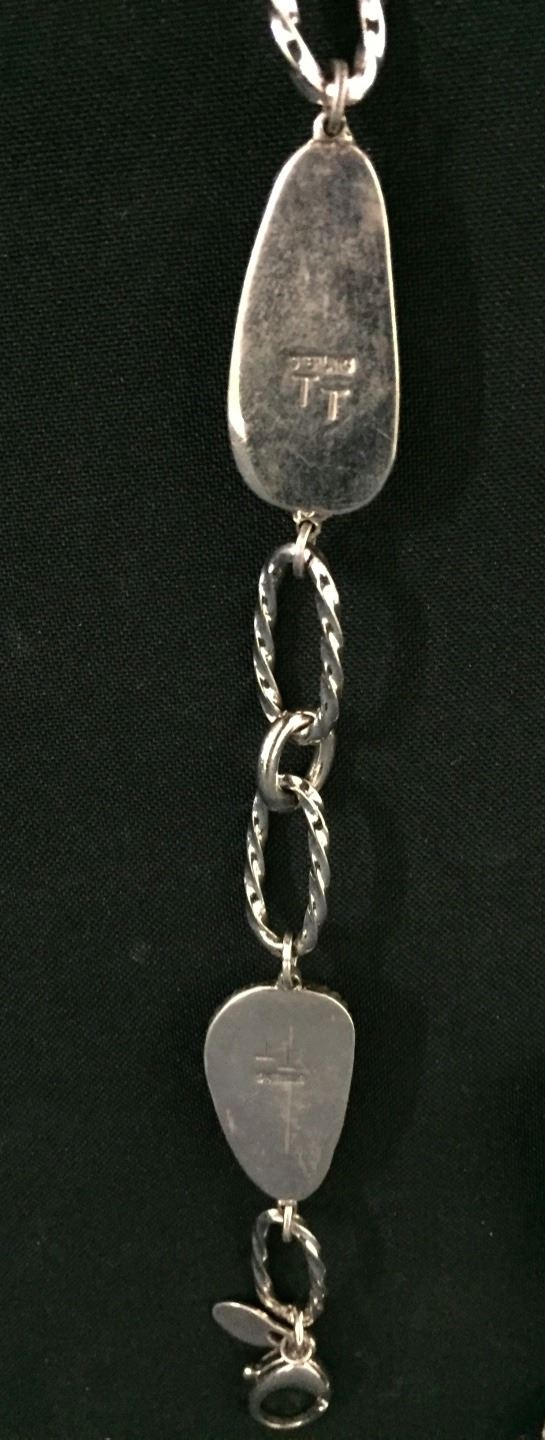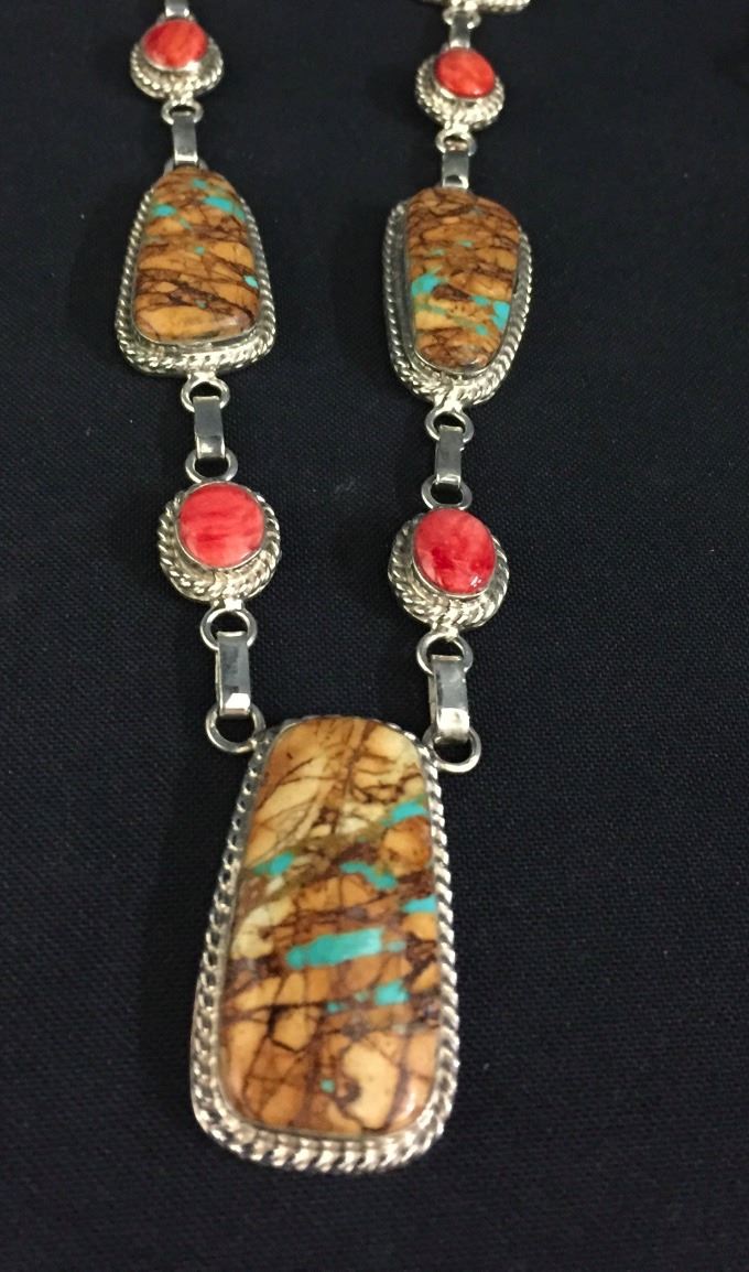 Maker: Marked TT and sterling (not sure exactly who’s hallmark it is, but appears to be Navajo style work). Approx. Age: Fairly modern. Size: Necklace fits 19” around the neck and the pendant hangs down an additional 1.5”. The bracelet is 7” long overall. Items weigh 128.8g. Condition: Good. Additional Info: Looks like Royston ribbon turquoise with orange spiney oyster cabochons. Marked as sterling on the pendant. Please look closely at the pictures - they are an important part of our description. Shipping: There will be a $5 handling / packaging fee for shipping this lot. The actual cost of postage will be added on top of that.