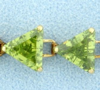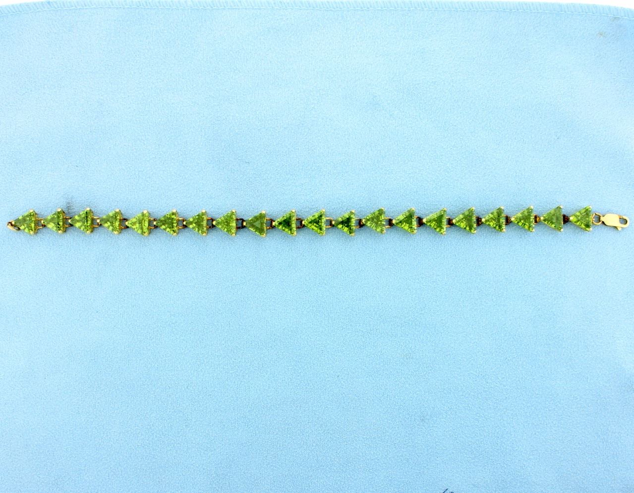 In 14K yellow gold, it is 8 inches long and contains twenty 8mm trillion cut fine peridot gemstones. This bracelet has a lobster clasp. 11.5g