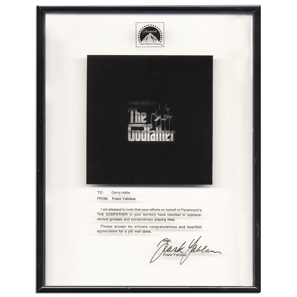 ''The Godfather'' glass plaque, custom made by the president of Paramount. Black print reads, ''To Gerry Haille / From Frank Yablans / I am pleased to note that your efforts on behalf of Paramount's THE GODFATHER in your territory have resulted in unprecedented grosses and extraordinary playing time. Please accept my sincere congratulations and heartfelt appreciation for a job well done. Sincerely, Frank Yablan''. Framed glass measures 11.25'' x 14.25''. Near fine.