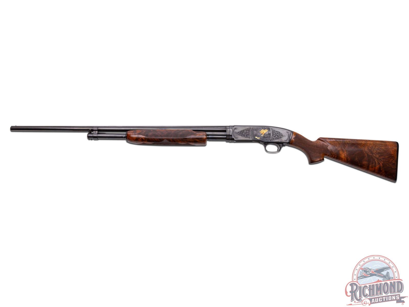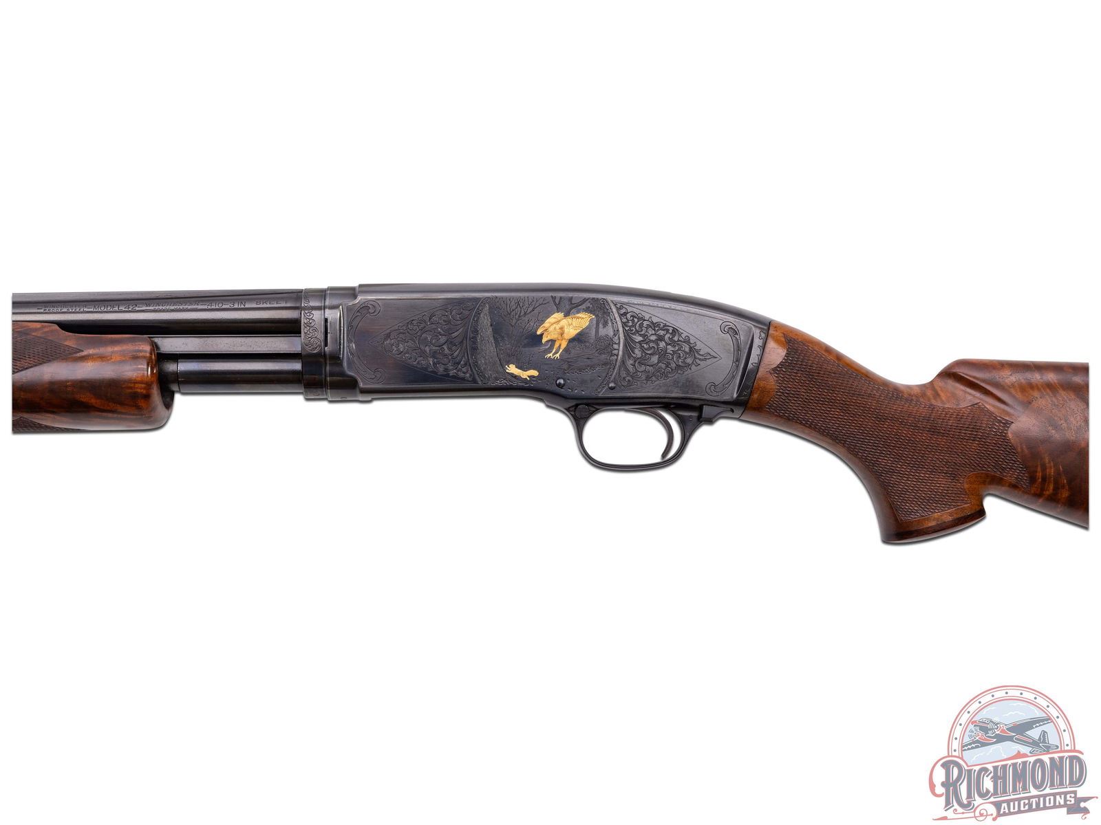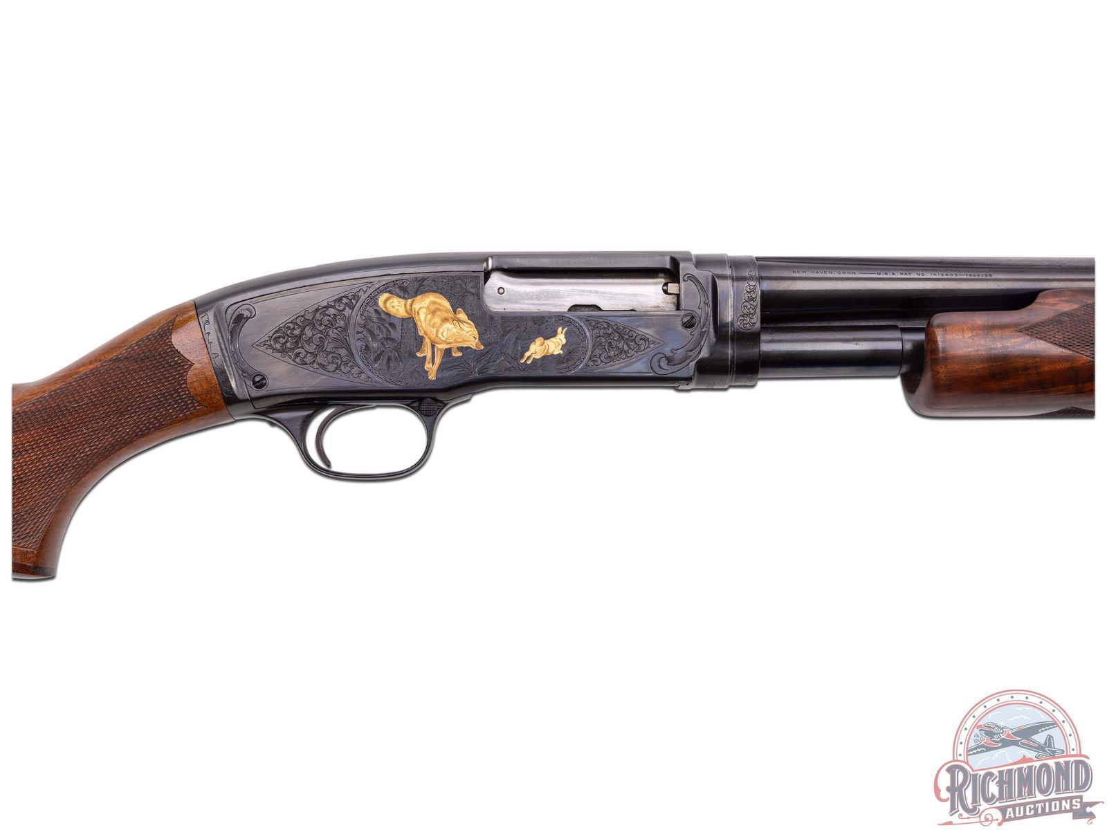 Manufactured in 1937. Features a 26" blued ventilated rib barrel with nickel bead front sight, chambered for 3" shells with Improved Cylinder choke. Standard Winchester barrel markings with "SKEET" behind the chamber stamping. Floral scroll engraving design cascades each side of the barrel sleeve lock. Left side of the receiver features a gold inlaid hawk going after a gold inlaid squirrel running to refuge in a tree. This woodland scene is surrounded in a circular border with floral scroll design in a spear shape on each side. Right side features a gold inlaid fox chasing a gold inlaid hare in a woodland scene, surrounded in a circular border with floral scroll design in a spear shape on each side. Signed "K.Hurst" below the fox. Nice feather crotch walnut pistol grip stock with checkering on grip and fitted with a Rosewood grip cap. Matching forearm with checkering. Fitted with a factory Winchester black checkered synthetic butt plate. LOP: 14". DAC: 1-1/2". DAH: 2". CALIBER: 410. S/N: 28200. FFL STATUS: Curio & Relic.