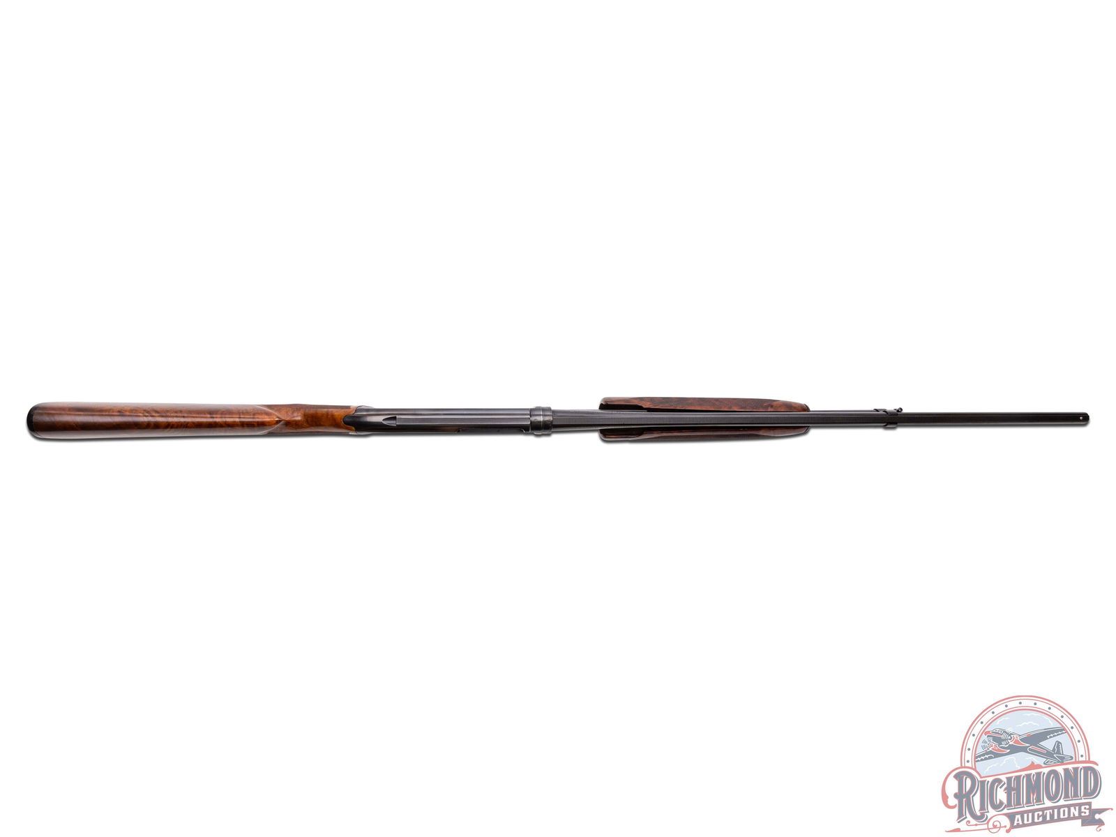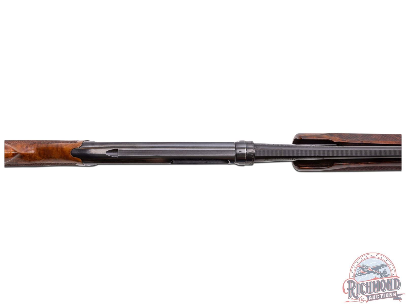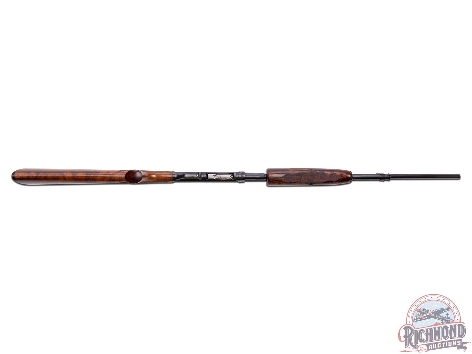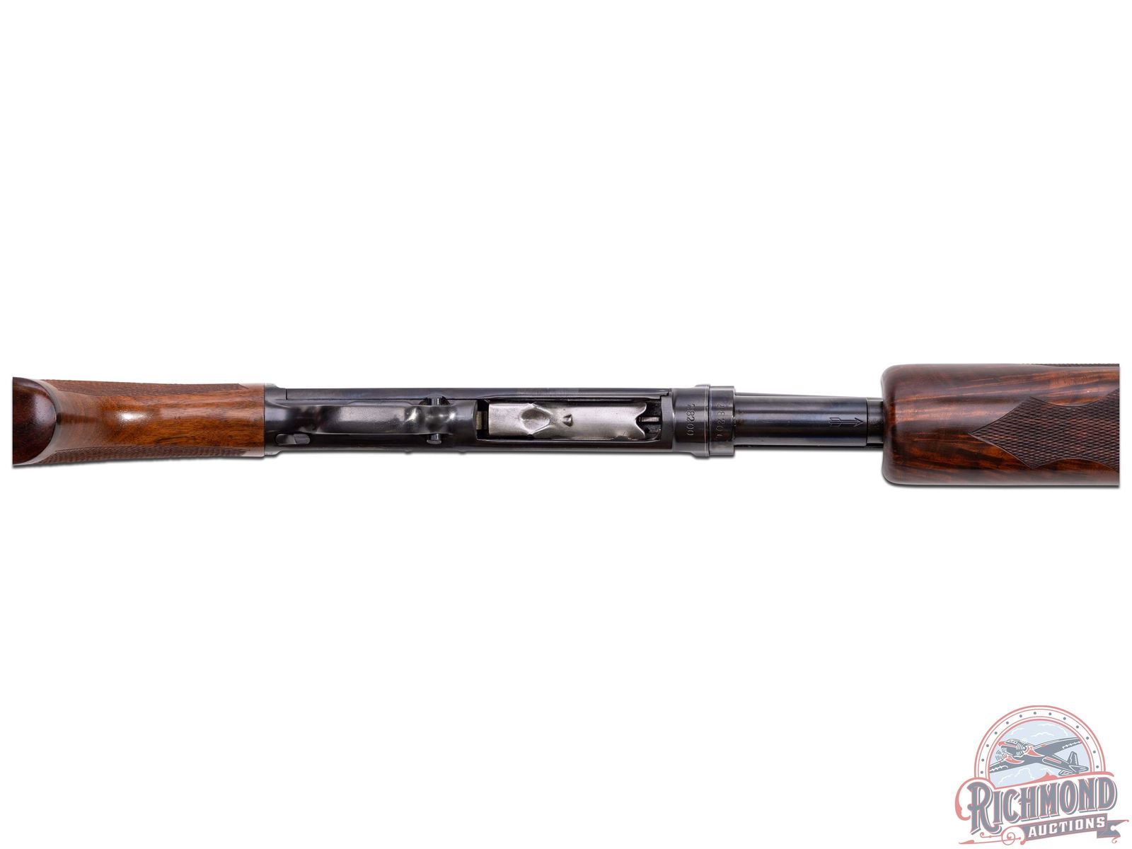 Manufactured in 1937. Features a 26" blued ventilated rib barrel with nickel bead front sight, chambered for 3" shells with Improved Cylinder choke. Standard Winchester barrel markings with "SKEET" behind the chamber stamping. Floral scroll engraving design cascades each side of the barrel sleeve lock. Left side of the receiver features a gold inlaid hawk going after a gold inlaid squirrel running to refuge in a tree. This woodland scene is surrounded in a circular border with floral scroll design in a spear shape on each side. Right side features a gold inlaid fox chasing a gold inlaid hare in a woodland scene, surrounded in a circular border with floral scroll design in a spear shape on each side. Signed "K.Hurst" below the fox. Nice feather crotch walnut pistol grip stock with checkering on grip and fitted with a Rosewood grip cap. Matching forearm with checkering. Fitted with a factory Winchester black checkered synthetic butt plate. LOP: 14". DAC: 1-1/2". DAH: 2". CALIBER: 410. S/N: 28200. FFL STATUS: Curio & Relic.