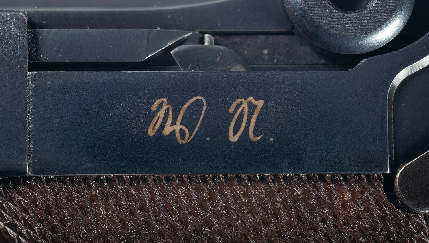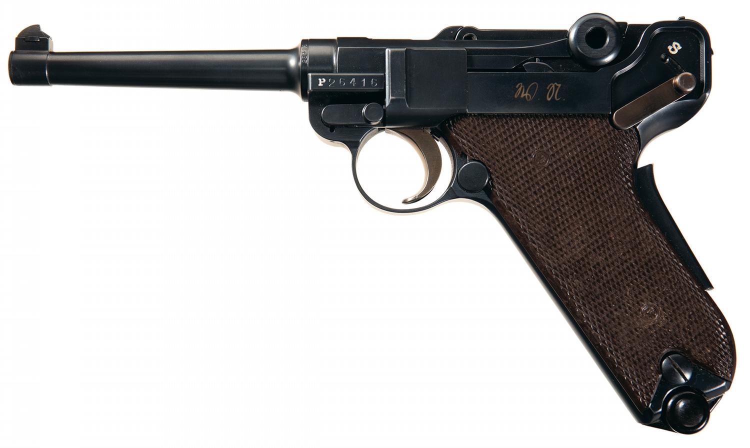 This is an excellent example of an early 1929 Swiss commercial contract Luger as manufactured by Waffenfabrik factory in Bern, Switzerland. This specific pistol was manufactured in the first block of Commercial serial numbers (P25001 to P26600), and it still retains it's original 7.65 mm Luger auto cartridge chamber. These commercial 1929 pistols were intended for sale within Switzerland and have a very distinctive and different appearance in comparison to the other models of P08 Lugers. They differ primarily in that they have a straight angular shape to the frame, longer and wider grip safety, a flat almost cast or stamped thumb safety lever, flat non-checkered magazine release catch, with a turned or rebated front section of the barrel extension that matches the outside diameter of the barrel shoulder. They also lack the checking or knurling on the sides of the toggles and they have the all blued finish, (this pistol has straw colored trigger and safety lever). It is assumed these design changes were strictly intended as manufacturing shortcuts as they function and perform exactly like the original P08 Luger design. This particular pistol has two gold filled initials (origin unknown) on the left side of the frame, possibly for presentation. The top of the chamber is unmarked and the rear toggle has the "Swiss Cross in a Shield" markings. The barrel is correctly numbered on the left side of the shoulder, with the Swiss Bernerprobe proof on top and has a small "Swiss Geneva Cross", acceptance proof on the underside with the full serial number on the left side frame rail (and not on the front end) and again on top of the rear toggle. There is a "K+ in a "W" on the right side rail and the extractor is correctly marked "GELADEN". The rear of the frame and again on the sides of the plastic grip panels, has the circular proof of a "F + over W" proof, as well as a "MA / 1494" in a circle. It is complete with a one original Swiss nickel plated magazines, marked with a single script "P" proof on the spine.