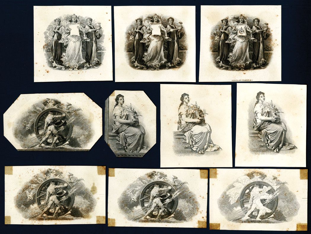 Lot of 13 different progress engraving proofs from 4 different Vignettes. Includes 4 different states of "Progress" vignette of man turning wheels of progress with additional allegorical figures; 3 progress engravings of "Science and Commerce No.2" of 3 Allegorical Women, one holding torch, the second a plaque and the third a winged railroad wheel, all in different states of engraving, with the last and complete engraving with American Bank Note Companies Logo ABNCo.; 3 different engraving states of seated allegorical woman holding bee hive and flowers. All with some degree of foxing spots, still very attractive and rarely seen archival production material. From a new find. ABNC.