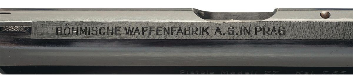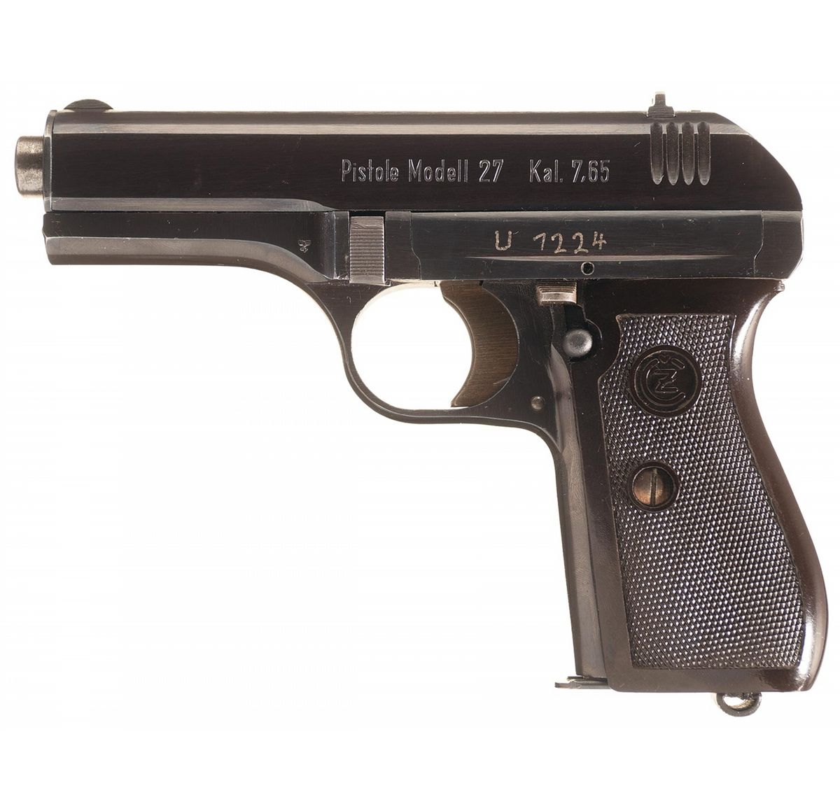 Fixed sights with "Pistole Modell 27 Kal. 7,65" on the left side of the slide, one line Prague address on top, and an "eagle/4" proof on the left side of the frame. The side plate is numbered "U 7224" in electric pencil, the frame is unnumbered. Dark brown checkered wraparound grips with "CZ" imprints. The magazine is marked "P. Mod 27" on the bottom.