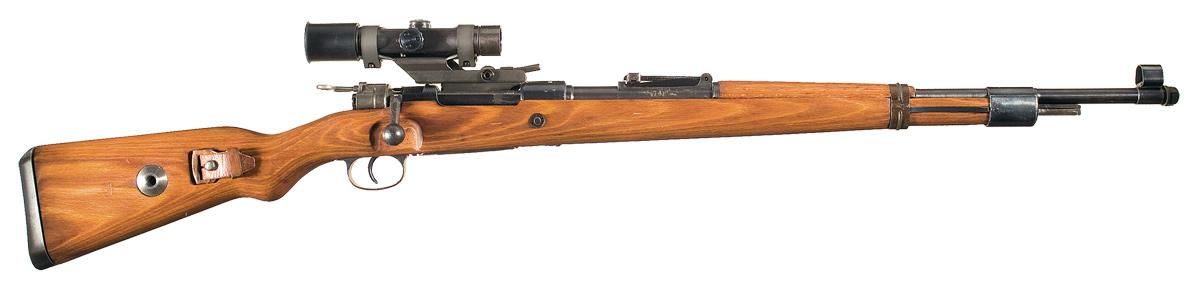 This is a late WWII K98 rifle that was produced at the Mauser-Werke, A.G. Oberndorf facility and subsequently fitted with the short side rail sniper rifle system. This mounting system was originally intended for police use during the mid 1930s, and in 1941 was adopted for general combat use with the K98 rifles. The rifle is equipped with a K43 "ddx" (Voigtlander & Sohn A.-G., Braunschweig) code scope with a rubber eye piece, mounted on a phosphate finished stamped sheet metal mount numbered to the gun. The left side of the scope is marked "K43 / 81422 / ddx triangle". The top of the receiver ring is marked "Mod 98 / byf 45". The top and right side of the receiver ring is also marked with "eagle / 135" proofs. The left side of the barrel is marked with the Nazi firing proof and the left side of he receiver is marked with the serial number behind the Nazi firing proof. There are "eagle / 135" proofs on various parts and all visible numbers (partial and full) match. Hooded ramp inverted "V" front sight and tangent rear sight graduated to 200 meters. Stamped rear barrel band (phosphate) and milled front barrel band, floor plate and trigger guard. Phosphate bolt with blue extractor. The laminated stock is marked on the right side with a Waffenamt proofmark and the buttplate is ill-fitting. The rifle bolt has the late war "Key" Safety, the cleaning rod is absent and it is fitted with a brown leather sling.