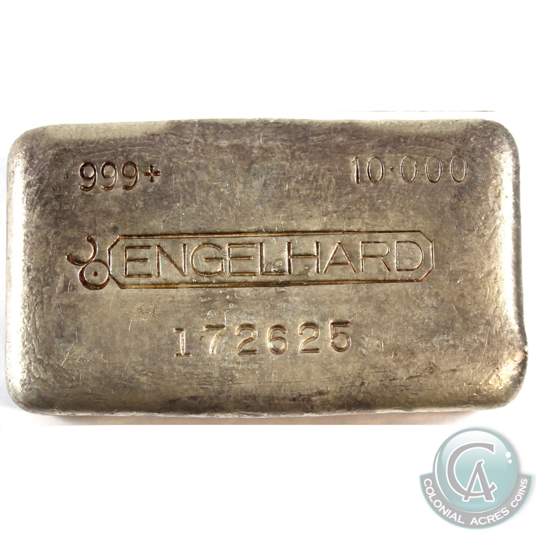 Unique Rare Engelhard 10oz Fine Silver Bar with Reverse Counter Stamp Error (TAX Exempt). Serial # 172625. This bar contains the dimensions of the 4th Series Canadian Production bars. Contains the center decimal on weight class as well as the dot in Bull logo. One the reverse of the bar contains multiple partial stampings of the Engelhard logo.