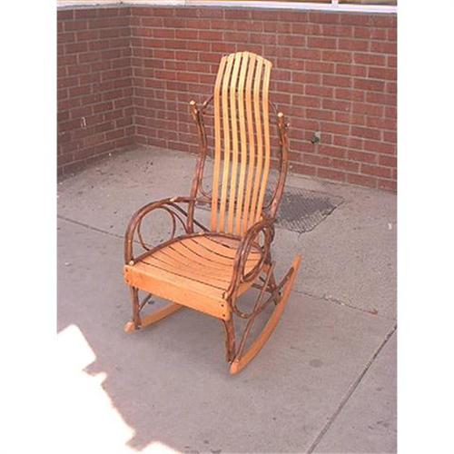 Unique Rocking Chair. This rocking chair is quite unique as its made from slats of oak and then built with natural twigs and branches. Its well made and very sturdy. A definite conversation piece. All hand made. Would look great on any porch or inside any room. I've never seen anything like it in my years of business. Measures 43.5" tall at back and seat height measures 17" tall. A great rocking chair.