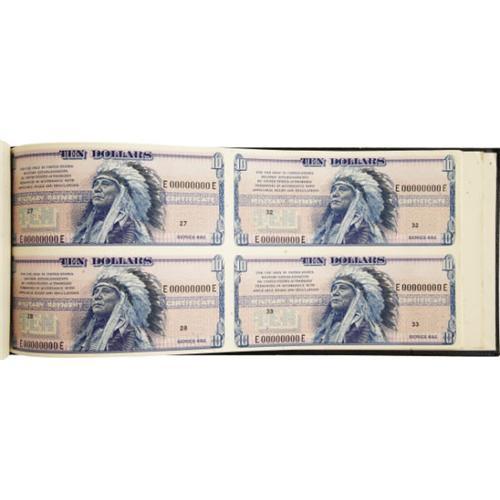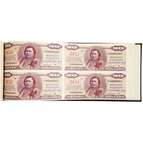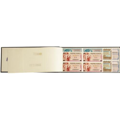 <B>Unique Series 692 Specimen Book </B></I> The existence of this newly discovered book, which is offered here to the numismatic community for the first time, comes as a complete surprise to even the most experienced members of the MPC collecting fraternity. This book, entitled <I>Progressive Impressions, Composite Impressions, and Specimens of Military Payment Certificates</B></I> <I>Series 692</B></I> is a collector's dream, containing, as it does, nine four subject sheets of each denomination from the 5¢ through the $20 in every possible printing permutation, from an all serial number E00000000E complete specimen printing to progressive impressions of all parts of the face and back of every note in every denomination. All of the pages are placed between black covers and each and every page is in its perfect as made <B>Gem Uncirculated </B></I>condition. There is a total of 288 proof and specimen impressions, counting each note as a single item, including, of course, the perennially popular $10 and $20 Indian notes. The only previously reported specimen impressions for this series was a one of each denomination all zeroes soft covered specimen book. Similar items, containing eight pieces, one of each denomination, have sold for ten to fifteen thousand dollars and up. Any estimate of a book containing 288 individual specimen and progressive proof examples is a mere guess, but this unique item, the only one known of its kind in the entire MPC field, is certainly a six-figure item, and perhaps more. It will be interesting to see who steps forward today to take advantage of what is almost certainly a once in a lifetime opportunity. <BR><BR><b>Shipping:</b> Coins & Currency (<a target="_blank" href="http://www.heritageauctions.com/common/shipping.php">view shipping information</a>)