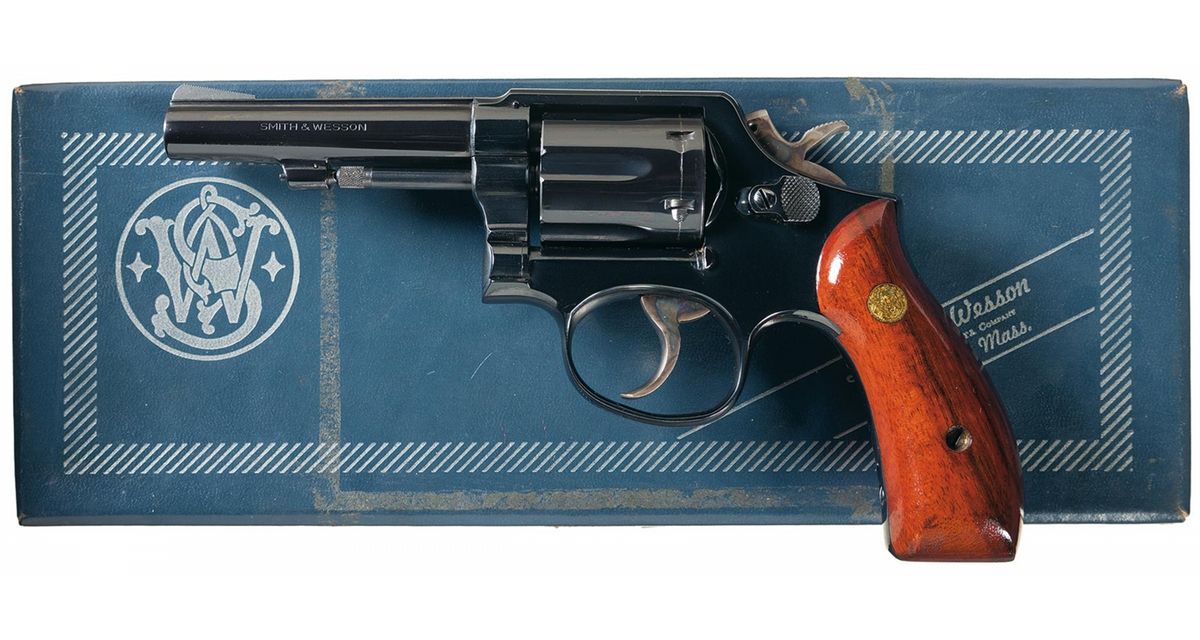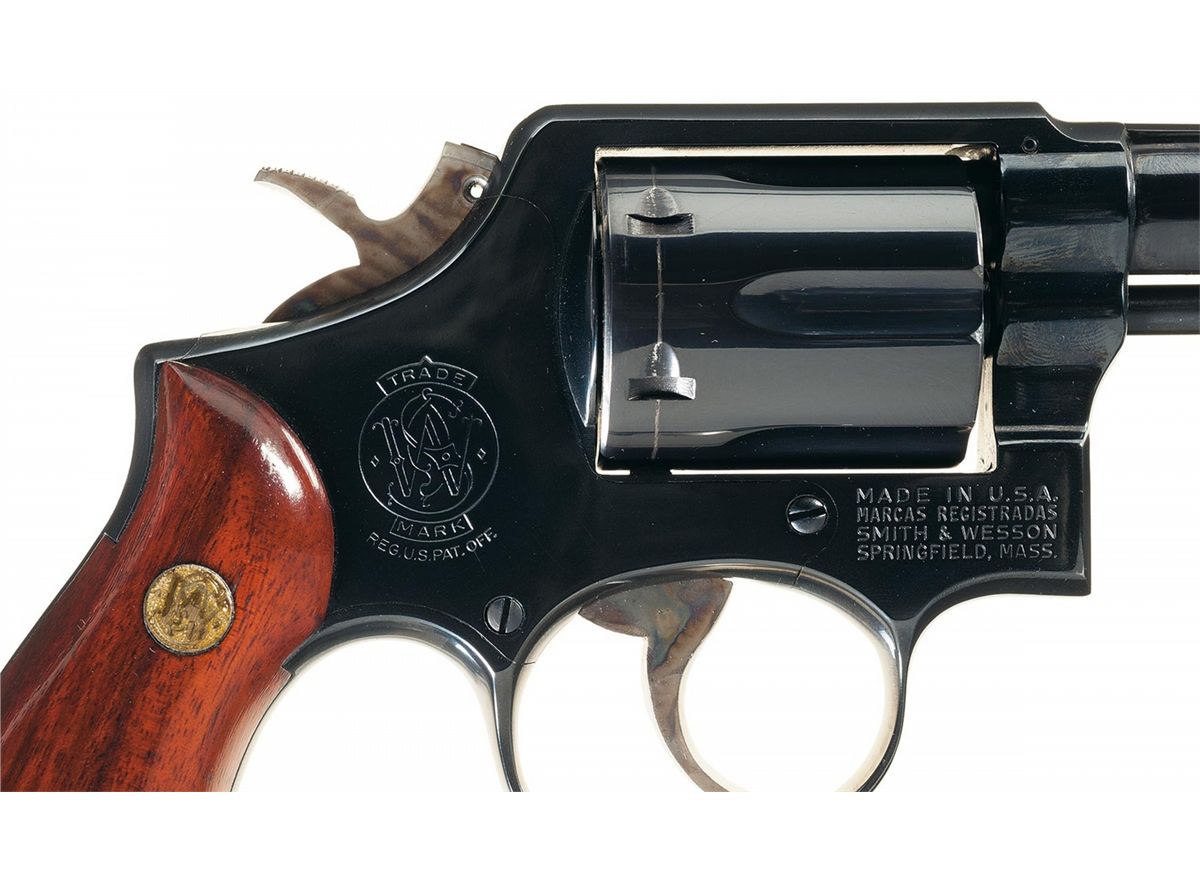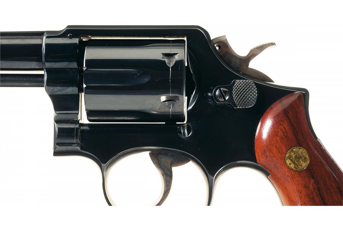 Manufactured in 1975 and later professionally converted to fire the 22 Jet cartridge. Serrated blade front sight, frame notch sight and smooth S&W medallion grips. The barrel is marked "SMITH & WESSON" on the left side and "22 MAGNUM" on the right side (cylinder is for the 22 jet). Blue finish with casehardened checkered hammer and target style smooth trigger. The grips feature S&W medallions. With a S&W blue box.
