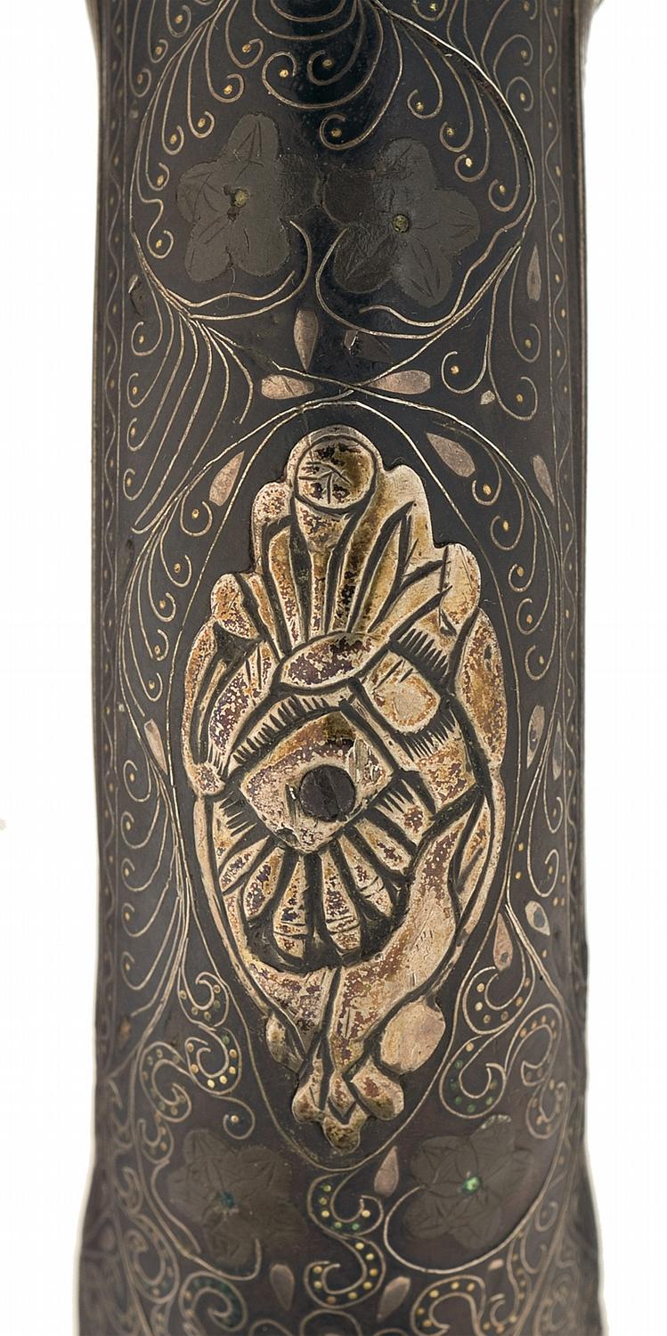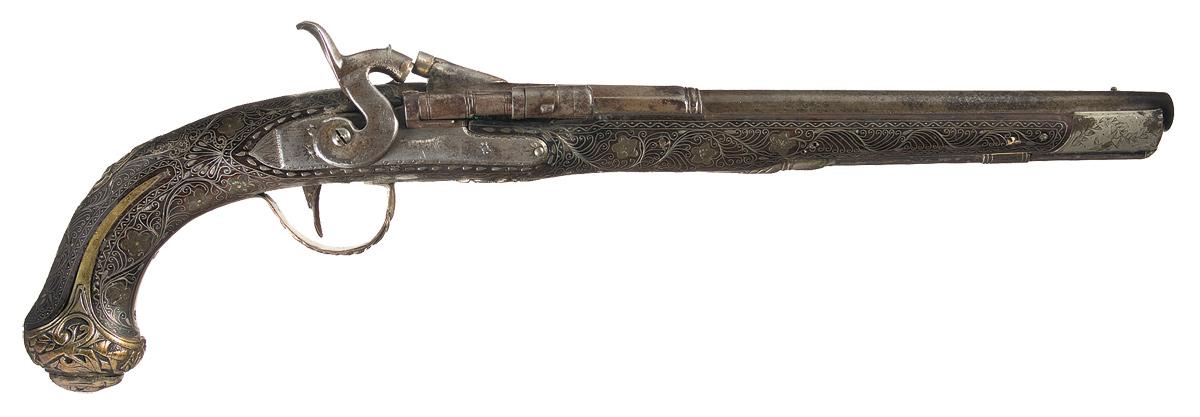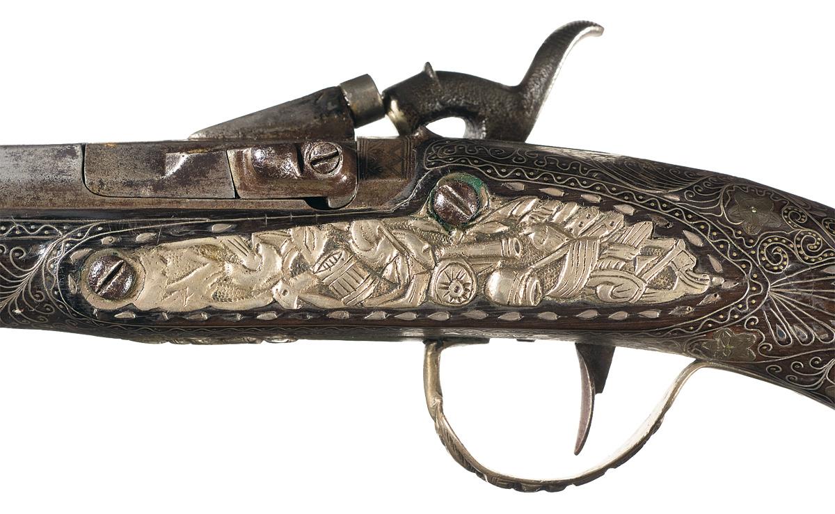 Bead front and notch rear sights, with a silver burst pattern around the front sight, three arrows engraved on the top flats, silver bordered zig-zag engraved panels, vine patterns on the locking block and silver zig-zags just ahead of the rear sights. Though not marked as such, the breechblock and extractor arrangement is identical to the Snider pattern. Light zig-zag and burst engraving on the lock, with the hammer turned to reach the firing pin and the reverse plate decorated with an assortment of arms. Stock is fitted with a floral engraved silver tip, cosmetic silver ramrod, extensive silver wire scroll inlay, with the ends terminating in engraved silver flowers, silver teardrop inlays, a decorated panel on the wrist and buttcap with raised designs.