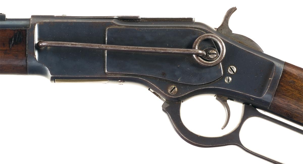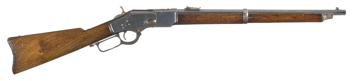 Manufactured in 1878 this carbine represents one of many experimental changes made on the Spanish '73 Carbine. In most factory records, Model '73s which were made for the Spanish Government trials were called "Addis Experimental Models" or are recorded "for d' Suzanne". F. D'Suzanne was the designer of the Model '73 Spanish Carbine. He secured the early Spanish contracts and introduced T.E. Addis to the officials who were to place the orders and test the Model '73s. D'Suzanne was instrumental in establishing dealers and distributors of the Henry rifle and Model 1866 and 1873 in France and Switzerland. He accompanied O.F. Winchester at the German, Swiss, Spanish and Turkish trials prior to 1875 and brought Addis to Spain. This carbine has a full stock, similar to the Model 1876 carbine, secured by a single barrel band with spring retainer, fixed front sight and folding rear sight mounted on a large base and graduated to 800 meters. The dust cover rail is secured by two screws, the dust cover has an oval checkered area and 5" saddle ring bar and ring mounted on the left side of the receiver. The stock is a smooth straight grip with a carbine buttplate. There only visible markings are oval proofmarks on various parts and "1225" stamped on the right rear of the stock. Over the years these Spanish '73 carbines experienced many changes and were copied a couple times over.
