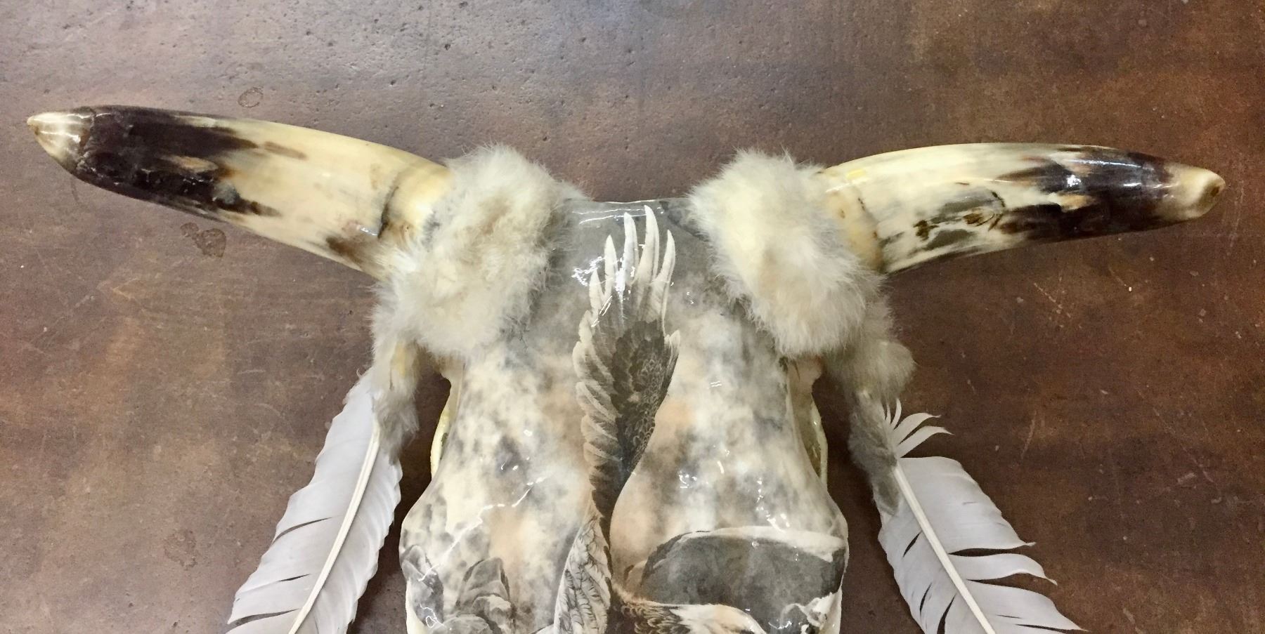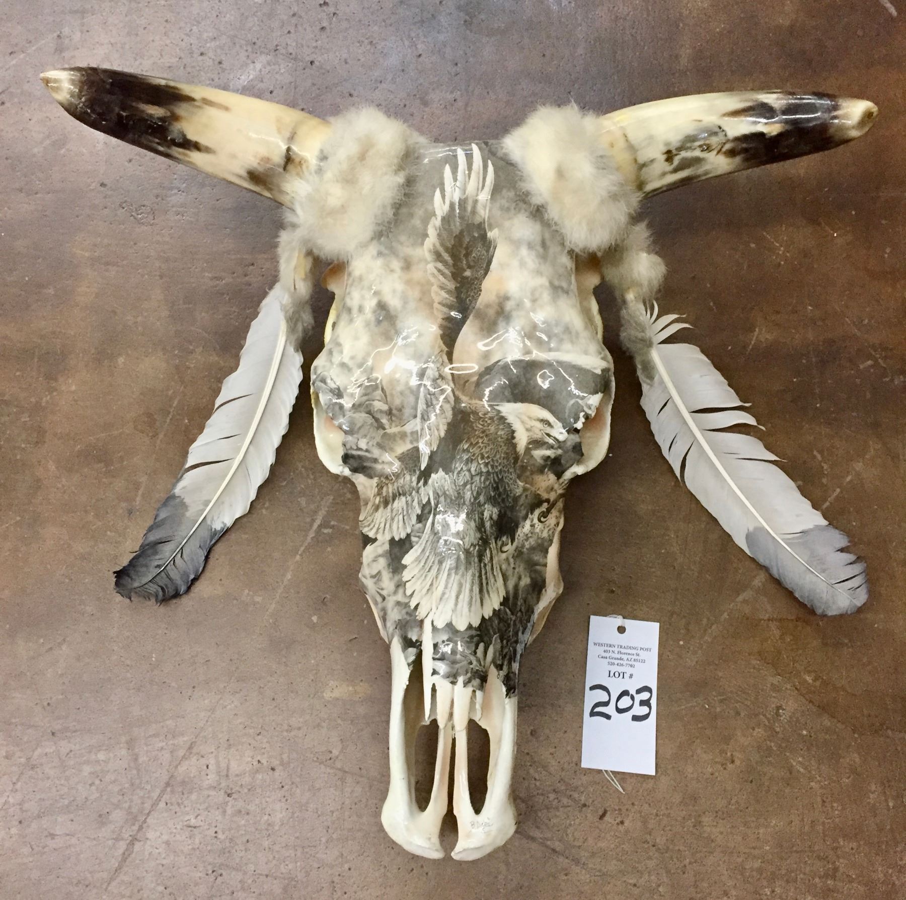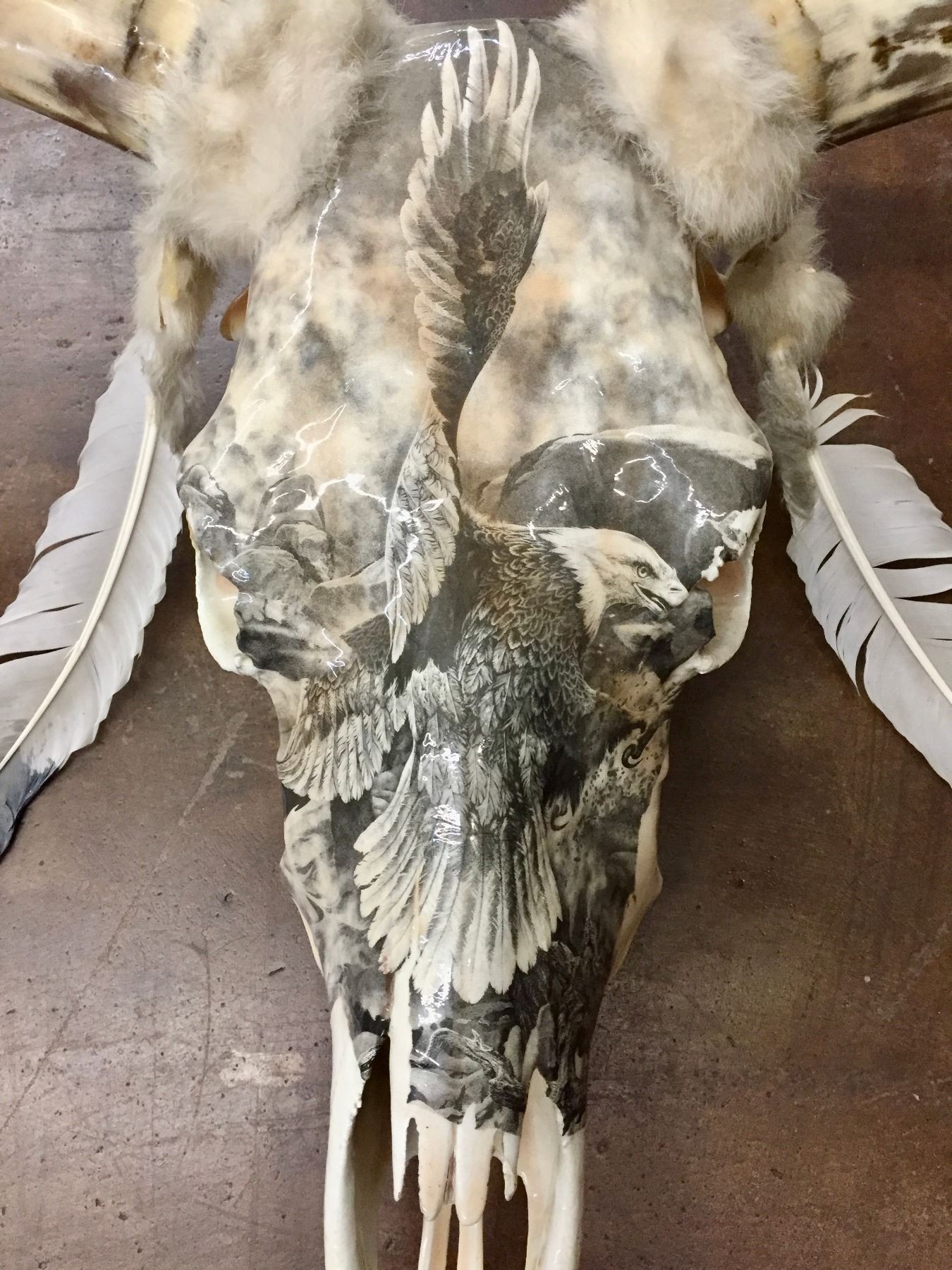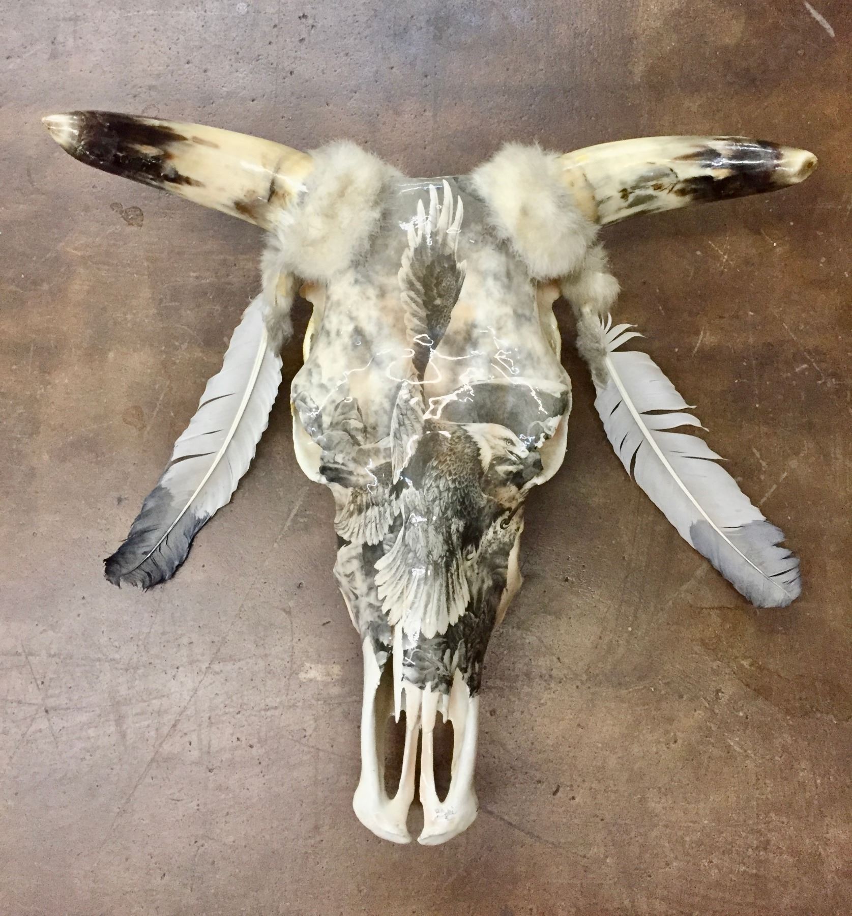 Description: For your consideration we offer for sale this unique steer head with feather accents and art depicting an Eagle, which was transferred to the head.