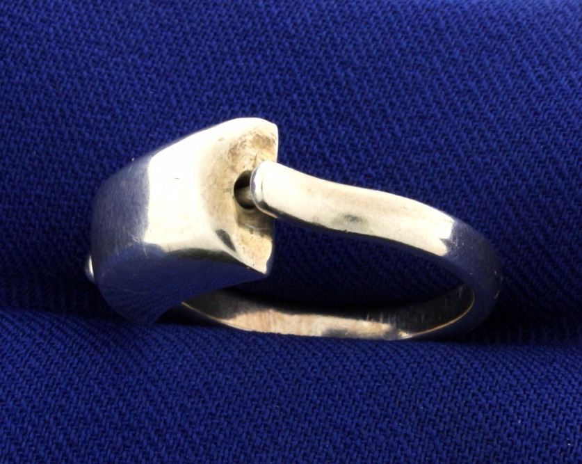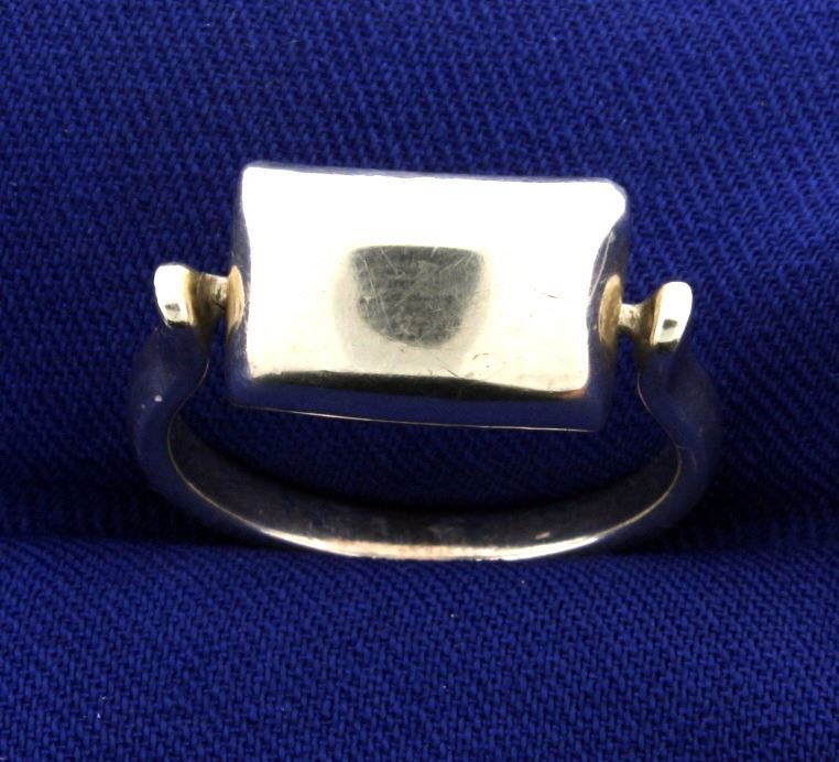 In sterling silver. Head swings one axel attached to shank so it lays flush against finger. Size 7. 6.4g.