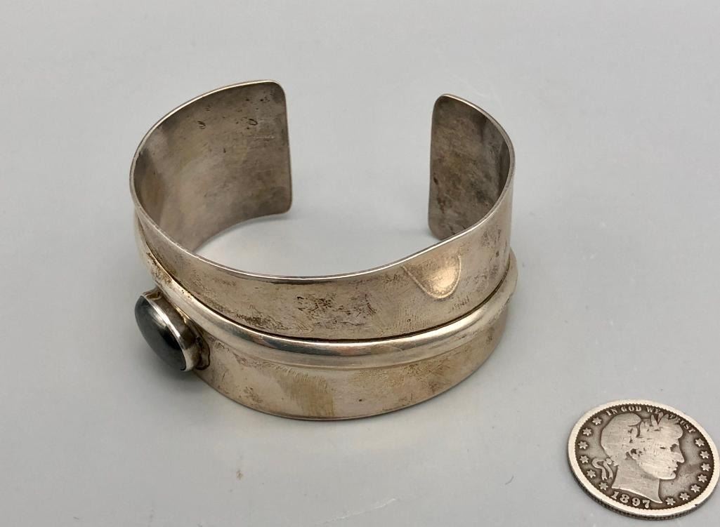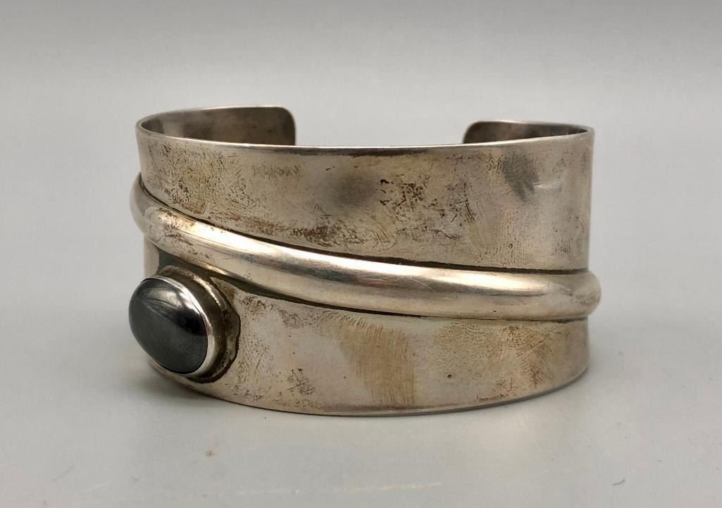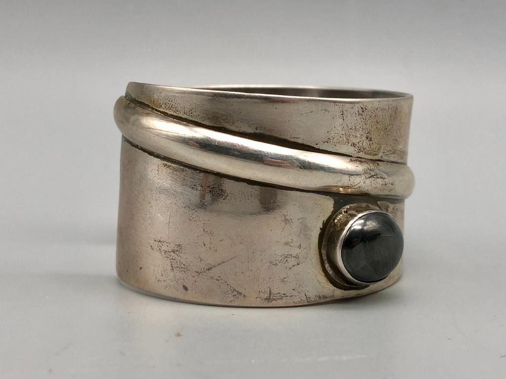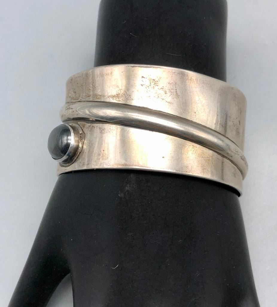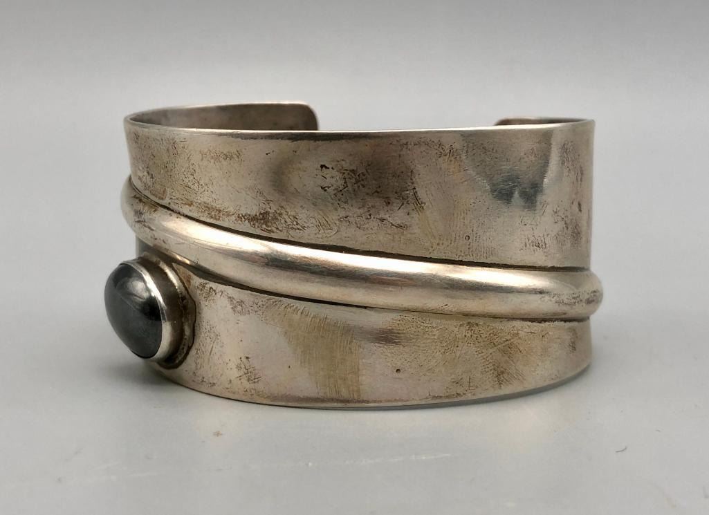 For sale in this lot is an eye-catching sterling silver and hematite bracelet. This is a sleek, contemporary style bracelet that has a wide cuff with raised, offset silverwork across it. It is accented with a lovely hematite cabochon, offset to the side of the cuff. It is stamped as sterling silver. MAKER: Hallmarked M. Antia (etched). APPROX AGE: Circa 1970s. SIZE: Inside circumference measures 5-7/8 inches long. Opening is an additional 1 inch, fitting a 6-7/8 inch wrist. Width is 1-1/4 inches. Weighs 66.3 grams. CONDITION: Good for its age, normal wear expected. Please look closely at the pictures as they are an important part of our description and are hereby incorporated into the description, specifically with regards to condition. SHIPPING: There will be a $5 handling / packaging fee for shipping this lot. The actual cost of postage will be added on top of that. BUY IT NOW: If you would like to buy this item now, without waiting for the auction day to bid on it, we do offer this option (which is available up to 48 hours before the actual auction starts). The “Buy it Now†price is the high estimate of this lot (plus applicable fees and the Buyer's premium is discounted to 10% when using the Buy it Now option). If you would like to exercise this option, you must contact us by email (or phone as long as you talk to someone live). Reference this lot number and your intention to "Buy it Now."