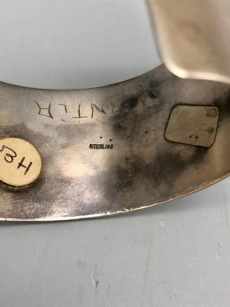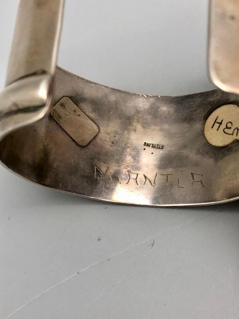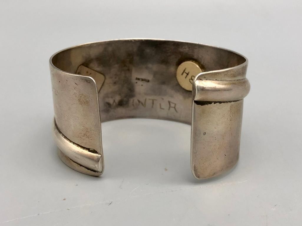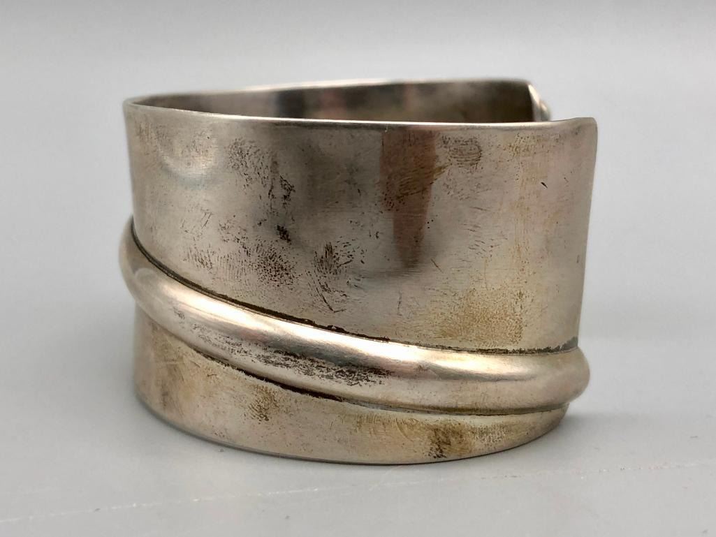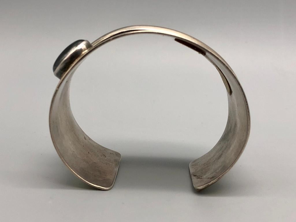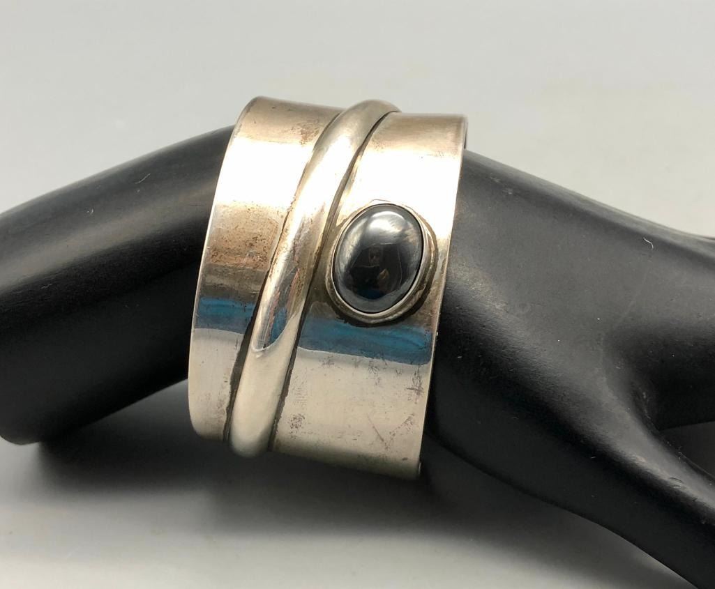 For sale in this lot is an eye-catching sterling silver and hematite bracelet. This is a sleek, contemporary style bracelet that has a wide cuff with raised, offset silverwork across it. It is accented with a lovely hematite cabochon, offset to the side of the cuff. It is stamped as sterling silver. MAKER: Hallmarked M. Antia (etched). APPROX AGE: Circa 1970s. SIZE: Inside circumference measures 5-7/8 inches long. Opening is an additional 1 inch, fitting a 6-7/8 inch wrist. Width is 1-1/4 inches. Weighs 66.3 grams. CONDITION: Good for its age, normal wear expected. Please look closely at the pictures as they are an important part of our description and are hereby incorporated into the description, specifically with regards to condition. SHIPPING: There will be a $5 handling / packaging fee for shipping this lot. The actual cost of postage will be added on top of that. BUY IT NOW: If you would like to buy this item now, without waiting for the auction day to bid on it, we do offer this option (which is available up to 48 hours before the actual auction starts). The “Buy it Now†price is the high estimate of this lot (plus applicable fees and the Buyer's premium is discounted to 10% when using the Buy it Now option). If you would like to exercise this option, you must contact us by email (or phone as long as you talk to someone live). Reference this lot number and your intention to "Buy it Now."