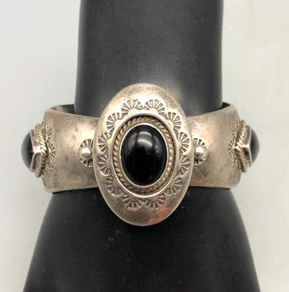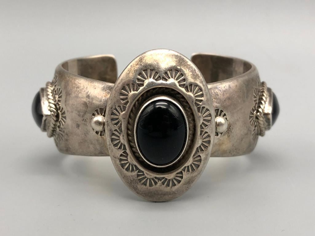 Offered for sale in this lot is a unique sterling silver and onyx bracelet. This lovely bracelet has an interesting tapered cuff, with a raised shadow box bezel. It has three onyx stone settings, accented with hand stamped designs. It has a nice sturdy feel to it and is stamped sterling. MAKER: Hallmarked KCS Navajo Handmade. APPROX AGE: Vintage. SIZE: Inside circumference measures 5-1/4 inches long. Opening is an additional 1 inch, fitting a 6-1/4 inch wrist. Width is 1-5/8 inches. Weighs 69.3 grams. CONDITION: Good for its age, normal wear expected. Please look closely at the pictures as they are an important part of our description and are hereby incorporated into the description, specifically with regards to condition. SHIPPING: There will be a $5 handling / packaging fee for shipping this lot. The actual cost of postage will be added on top of that. BUY IT NOW: If you would like to buy this item now, without waiting for the auction day to bid on it, we do offer this option (which is available up to 48 hours before the actual auction starts). The “Buy it Now†price is the high estimate of this lot (plus applicable fees and the Buyer's premium is discounted to 10% when using the Buy it Now option). If you would like to exercise this option, you must contact us by email (or phone as long as you talk to someone live). Reference this lot number and your intention to "Buy it Now."