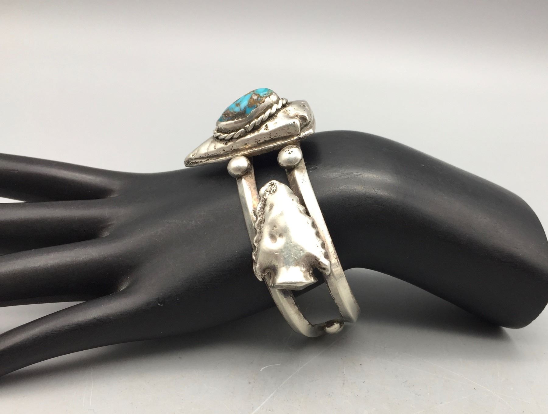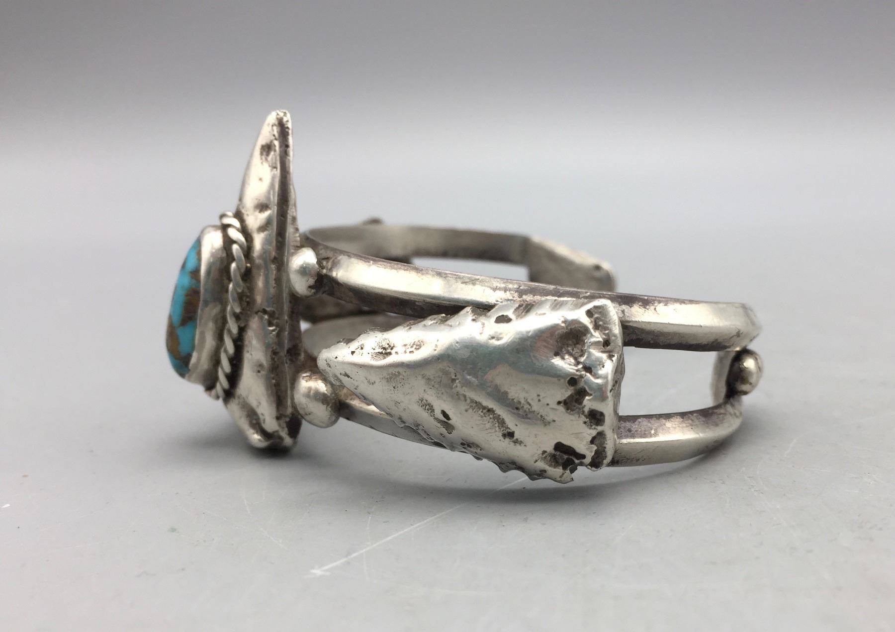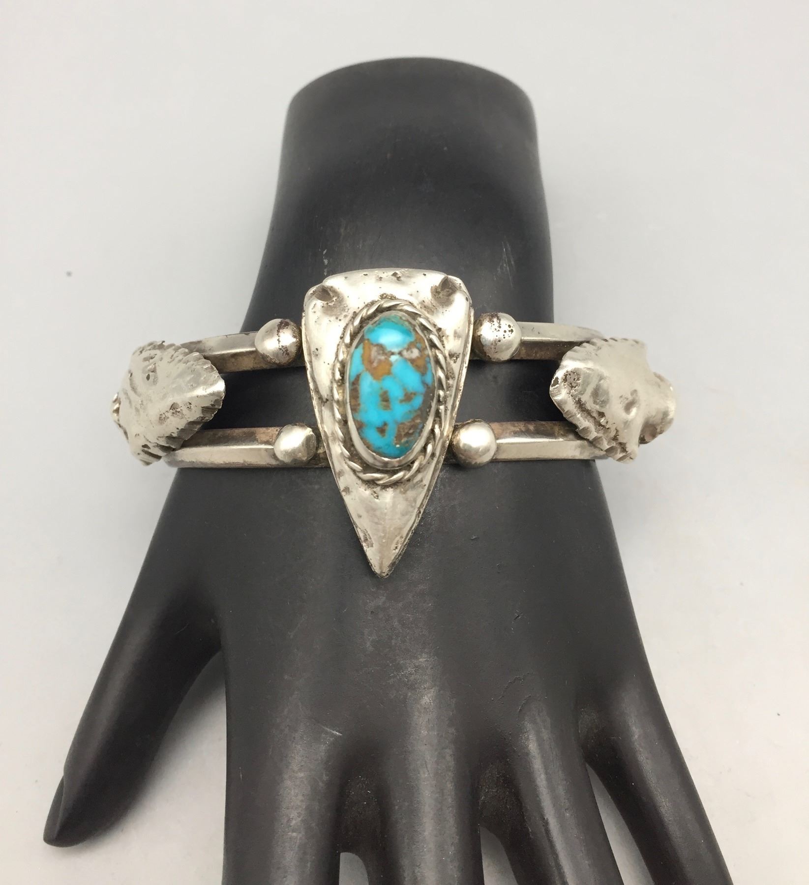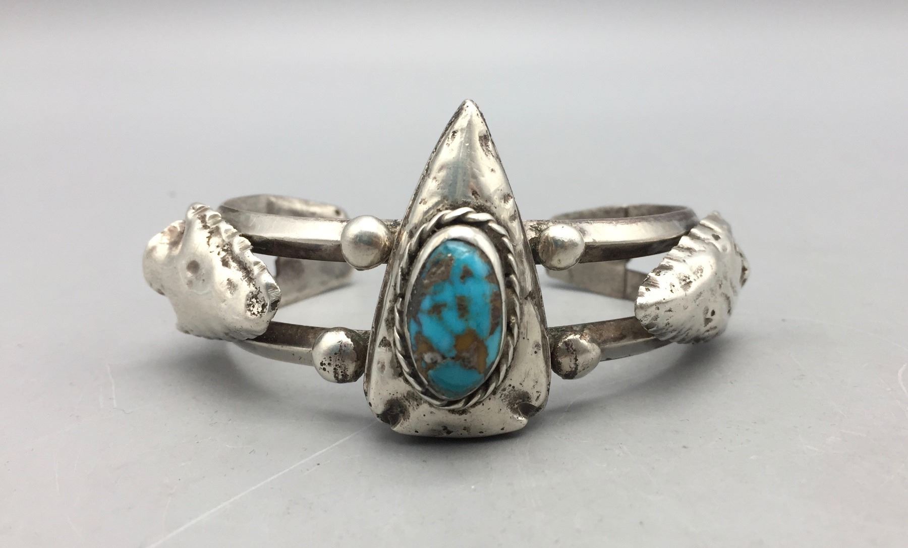 Description: For sale in this lot is an extremely unique “arrowhead” bracelet with a nice turquoise cabochon surrounded by a sterling silver rope detail. Tested as sterling silver. Maker: No hallmark. Approx. Age: Vintage. Size: Measures 6” with a 1-1/4” opening, (fits a 7-1/4” wrist). Weighs 99.2 grams. Condition: Good for its age, normal wear expected. Please look closely at the pictures - they are an important part of our description. Shipping: There will be a $5 handling / packaging fee for shipping this lot. The actual cost of postage will be added on top of that.