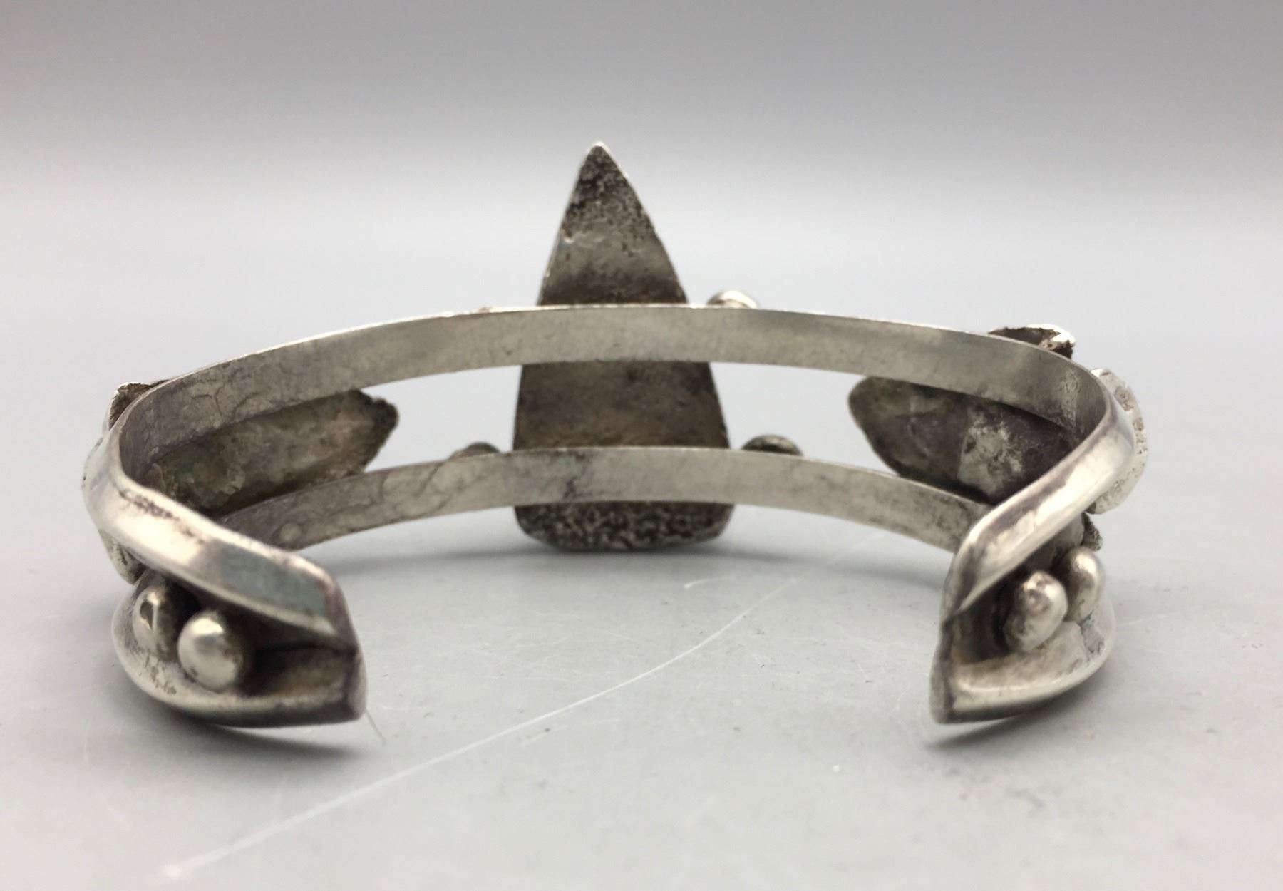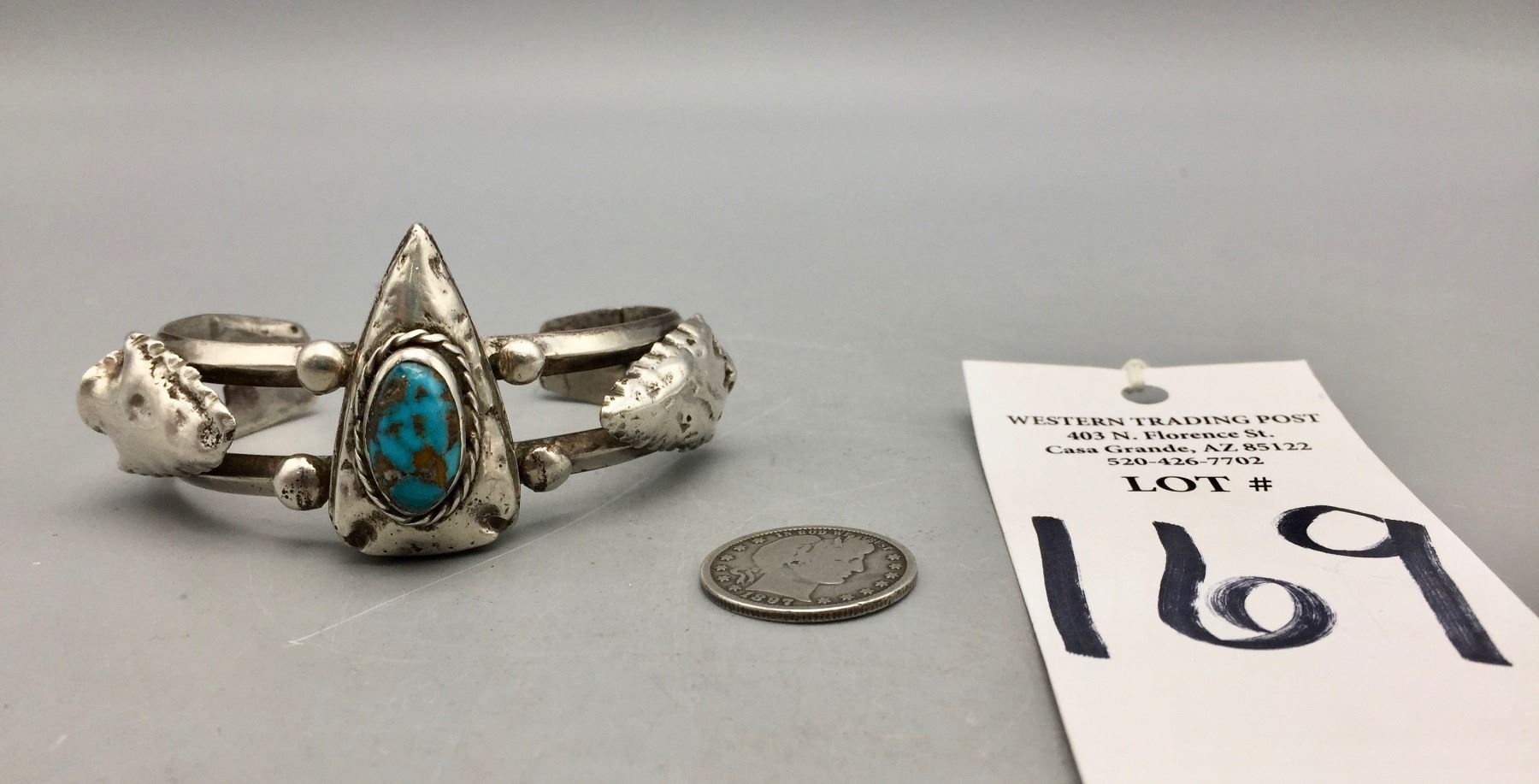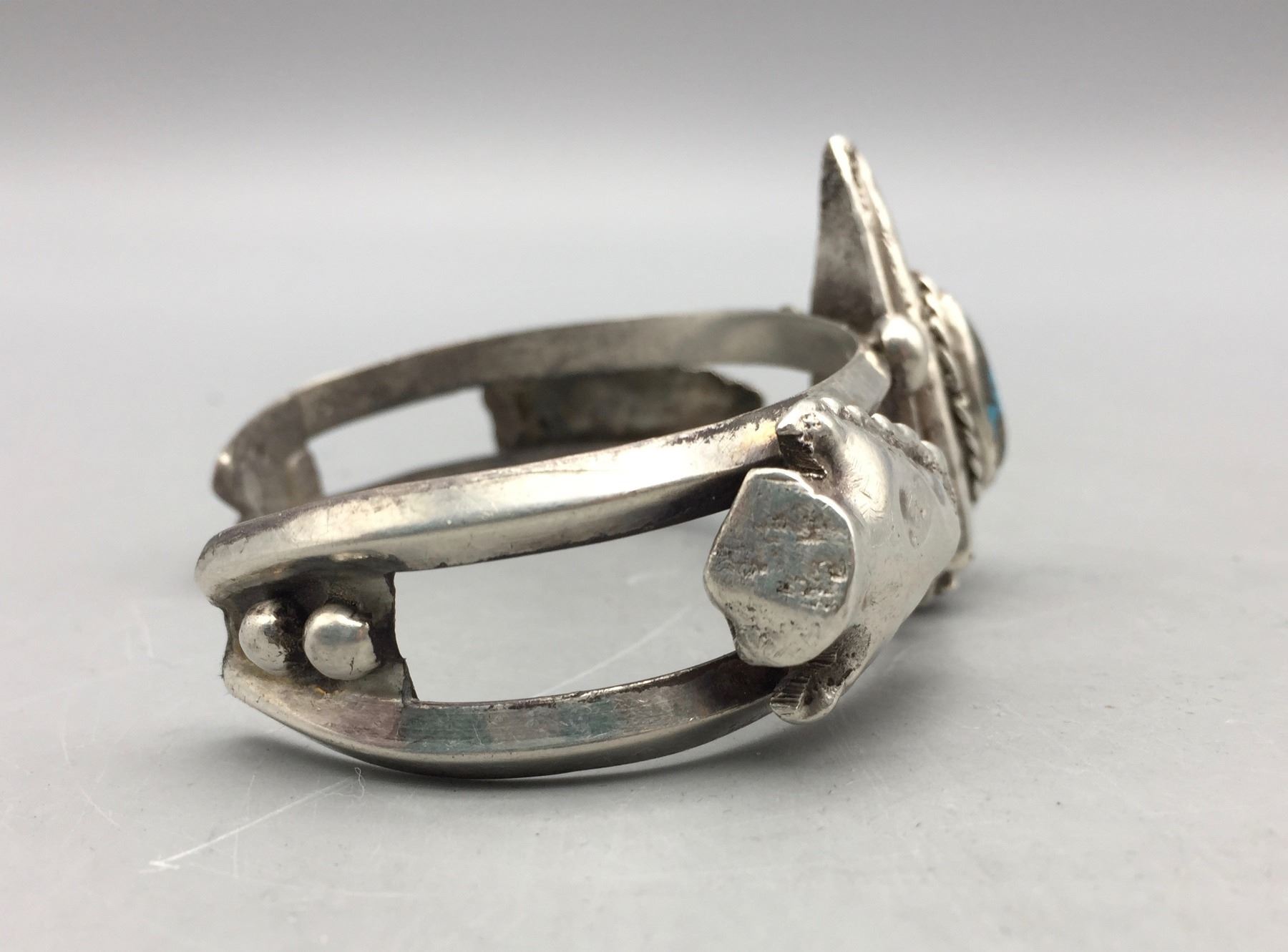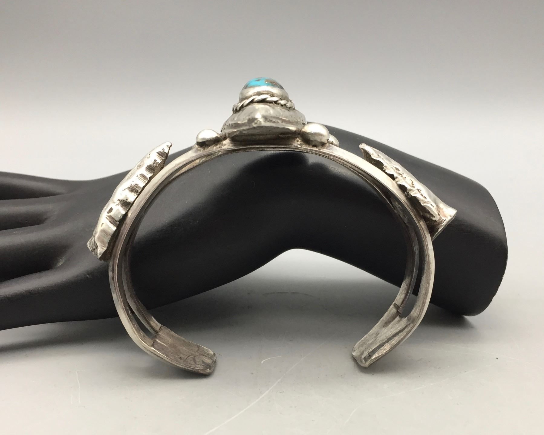 Description: For sale in this lot is an extremely unique “arrowhead” bracelet with a nice turquoise cabochon surrounded by a sterling silver rope detail. Tested as sterling silver. Maker: No hallmark. Approx. Age: Vintage. Size: Measures 6” with a 1-1/4” opening, (fits a 7-1/4” wrist). Weighs 99.2 grams. Condition: Good for its age, normal wear expected. Please look closely at the pictures - they are an important part of our description. Shipping: There will be a $5 handling / packaging fee for shipping this lot. The actual cost of postage will be added on top of that.