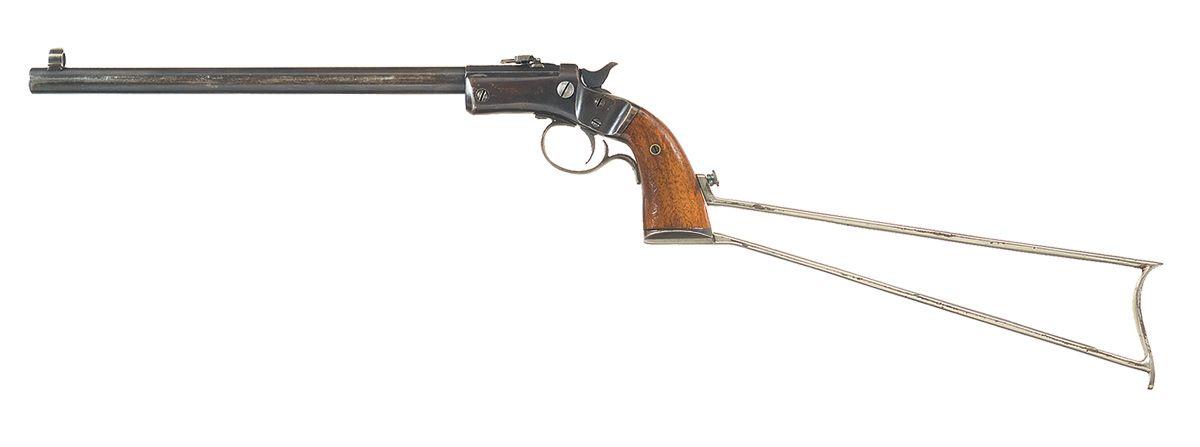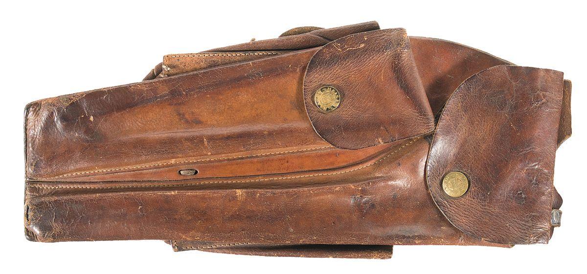 Made 1896-1916. Globe and ladder sights, with standard markings and smooth grips. With a nickel plated shoulder stock, leather Heiser marked bicycle holster.