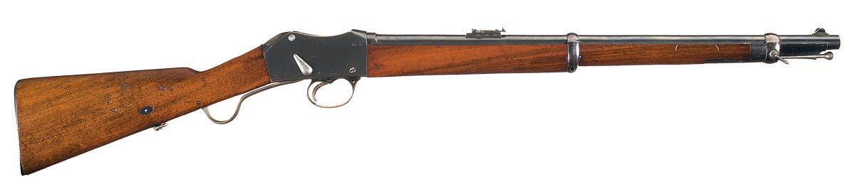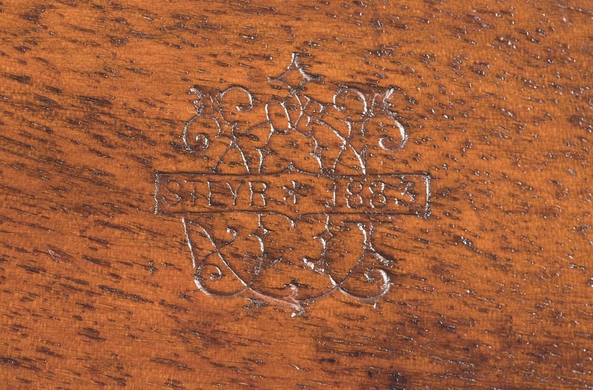 The left side of the receiver is marked "STEYR * 1883", the upper front right side of the receiver and right rear of the barrel are marked "44" and crossed pennants over "2P" and the serial number is marked on the bottom of the receiver directly ahead of the trigger guard. The carbine is chambered for an unidentified 44 bottleneck cartridge, (writer has spent time in an attempt to identify the cartridge to no avail). Shrouded front sight and folding leaf rear sight graduated to 1,000 meters. Saddle ring and bar mounted on the left side of the receiver. Casehardened lever and blue remaining parts. Mounted with a straight grip stock and matching full forearm with a sling swivel on the front barrel band, flat iron buttplate and sling swivel. The left side of the stock has a "STEYR * 1883" cartouche.