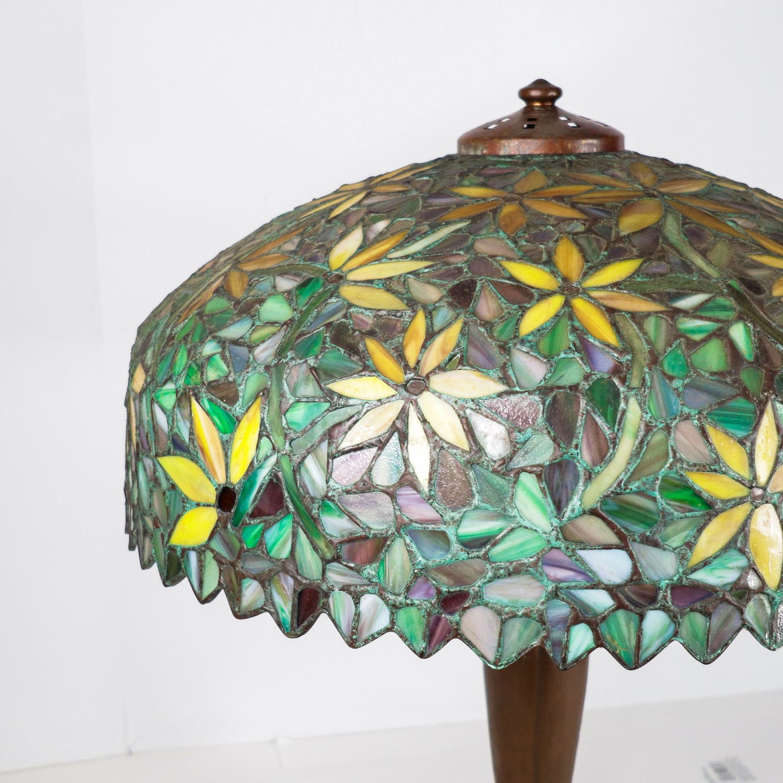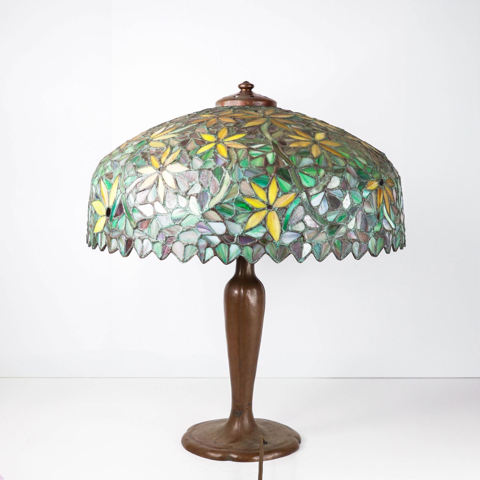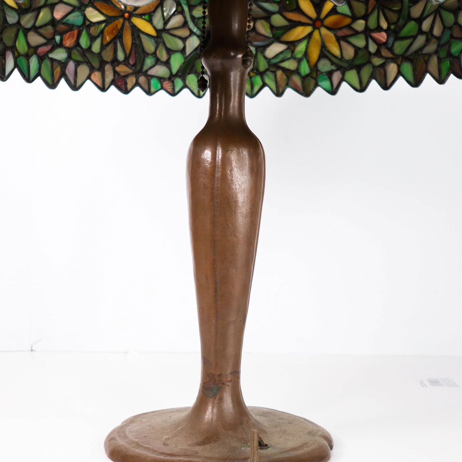18" diameter Unique Studios leaded floral lamp with irregular border. Fantastic color and detail. Set on an original Handel base having two acorn pulls. 23" high